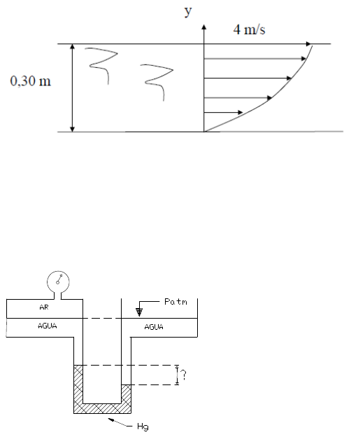 LISTA MECANICA DOS FLUIDOS/FETRANS Obs: Vv=Q=Vazão Volumétrica Sabendo-se que a figura a seguir é a representação de uma parábola que apresenta o vértice para y = 30 cm, pede-se: a)A equação que representa a função v = f(v) b)A equação que representa a função do gradiente de velocidade em relação ao y c)A tensão de cisalhamento para y = 0,1; 0,2 e 0,3 m. 2) O manovacuômetro metálico da figura assinala uma pressão de -508 mm Hg. Sabendo-se que as superfícies d’águ nos reservatórios encontram-se a mesma cota, calcular o desnível que apresenta o mercúrio no manômetro diferencial.R= 54,8 cm 3) Na figura abaixo, o tubo A contém óleo (d = 0,80) e o tubo B, água. Calcular as pressões em A e em B.R: PA = 3840 ;PB = -5 860 Kgf/m2 4) A figura abaixo apresenta esquematicamente um manômetro diferencial. Pede-se a diferença de pressões entre os pontos A e B em Pascal, conhecendo-se os seguintes dados de densidades e alturas:dl = d5 = 1 d2 = 13,6 d3 = 0,8 d4 = 1,2;z1 = 1.0 m z2 = 2.0 m z3 = 2.5 m z4 = 5.0 m z5 = 6.0 m R ) 355,122 KPa 5) A Água escoa em regime permanente no duto de seção circular mostrado na figura abaixo. Sabendo que o fluxo de massa é de 50 Kg/s, calcule a vazão em volume do escoamento e as velocidades médias nas seções 1 e 2. 6) Calcular a vazão (m3/s) e as pressões manométrica e absoluta no ponto B (em Pascal) para o escoamento a partir do tanque fechado através da tubulação de 4 cm de diâmetro, sabendo que o fluido em escoamento é a água. 7) Calcular a velocidade na saída canalização ilustrada abaixo, sabendo que a pressão manométrica no ponto 1 é 1 atm. 8) Determinar a vazão na tubulação por onde escoa água, através das informações obtidas a partir do tubo venturi. Dados:dHg = 13,6; h = 30 cm. Dados: diametroA = 8cm;diametroB = 5cm, deflexão do manômetro (h) = 0,3m. 9) Água flui de um tanque através de um tubo de 0,05 m de diâmetro. Determine a Velocidade no tubo e a vazão de descarga.Dados: deflexão do manômetro (h) = 0,15m 10) Um grande reservatório de óleo tem um tubo de 7,6cm e 2128m de comprimento a ele conectado, como mostrado na figura a seguir. A superfície livre do reservatório está a 3m acima da linha do centro do tubo e pode ser considerada fixa nesta elevação. Admitindo escoamento laminar, calcule a velocidade média de escoamento e, posteriormente, verifique o Número de Reynolds. Dado: ν oleo = 9,2.10-6m2/s 11) Um tubo liso de 6,35 cm de diâmetro e 152 m de comprimento, transporta 9,46 L/s de água,desde uma linha principal onde a pressão é igual 7,0 Kgf/cm2 até o topo de um edifício que está a 26 m acima da linha principal. Qual a pressão existente no tubo no topo do edifício?Dados:ν agua = 1,32.10-6m2/s; ρagua = 103 kg/m3. Resp: P2 = 238383 Pa. 12) Um cilindro de 40 cm de altura está parcialmente imerso em óleo (0,90 g/cm3). A parte do cilindro que está fora do óleo, tem 10 cmde altura. Calcule a massa específica de que é feito o cilindro. Resp; 0,675 g/cm3 13) A viscosidade dinâmica de um óleo é de 5 . 10-4 kgf.s/m2 e o peso específico relativo é de 0,82.Determinar a viscosidade cinemática.Considerar g= 10m/s2 e peso especifico da água = 1000kgf/m3. E transformar a unidade m2/s em St. Resp: 6,1 .10-6 m2/s, 6,1 .10-2cm2/s ou St 14) Determinar o número de Reynolds para o escoamento de 140 l/s de óleo, = 0,00001 m2/s, num tubo de ferro fundido de 200 mm de diâmetro. Resp:Re=8909,9 turbulento 15) A vazão de 1,44 m3/s de água ocorre em uma instalação (Fig.1), contendo uma bomba fornece 400 CV de energia à corrente líquida. São dados: A1 = 0,36 m2 , A2 = 0,18 m2 , z1 = 9,15 m , z2 = 24,4 m, e .Resp:Hp1,2 = 10.18m Obs:M.C.A =METROS COLUNA D’ÁGUA (2) BOMBA z1 z2 (1) V1 V2 Plano de referência ( Fig.1 ) Calcular a perda de carga entre as seções (1) e (2) Resp. hF 10,18 m 16) Água escoa através da turbina na Figura 2. A turbina produz a potência de 65 HP. As pressões em A e B são 1,4 kgf/cm2 e –0,34 Kgf/cm2, respectivamente. Qual é a vazão volumétrica d’água ?. Desprezar a perda de carga devida ao atrito. Resp.: Vv=0,260 m3/s Dado: . TURBINA 65 HP A B REF ( 0,0 ) D = 0,3 m D = 0,6 m Figura 2. Resp.: 0,260 m3/s 17) Dados: Hp2-3 = 2 m; A3 = 20 cm²; A2 = 1 cm²; Hp0-1 = 0,8 m; rendimento da bomba igual a 70%. Determinar:a) a vazão (L/s);b) a área da seção (1) (cm²);c) a potência fornecida pela bomba ao fluido 18) Na instalação mostrada na figura, a bomba possui potência de 5cv e rendimento de 75%, considere que o fluido é água, determine: a) A velocidade do escoamento na tubulação de sucção.Resp: v= 1,33m/s b) A pressão em (2) na entrada da bomba. Resp: P= -20,9kpa c) A pressão em (3) na saída da bomba. Resp: P= 157,6kPa d) A altura Z4 da caixa d’água. Resp: 17,96m Dados: peso especificoH2O = 10000N/m³, g = 10m/s², d1 = d2 = 12cm, d3 = d4 = 8cm, QV = 15 litros/s. 19) Na instalação da figura, a máquina é uma bomba e o fluido é água. A bomba tem uma potência de 7kW e seu rendimento é 70%. A água é descarregada com uma velocidade de 5m/s pela saída (2) com área de 12cm². Determine a perda de carga do fluido entre (1) e (2) e calcule a potência dissipada ao longo da instalação. Dados: peso especificoH2O = 10000N/m³, g = 10m/s². Resp: v= Hp1,2=3,75m....Lembrando que,HB=81,67 E Hp = 85,42m, a perda de carga efetiva Hp1,2 é a diferença. 20) Para a instalação mostrada na figura a seguir calcule: a) A velocidade na tubulação de sucção. Resp: v= 3,9m/s b) A pressão na saída da bomba. Resp: P= 143,82kPa c) A vazão nas tubulações (4) e (5). Resp: Vv= 6,18 l/s e Vv5=8,82 l/s d) A velocidade nas tubulações (4) e (5). Resp: v= 3,15m/s e v5=3,11m/s Dados: peso especifico H2O = 10000N/m³, g = 10m/s², Qv2 = 15 litros/s, Qv4 = 0,7Qv5, Qv4+Qv5=15 litros/s, d1 = d2 = 7cm, d3 = d4 = 5cm, d5 = 6cm, NB = 6cv, rendimentoB = 70%.