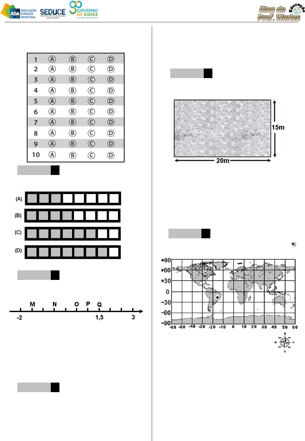 �� 1ª Prova Diagnóstica – 2012 – 8º Ano SEDUC-GO – Matemática � ESCOLA: ________________________ Prof.:____________________________ Nome: ___________________________ D21 Questão 1 ––––––––––––––––––––––––––◊ Em qual das figuras abaixo, a parte colorida da barra representa 3/4 do total? D16 Questão 2 ––––––––––––––––––––––––––◊ Na reta a seguir estão localizados os pontos M, N, O, P e Q. O Ponto que corresponde a –1,5 é (A) Q (B) N (C) M (D) O D28 Questão 3 ––––––––––––––––––––––––––◊ Sabe-se que a gasolina brasileira tem uma tolerância máxima de 25% de álcool em seu composto. Qual quantidade máxima de litros de álcool pode ser encontrada num tanque com 50 litros de gasolina? (A) 12,5 (B) 15,5 (C) 20,5 (D) 25,5 D12 Questão 4 ––––––––––––––––––––––––––◊ O senhor Paulo César tem um terreno retangular conforme figura a seguir: A medida do perímetro desse terreno é (A) 30 m. (B) 35 m. (C) 70 m. (D) 300 m. D1 Questão 5 ––––––––––––––––––––––––––◊ Observe que a figura a seguir mostra o ponto () sobre o Brasil. Dessa forma é correto afirmar que (A) O ponto está no quadrante dos números norte. (B) O ponto está no quadrante dos números negativos. (C) O ponto está no quadrante dos números positivos e negativos. (D) O ponto está no quadrante dos números positivos. D5 Questão 6 ––––––––––––––––––––––––––◊ Na malha quadriculada a seguir, todos os quadradinhos têm o mesmo tamanho e a parte colorida de cinza representa o Jardim da casa do Inácio. Nessa área, Inácio quer construir uma quadra de esporte com o dobro das dimensões desse jardim. A quantidade de quadradinhos que ele utilizará para representar essa quadra é de (A) 32 (B) 64 (C) 128 (D) 256 D3 Questão 7 ––––––––––––––––––––––––––◊ Alex construiu um triângulo. Dois dos seus lados medem 12 cm e 7 cm. A medida do comprimento do terceiro lado para completar o triângulo é (A) 1 (B) 3 (C) 4 (D) 6 D22 Questão 8 ––––––––––––––––––––––––––◊ Alex é pedreiro e foi contratado para construir 25 casas. Ele já construiu 12 das casas. A fração que representa o número de casas que ainda faltam para ser construída é (A) (B) (C) (D) D18 Questão 9 ––––––––––––––––––––––––––◊ Pedro fez os cálculos da seguinte expressão: – 1 + (– 2 + 5) + [– 4 + (– 6 + 5 – 8)] O resultado correto encontrado por Pedro da expressão dada é (A) – 9 (B) + 9 (C) – 11 (D) + 11 D20 Questão 10 ––––––––––––––––––––––––◊ Na soma e subtração de números inteiros existem algumas curiosidades. Observe os exemplos a seguir: 3 + (– 4) = – 1; – 2 + (– 1) = – 3 Sobre esses fatos, o valor que devo subtrair de – 3 para que o resultado seja – 11 é (A) + 8 (B) – 8 (C) +14 (D) – 14 � PAGE �2� _1396286613.unknown _1396286628.unknown _1396286640.unknown _1396286596.unknown