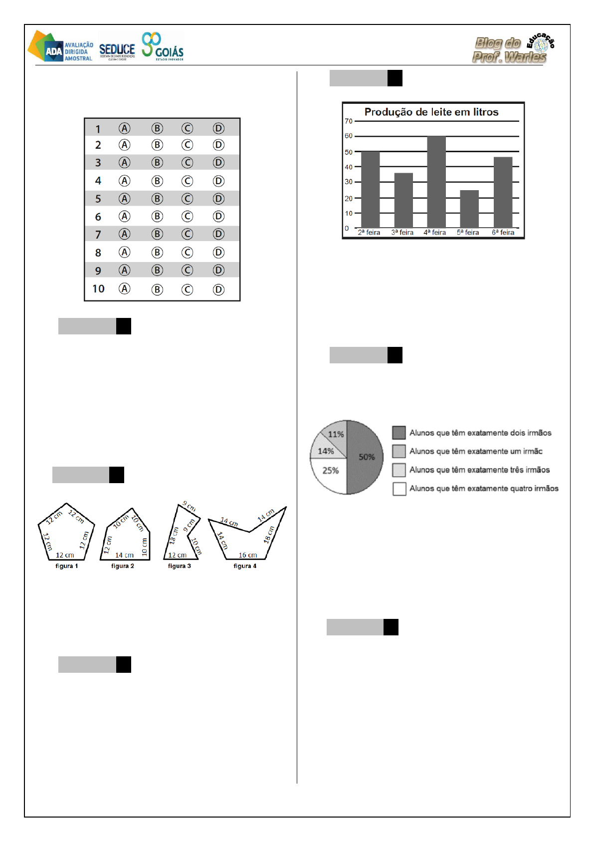 1ª Prova Diagnóstica – 2017 – 6º Ano SEDUCE-GO – Matemática ESCOLA: ________________________ Prof.:____________________________ Nome: ___________________________ D19 Questão 1 –––––––––––––––––––––––––––◊ No 6º ano do ensino fundamental de uma escola, há seis classes com 46 estudantes em cada uma. O número de estudantes, dessa escola, matriculados no 6º ano é igual a (A) 47. (B) 57. (C) 246. (D) 276. D8 Questão 2 ––––––––––––––––––––––––––––◊ Observe as figuras a seguir: O polígono regular é representado pela figura (A) 1. (B) 2. (C) 3. (D) 4. D19 Questão 3 –––––––––––––––––––––––––––◊ Roberto serviu, igualmente, 2 480 mL de refrige- rante para 8 pessoas. Assinale a alternativa que indica a quantidade total, em mL, de refrigerante que cada um recebeu. (A) 240 (B) 248 (C) 310 (D) 348 D36 Questão 4 –––––––––––––––––––––––––––◊ Observe o gráfico a seguir: A menor produção de leite foi, aproximadamente, igual a (A) 10 litros. (B) 15 litros. (C) 20 litros. (D) 25 litros. D36 Questão 5 –––––––––––––––––––––––––––◊ Na sala em que Lúcia estuda foi feito uma pesquisa sobre a quantidade de irmãos que cada estudante tem. Veja a representação do resultado da pesquisa no gráfico a seguir: Observando o gráfico nota-se que a maior parte dos estudantes possui, exatamente, (A) quatro irmãos. (B) três irmãos. (C) dois irmãos. (D) um irmão. D8 Questão 6 –––––––––––––––––––––––––––◊ Carlos desenhou um polígono que possui dois ângulos de 60° e dois de 120° e quatro segmentos congruentes. O polígono que Carlos desenhou é um (A) losango. (B) triângulo. (C) retângulo. (D) trapézio. D36 Questão 7 –––––––––––––––––––––––––––◊ A professora Bernadete fez uma pesquisa com os alunos do 6º ano com o seguinte tema: qual seu lazer preferido? Ela obteve o seguinte resultado: Passear com a família: 6 votos. Ler revistas e gibis: 4 votos. Jogar vídeo game: 8 votos. Praticar esportes: 11 votos. Assistir TV: 3 votos. O gráfico que representa, corretamente, esses dados coletados pela professora Bernadete é D8 Questão 8 –––––––––––––––––––––––––––◊ Na geometria plana, todo polígono regular possui (A) apenas quatro lados com medidas diferentes e ângulos diferentes. (B) apenas quatro lados com mesma medida e ângulos diferentes. (C) todos os lados com medidas diferentes e ângulos iguais. (D) todos os lados iguais e ângulos congruentes. D36 Questão 9 –––––––––––––––––––––––––––◊ O dono de uma academia fez uma pesquisa para saber qual o horário mais frequentado pelos clientes. Foram entrevistadas 100 pessoas e o resultado está no gráfico a seguir. O número de pessoas que frequentam a academia entre 12h e 20h é igual a (A) 17. (B) 25. (C) 42. (D) 49. D19 Questão 10 –––––––––––––––––––––––––◊ Numa gincana escolar, o desafio consistia em formar a equipe com três estudantes com menor peso. Observe as equipes que foram formadas: A equipe vencedora foi a (A) equipe 1 com 2 kg a menos que a equipe 2. (B) equipe 2 com 2 kg a menos que a equipe 1. (C) equipe 1 com 4 kg a menos que a equipe 2. (D) equipe 2 com 4 kg a menos que a equipe 1. 1