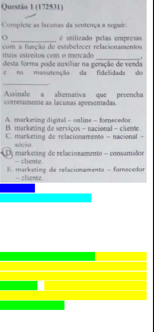 LETRA D PAG 140 LIVRO DIGITAL As pessoas gostam de se sentir especiais, valorizadas e próximas daquilo que gostam e desejam. Isso pode ser estabelecido em um relacionamento íntimo entre empresas e/ou produtos e serviços com consumidores. O marketing de relacionamento é utilizado pelas empresas com a função de estabelecer relacionamentos mais estreitos com o mercado consumidor, desta forma pode auxiliar na geração de venda e na manutenção da fidelidade do cliente. LETRA E PAG 31 e 32 LIVRO DIGITAL A visão baseada em recursos, ou VBR permite que a empresa determine suas estratégias tendo como base os recursos as competências internas. Desse modo, passa a assumir suas vantagens competitivas frente aos seus concorrentes. Os recursos referem-se a todos os elementos que a organização possui, tais como matéria- prima para produzir, instalações físicas e capital financeiro, ou seja, são fontes de solução para as áreas da empresa. O autor Wernerfelt (1984) define como recursos todos os ativos tangíveis e intangíveis: máquinas, marcas, conhecimento em tecnologia, habilidades pessoais empregadas, procedimentos eficientesetc. Já as competências dizem respeito à capacidadede resolver qualquer assunto, de acordo com Fleury e Fleury (2001) que explicam que o conceito de competência é pensado uma junção de conhecimentos, habilidades e atitudes (isto é, conjunto de capacidades humanas) que justificam um alto desempenho, acreditando-se que os melhores resultados estão fundamentados na inteligência e na personalidade das pessoas. LETRA E PAG 106 LIVRO DIGITAL Como qualquer outra ferramenta utilizada na gestão, o Sistema de Informação de Marketing precisa ser adaptado às necessidades, à estrutura e à disponibilidade da organização (MALHOTRA, 2011). Sendo bem desenvolvido e utilizado, ele traz algumas vantagens importantes, tais como: municiar a organização de informações relevantes em um tempo pré-acordado e, assim, terá sua performance melhorada; recupera e aglutina informações que podem estar pulverizadas e até mesmo perdidas; seleciona informações e as direciona para gestores específicos; auxilia na eficiência das análises mercadológicas; assessora na segmentação de mercado; funciona como um timer que avisa sobre falha no processo de distribuição da informação; aumenta o nível de profissionalismo da empresa; enxuga informações sem modificá- las; permite um conhecimento rápido da dinâmica do mercado em questão e, por último, entre os mais importantes, é uma ferramenta de monitoramento do planejamento de mercado realizado. LETRA C PAG 77 LIVRO DIGITAL LETRA E PAG 15 LIVRO DIGITAL Os pontos fortes e fracos referem-se a tudo aquilo que a empresa possui de bom e o que ela precisa melhorar, respectivamente. Alguns fatores a serem analisados são: marketing, reputação da empresa, market share, qualidade do produto, eficiência de preço e distribuição, estratégia de promoção, inovação, análises financeiras. Oportunidades e ameaças existem fora da empresa, independentemente de forças e fraquezas. Elas ocorrem tipicamente dentro dos ambientes competitivo, do consumidor, econômico, político/legal, tecnológico e/ou sociocultural (FERRELL; HARTLINE, 2009). LETRA C PAG 15 LIVRO DIGITAL Os pontos fortes e fracos referem-se a tudo aquilo que a empresa possui de bom e o que ela precisa melhorar, respectivamente. Alguns fatores a serem analisados são: marketing, reputação da empresa, market share, qualidade do produto, eficiência de preço e distribuição, estratégia de promoção, inovação, análises financeiras. Oportunidades e ameaças existem fora da empresa, independentemente de forças e fraquezas. Elas ocorrem tipicamente dentro dos ambientes competitivo, do consumidor, econômico, político/legal, tecnológico e/ou sociocultural (FERRELL; HARTLINE, 2009). LETRA D PAG 117 e 118 LIVRO DIGITAL Pesquisa qualitativa É uma investigação mais profunda a respeito de determinada situação ou problema, que possibilita entender melhor questões específicas, desta forma trabalha com amostras menores que possibilitam entendimento maior. Pesquisa quantitativa Como o próprio nome diz, é um tipo de pesquisa que objetiva quantificar dados. A partir dela, é possível tirar conclusões mais objetivas, baseadas em dados e análises estatísticas. Normalmente as amostras são maiores e referenciadas ou representativas, para isto usamos o levantamento de campo, com amostras maiores e informações menos profundas e até mesmo o estudo de campo, feito com amostras de tamanho mediano e com informações de média profundidade. O que mais vemos para a coleta de dados, neste caso, é a utilização de questionários mais estruturados, obtendo desta forma respostas mais diretas. LETRA D PAG 187 LIVRO DIGITAL Ticket médio É considerado um dos indicadores de mais fácil obtenção e muito utilizado para empresas entenderem seu nível de eficácia, principalmente quando têm um alto índice de diversificação de produtos. Além disso, é um indicador que ajuda a identificar e evitar possíveis prejuízos e desenvolver ações para melhorar o desempenho. Pode ser definido como valor médio de compras por cliente, o que é encontrado a partir da média entre o total de vendas e o volume de clientes que compraram. A análise do ticket médio auxilia as empresas a entender o que os clientes compram e quanto compram e assim direcionar ações promocionais, de preço, distribuição e atendimento. Além disso, auxilia na definição do tamanho e perfil do portfólio de bens e serviços. Muitas vezes, ao identificar o ticket médio, as organizações conseguem se aprofundar na análise de itens mais comprados bem como dos menos comprados, e assim podem desenvolver estratégias de manutenção de compra e comunicação dos itens menos consumidos. LETRA C PAG 66 e 67 LIVRO DIGITAL O ritual é marcado por um conjunto de comportamentos habituais, p