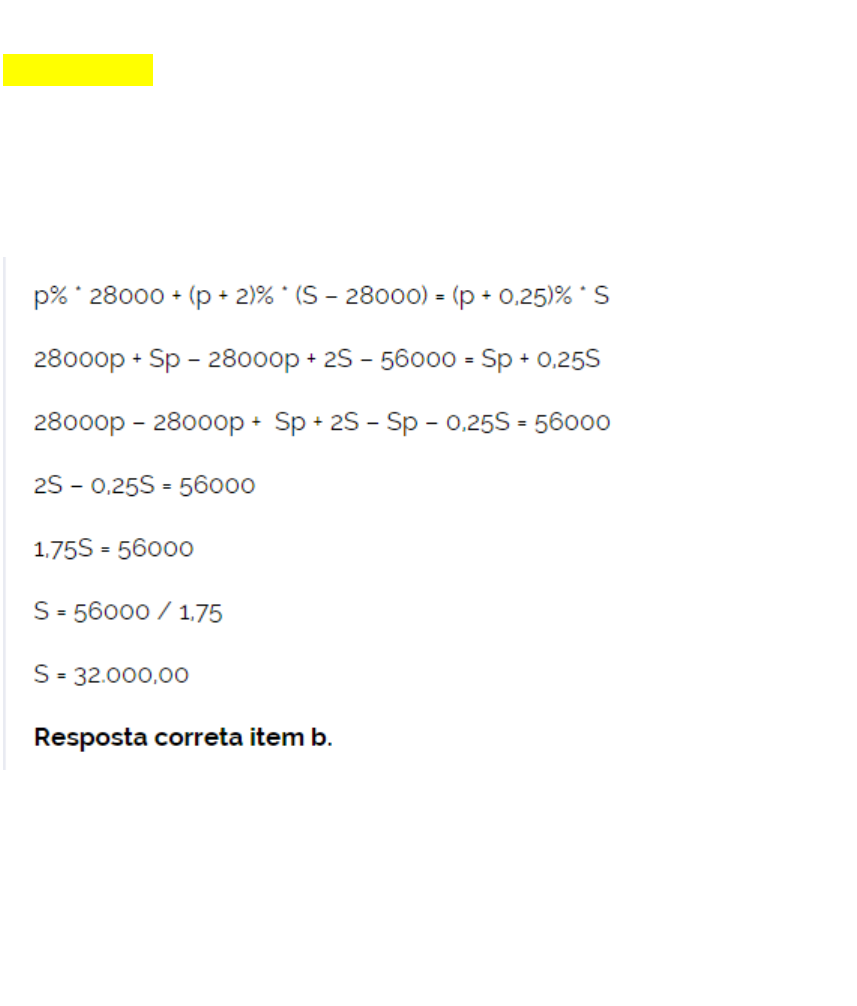 Matemática Financeira – Exercício (FGV-SP) Uma empresa desconta do salário anual de seus funcionários certa porcentagem para um plano de previdência privada. O desconto é de p% sobre R$ 28.000,00 de renda anual, mais (p + 2)% sobre o montante anual do salário que excede R$ 28.000,00. João teve desconto total de (p + 0,25)% do seu salário anual para o plano de previdência privada. O salário anual de João, em reais, sem o desconto do plano de previdência é: a) 28.000,00. b) 32.000,00. c) 35.000,00. d) 42.000,00. e) 56.000,00. (FGV–SP) 2- A caderneta de poupança teve rendimento de 0,68% e 0,54% nos meses de janeiro e fevereiro de 2009, respectivamente. Um índice de preços ao consumidor, nesses mesmos meses, foi de 0,46% e 0,27%, respectivamente. Determine ao final de fevereiro de 2009, o ganho real de uma aplicação em caderneta de poupança (ganho da poupança descontando-se a inflação medida pelo índice de preços ao consumidor) acumulado desde janeiro de 2009. Para calcularmos esse ganho real vamos utilizar a seguinte expressão matemática: Onde temos GR (ganho real), RP (renda da poupança), i (taxa de juros unitária da poupança) e I (taxa unitária da inflação). Transformando taxas percentuais em taxas unitárias 0,68% = 0,68/100 = 0,0068 0,54% = 0,54/100 = 0,0054 0,46% = 0,46/100 = 0,0046 0,27% = 0,27/100 = 0,0027 O ganho real dessa aplicação é equivalente a 0,4889% 3- Chama-se custo médio de fabricação por unidade, o custo total de fabricação dividido pela quantidade produzida. Uma fábrica de peças automotivas possui um custo fixo mensal de R$ 150.000,00 envolvendo peças e mão de obra. Para a produção de cada peça se gasta o valor de R$ 120,00. Em um determinado mês a fábrica produziu a quantia de 1.300 unidades. Determine o custo médio mensal por unidade. O custo médio mensal por unidade produzida será: 4- Uma loja possui um estoque de calças e camisas no valor total de R$ 140.000,00, sendo R$ 80,00 o valor de cada calça e R$ 50,00 o de cada camisa. Ao longo de um mês, foram vendidos 30% do número de calças e 40% do número de camisas em estoque, gerando uma receita de R$ 52.000,00. Em relação ao estoque inicial determine a diferença entre o número de calças e o de camisas. Vamos considerar x para calças e y para camisas, na montagem do seguinte sistema de equações: Resolver o sistema pelo método da Comparação x – y = 2000 – 500 = 1500 A diferença entre o número de calças e o de camisas é equivalente a 1500 peças.