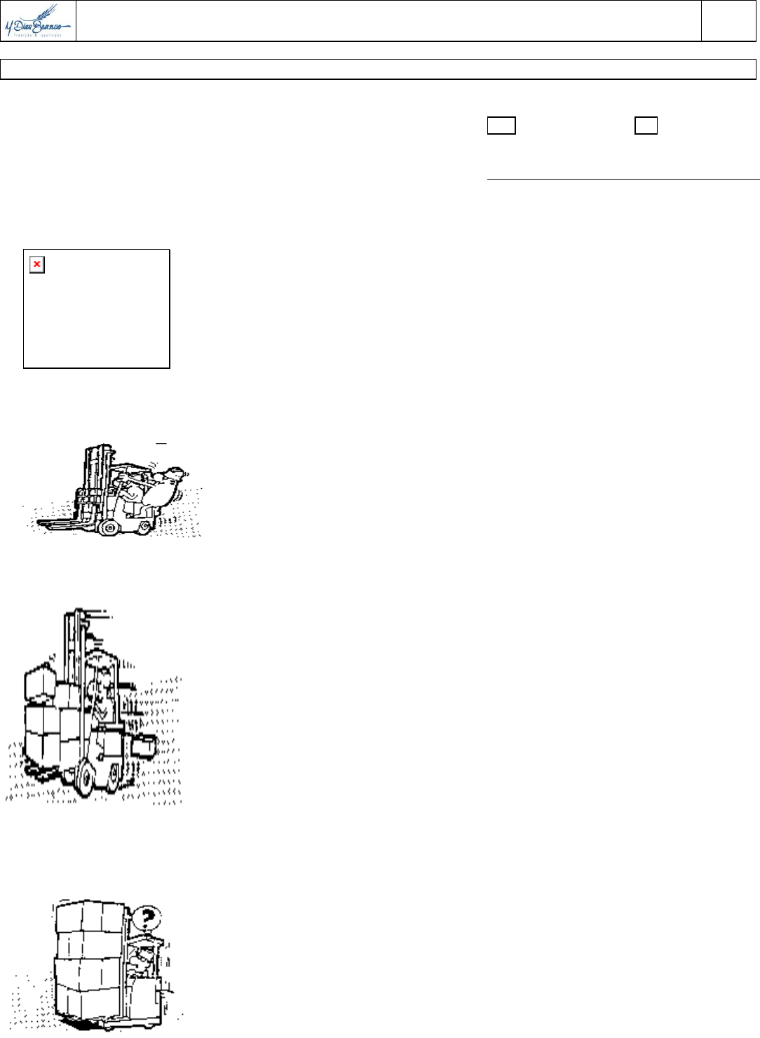 ��PROVA TEÓRICA - CURSO TÉCNICO DE OPERAÇÃO COM EMPILHADEIRAS�Página����� PAGE �1��� IDENTIFICAÇÃO E CLASSIFICAÇÃO DO COLABORADOR NA AVALIAÇÃO Nome:__________________________________ Mat:___________ Setor: ___________________________________ Valor da prova Acertos % acertos Aprovado Reprovado _________pontos _________pontos _________% Visto SESMT 01 – Para obter estabilidade na empilhadeira ao pegar uma carga, o operador deve introduzir os garfos, pelo menos até qual profundidade da base ou do cesto?: ( ) Até o final, deixando inclusive as pontas para fora do limite da base ou do cesto; ( ) Até o centro de Gravidade; ( ) Até o centro da Carga; (X) Até ¾ da base ou do cesto; ( ) Nenhuma das alternativas; 02 – Quantas pessoas podemos transportar em uma Empilhadeira? A – ( ) Uma pessoa desde que autorizada e identificada B – ( ) Duas pessoas, mas sempre com autorização e identificação, C – ( ) Tantas quantas couberem dentro da Empilhadeira D – ( X ) Somente o Operador Habilitado e Autorizado e Identificado E – ( ) Nenhuma das alternativas 03 – Qual a velocidade ideal para a condução de uma Empilhadeira? A – ( ) 10 Km/h para pisos lisos com amplo espaço e desde que não haja pessoas próximas ao trafego da Empilhadeira, B – ( ) 20 Km/h para pisos aderentes com amplo espaço e desde que não haja pessoas próximas ao trafego da Empilhadeira, C – ( ) Sempre muito devagar e observando tudo que acontece ao redor da Empilhadeira pois, não existe velocidade Segura para se conduzir uma Empilhadeira, D – ( ) 8 Km/h para pisos lisos e espaços confinados e desde que não haja pessoas próximas ao trafego da Empilhadeira, E – ( X ) Velocidade que não comprometa a Segurança de Pessoas, Máquina, Equipamentos e Matérias que estão nas proximidades por onde se trafega 04 – Como operar com a Empilhadeira quando a carga obstruir sua visibilidade? A – ( X ) Dirija de marcha ré de maneira que você possa saber o que está fazendo. Será melhor ainda se um companheiro puder guia-lo B – ( ) Dirija de marcha à frente, muito devagar e de maneira que você possa saber o que está fazendo. Será melhor ainda se um companheiro puder guia-lo C – ( ) Mantenha os olhos bem abertos enquanto estiver dirigindo a Empilhadeira. Sempre olhe para onde você está indo. D – ( ) Observe os espelhos de tráfego, a sinalização, pare completamente a Empilhadeira, acione a buzina e prossiga com bastante cautela. E – ( ) Cuidado ao dirigir próximo a pessoas ou qualquer outro objeto fixo. Sempre mantenha os garfos baixos. 05 – Quanto aos tipos de combustível, qual a empilhadeira mais indicada para operações em ambientes fechados? ( ) Gasolina ( ) Óleo Diesel ( ) Gás ( X ) Elétrica ( ) Metanol 06 – Extra oficialmente, qual única possibilidade de se permitir à elevação de pessoas sobre os garfos de uma Empilhadeira? A – ( ) Quando for preciso a troca de uma lâmpada em local alto e de difícil acesso, B – ( ) Na necessidade de se reparar em fiações e tubulações em locais altos e de difícil acesso, C – ( ) Sobre uma base de madeira e com o uso do Cinto de Segurança atado à torre da Empilhadeira e com Liberação Escrita do Depto de Segurança do Trabalho D – ( X ) Somente dentro de um Cesto Aramado, fixado sobre a Lança da Empilhadeira, com o uso do Cinto de Segurança fixado no Cesto e com Liberação Escrita do Depto de Segurança do Trabalho (PTR), E – ( ) Sempre que for necessário qualquer serviço em alturas. 07 – A Estabilidade Lateral da Empilhadeira fica comprometida quando curva. Dessa forma podemos afirmar que o comprometimento da Estabilidade Lateral da Empilhadeira se deve ao deslocamento Lateral do Centro de Gravidade da Carga em relação aos limites laterais da Base de Apoio da Empilhadeira? ( X ) Sim com conseqüente tombamento da Empilhadeira se os limites laterais da Base de Apoio da Empilhadeira forem ultrapassados pelo eixo do Centro de Gravidade da Carga, ( ) Sim, porém a Empilhadeira não tomba, pois a Carga transportada tende a escorregar e cair da Base dos Garfos, ( ) Não, pois o tombamento da Empilhadeira não está relacionado com os limites laterais da Base de Apoio da Empilhadeira, ( ) Não, pois a estabilidade da Empilhadeira não tem relação com o deslocamento do Centro de Gravidade da Carga, ( ) Sim, mas a Empilhadeira não tomba mesmo que os limites laterais da Base de Apoio da Empilhadeira sejam ultrapassados pelo eixo do Centro de Gravidade da Carga, 08 – Assinale a alternativa correta. ( ) Só permitir a operação de seus colegas de trabalho na empilhadeira em áreas internas. ( X ) Não usar o local de troca de baterias como área de descanso. ( ) Realizar a troca de bateria das empilhadeiras elétricas sozinho. ( ) Ao notar que o empilhamento irá cair, abandonar imediatamente a empilhadeira ( ) Nenhuma das Alternativas 09 – Assinale “V” para verdadeiro e “F” para Falso. ( V ) Nunca trafegue com braços e pernas fora do equipamento. ( V ) Sempre andar em sentido oposto aos garfos. ( F ) Sempre levante e abaixe a carga com a empilhadeira em movimento. ( V ) Não estacionar com os garfos elevados. ( F ) A empilhadeira foi projetada para manuseio de cargas, equipamentos, pessoas, container, paletes, etc. ( F ) Pode-se empilhar uma carga mais pesada que o contrapeso. ( V ) Sempre que entrar em uma porta pare, olhe e buzina. ( V ) Não liberar a alavanca de subida e descida repentinamente. ( F ) Ao estacionar a Empilhadeira deixar a chave no contato para que possa ser usada em caso de emergência. ( V ) A eficiência e a rapidez na operação de empilhadeiras não é a mesma coisa que segurança nas operações. 10 – Porque a Empilhadeira Elétrica tem maior dificuldade de frear em relação às outras? ( ) Porque é mais pesada do que as outras ( ) Porque trabalham em locais confinados ( X ) Porque os pneus são de nylon e o piso geralmente liso ( ) Porque 