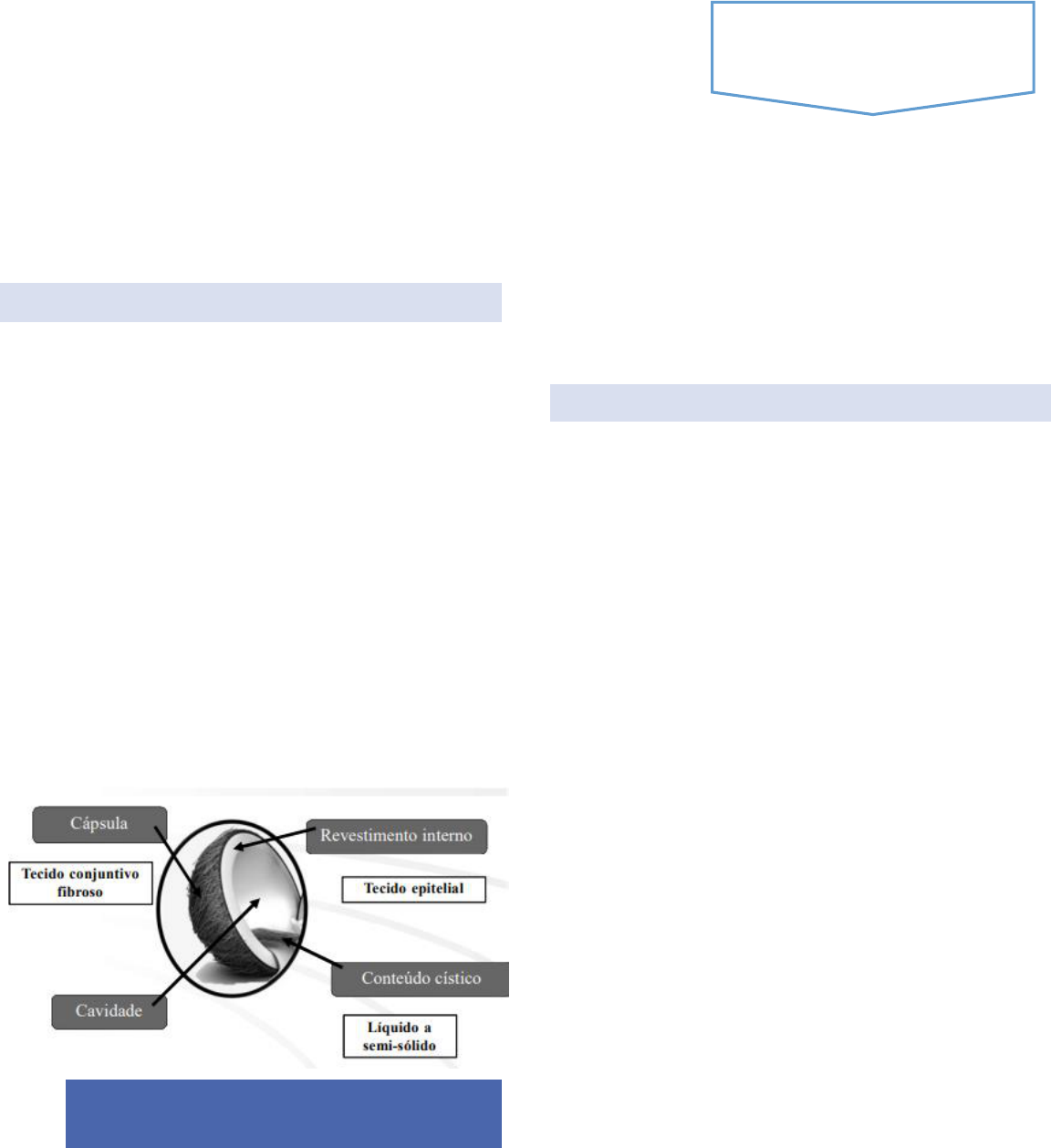 1 CISTOS ODONTOGÊNICOS GENERALIDADE ► São originados do epitélio odontogênico ► Possuem as seguintes estruturas: ► O revestimento epitelial é a alma do cisto. ► De acordo com sua origem são subclassificações em cistos de desenvolvimento e inflamatórios. o C. Inflamatórios: Possuem origem conhecida, pois são originados de inflamações. o C. de Desenvolvimento: não possuem origem conhecida e mas não parecem ser resultantes de um processo inflamatório. 1. CISTO DENTÍGERO (CISTO FOLICULAR) CD ► Ocorre em dentes retidos intraóssea. ► Causa reabsorção óssea. ► Origina-se da separação do folículo da coroa de um dente incluso( não erupcionado). ► È o mais comum de cistos odontogênicos de desenvolvimento, tendo prevalência de 20% de todos os cistos maxilares. ► O Cd se localiza na superfície da coroa do dente na junção esmalte-cemento. ► Patogenia desconhecida, mas acredita-se que se originou do acúmulo de líquidos do epitélio reduzido do esmalte e a coroa do dente. ► Alguns podem ter origem inflamatória. Caracteristicas clínicas e radiográficas: ► Com prevalência em 3° molares inf. ► Com menor frequência em 3° molares sup., caninos sup. e pré- molares inf. ► Raramente envolve dentes decíduos. ► Pode ocorrer associações com odontomas (tipo de tumor benigno) e dentes supranumerários. ► Acomete todas as idades, mas possuem prevalência entre 10 a 30 anos em homens e pessoas brancas. ► Os CD podem ser pequenos e grandes, os pequenos são assintomáticos e os grandes em imagens radiográficas podem ser confundidos com ceratocistos odontogênicos e ameloblastomas. ► São descobertos em exames radiográficos, com Área radiolúcida ou lesão radiotransparente unilocular associada a coroa de um dente incluso (sugestivo mas não conclusivo). ► Em radiografias essa região radiotransparente possui margem bem definida, quando este limite está mal definido pode indicar um cisto infectado. ► Os CD, tanto macroscopicamente como histopatologicamente apresentam processos uniloculares e quase nunca multiloculares. ► As relações cistos-coroas em radiografias possuem variação: Newany Santos-Odonto 102 Patologia Bucal-1° unidade Livro: NEVILLE 2 o Central: é a mais comum e o mesmo circunda a coroa do dente, deixando-o “dentro” do cisto. o Lateral: cresce lateralmente ao longo da superfície radicular e circunda parcialmente a coroa. o Circunferencial: envolve todo o dente, da coroa até a raiz. ► Pode ocorrer deslocamento do dente envolvido por distâncias consideráveis do dente. ► Pode ocorrer reabsorção radicular dos dentes adjacentes. ► Para a lesão ser considerada como um cisto dentígero, alguns investigadores acreditam que o espaço radiolúcido que envolve a coroa do dente deve ser de aproximadamente 3 a 4 mm de diâmetro. ► Apenas o exame radiográfico não é o suficiente para o diagnóstico do CD, pois tanto o ceratocisto odontogênico como ameloblastomas uniloculares possuem as mesmas características radiográficas. CARACTERÍSTICAS HISTOPATOLÓGICAS: ► Varia se o cisto está inflamado ou não. ► No cisto dentígero não inflamado, a cápsula de tecido conjuntivo fibroso está arranjada frouxamente e contém substância fundamental amorfa composta por glicosaminoglicanos. ► Pequenas ilhas e cordões de restos epiteliais odontogênicos de aspecto inativo. ► . Esses restos podem ser numerosos e, algumas vezes, os patologistas que não são familiarizados com as lesões da boca interpretam erroneamente esse achado como um ameloblastoma. ► O revestimento epitelial consiste em duas a quatro camadas de células achatadas não ceratinizadas. ► Interface entre o epitélio e o tecido conjuntivo é plana. ► No cisto dentígero inflamado (é mais comum) ► A cápsula fibrosa é mais colagenizada, com um ► infiltrado inflamatório crônico variável. ► O revestimento epitelial pode apresentar hiperplasia. ► Uma superfície ceratinizada pode ser observada. ► Células colunares ciliadas estão presentes. ► Pode ocorrer a presença de células mucosas do revestimento epitelial. ► Pequenos ninhos de células sebáceas podem ser notados raramente dentro da parede cística. ► Acredita-se que esses elementos mucosos, ciliados e sebáceos representem a multipotencialidade do revestimento epitelial odontogênico em um cisto dentígero. ► O exame macroscópico da parede de um cisto dentígero pode revelar uma ou muitas áreas de espessamento na superfície do lúmen. ► Pode ser difícil distinguir um pequeno cisto dentígero de um simples folículo dentário normal. 3 TRATAMENTO: ► Enucleação (Retirada) do cisto e dente não erupcionado. Se a erupção do dente envolvido for considerada possível, o dente pode ser deixado e ocorre a remoção parcial da cápsula cística. ► *(Pode ser que os pacientes necessitem de tratamento ortodôntico para auxiliar a erupção). PROGNÓSTICO: é excelente, e raramente nota-se recidiva após a remoção completa. Pode-se ocorre transformação neoplásica para um ameloblastoma. 2. CISTO DE ERUPÇÃO (HEMATOMA DE ERUPÇÃO) CE ► Localização periférica( extraóssea) em tecidos periféricos e moles. ► O cisto se desenvolve como resultado da separação do folículo dentário da coroa de um ► dente em erupção que já está posicionado nos tecidos moles que recobrem o osso alveolar. CARACTERÍSTICAS CLÍNICAS : ► O CE surge como um aumento de volume de consistência mole, frequentemente translúcido, na mucosa gengival que recobre a coroa de um dente decíduo ou permanente em erupção. ► A maioria acomete crianças com menos de 10 anos. ► Pode correr em qualquer dente em erupção, ► Mais frequente principalmente incisivos decíduos e 1º M. ► O trauma em sua superfície pode resultar em cor azul a marromarroxeada ► Tumefação mole translúcida na mucosa gengival que recobre um dente em erupção CARACTERÍSTICAS HISTOPATO