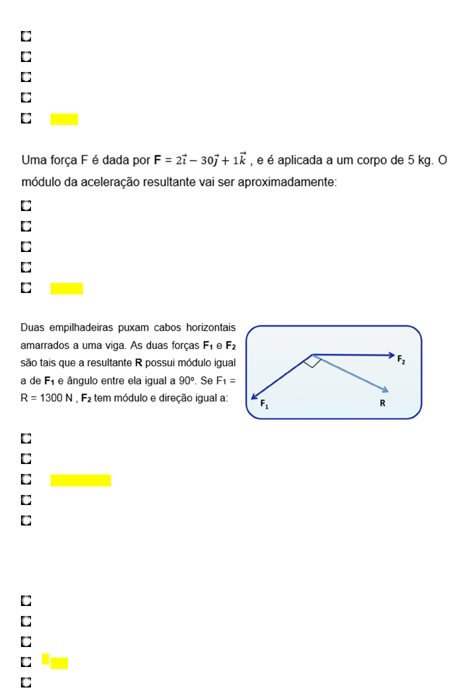 Um objeto com massa igual a 1,5 kg é largado de uma altura de 30 cm. A força atuando na sua queda é de: a. 4,5 N b. 147 N c. 45 N d. 1 N e. 14,7 N 1. a. 7,8 m/s² b. 3,5 m/s² c. 6,6 m/s² d. 60 m/s² e. 6,0 m/s² 1. a. 0 N b. 1300 N, 135º c. 1838,5 N, 135º d. 1300 N, 45º e. 2600 N, -45º 1. Uma esfera de 2,5 kg desliza em uma superfície horizontal com aceleração igual a 0,5 m/s2 da esquerda para a direita. Sabe-se que a força aplicada é igual a F = 5,50 N. O coeficiente de atrito entre a bola e o gramado é de: a. 0,08 b. 0,10 c. 0,20 d. 0,17 e. 0,06