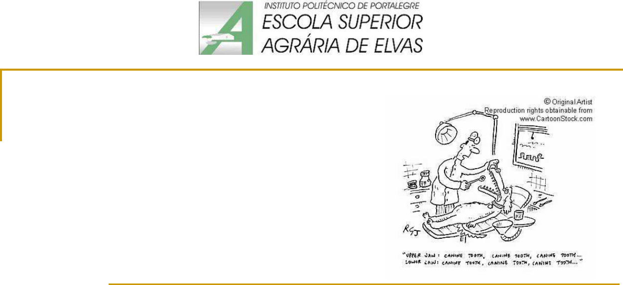 DENTES PRÁTICAS DE ANATOMIA DOS ANIMAIS DOMÉSTICOS Cursos de Equinicultura e Enfermagem Veterinária - 1º Semestre - Mónica Mira, Med.Vet. Objectivos � Identificar correctamente os diferentes tipos de dentes e dentições � Identificar a estrutura do dente e relacioná- las com as patologias mais frequentes � Indicar a fórmula dentária própria da espécie � Determinar a idade INTRODUÇÃO � Morfologia correlaciona-se com forma de vida e de alimentação da espécie animal � Arcada dentária superior � Ossos? � Arcada dentária inferior � Ossos? CARACTERÍSTICAS DOS DENTES DOS MAMÍFEROS � Difiodontes (duas dentições) � Decíduos ou de leite � Permanentes � Heterodontes (dentes com formas diferentes � Fórmula tipo mamíferos: Tipos de dentes nas espécies heterodontes � Incisivos � Ausentes no arco dental superior dos ruminantes. � Caninos � Ausentes nos ruminantes. � Pré-molares � O primeiro pré-molar no cavalo, designado por dente de lobo é rudimentar e não está sempre presente. � Último pré-molar superior do cão designa-se por carniceiro � Molares � Só definitivos – uma dentição � Primeiro molar inferior do cão designa-se por carniceiro Anatomia do dente (braquiodonte) � Coroa � Porção livre do dente que se projecta da gengiva. � Coberta pelo esmalte � Cúspide dentária – projecções principais da superfície oclusiva dentária. � Colo dentário � Constrição entre a coroa e a raiz � Raiz do dente � Porção do dente não coberta pelo esmalte. � Cavidade pulpar � Vasos e nervos Consultar: http://www.rvc.ac.uk/review/dentistry/Basics/intro.html Estrutura do dente – parte dura � Dentina ou marfim � Delimita a cavidade pulpar � Dispõe-se em camadas concêntricas à volta da polpa � Primária e secundária � Esmalte � Muito dura, translúcida, reveste apenas a coroa � Cimento � Duro, opaco, de cor cinzento-acastanhado, muito semelhante ao tecido ósseo. � Reveste as raízes na coroa dos dentes braquidontes. � Reveste mais ou menos largamente as coroas dos dentes hipsodontes. Estrutura do dente – parte mole � Polpa dentária � Mole, rosada, ocupa a cavidade dentária ou pulpar � Periodonte � Periósteo da parede alveolar � Ligamento periodontal – une raiz ao alvéolo � Gengiva – mucosa oral espessada � Sulco gengival � Parte livre da gengiva � Bordo gengival � Papila interdentária Terminologia � Faces lingual e vestibular � Face oclusiva – Porção do dente que entra em contacto com o dente correspondente superior/inferior. � Barra ou diastema – espaço entre dois dentes adjacentes, no mesmo arco dental. Classificação quanto à morfologia � Hipsodontes � Crescimento contínuo � Coroa alta � Cúspides e infundíbulo(s) � Esmalte cobre parcialmente a raiz � Cimento cobre a coroa � Cavalo, pré-molares e molares ruminantes � Braquiodontes � Coroa curta � Raízes longas � Homem, carnívoros, porco, incisivos ruminantes Consultar: http://www.vivo.colostate.edu/hbooks/pathphys/digestio n/pregastric/dentalanat.html Braquidonte vs Hipsodonte Incisivos e molares hipsodontes do cavalo O infundíbulo dos incisivos designa-se vulgarmente por corneto Outros tipos � Consultar: http://animaldiversity.ummz.umich.edu/site/topics/mammal_anatomy/tooth_diversity.html Designações possíveis � Esquerdo/direito e superior/inferior � Incisivos: Pinça, médio e canto ou 1º, 2º, 3º � Caninos � Pré-molares e molares: 1º, 2º, 3º,4º � Sistema Triadan � Usado nas fichas clínicas dos paciente � Quadrante superior direito: 100 � Quadrante superior esquerdo: 200 � Quadrante inferior direito: 300 � Quadrante inferior esquerdo: 400 � Partindo da fórmula dentária típica dos mamíferos os dentes são classificados em números � 1, 2, 3: incisivos � 4: caninos � 6, 7, 8, 9: pré-molares � 10, 11, 12:molares Sistema Triadan Cavalo Cão Sistema Triadan Gato Quizz ? � No sistema Triadan como designaria? � O pinça inferior direito do cavalo � O segundo pré-molar superior esquerdo do cão � O 2ºincisivo superior direito do gato � O 2º pré-molar superior esquerdo no gato � Como poderia designar os seguintes dentes? � 105 no cavalo � 108, 208,309, 409 no cão � 204 no gato Homem Homem Cão Fórmula dentária Cão Determinação da idade � Data de erupção e evolução � Cachorro nasce sem dentes � 1º os caninos – 21 dias � Cantos – 25 dias � Médios – 28 dias � Pinças – 30 dias � Substituição � Incisivos – 5 meses � Pinças – 4 meses � Médios – 4,5 meses � Cantos e caninos – 5 meses � Caninos – 7 meses (as próprias arcadas molares estão completas nesta altura) Determinação da idade Particularidades � Em geral os incisivos permanecem bem brancos e com as cúspides (em forma de flor de Lis) até 8 -10 meses; � Pinças inferiores nivelam 1 - 1, 5 anos, idade a que os médios inferiores começam a gastar, � Médios nivelam aos 1,5-2 anos, altura em que o gastamento atinge os pinças superiores. � Cantos nivelam aos 3,5 anos (grandes variações individuais). � Os dentes começam então a ficar castanhos aos 4-5 anos, altura em que nivelam os médios superiores. 3,5 meses 5 meses > 7 meses Particularidades � Dentes especializados em rasgar que se designam por carniceiros (PM4 superiores e M1 Inferiores) � Raças grandes mais precoces � Raças pequenas mais tardias (diferenças de semanas) � Evolução sequente muito variável e função da alimentação Braquicéfalos Prognatas Braquicéfalos Periodontite � Mais frequente: � Cães idosos � Dieta “mole” � Em casos grave há perda do dente Retenção dentes decíduos Gatos Gatos Fórmula dentária Determinação da idade Braquicefálico Ruminantes � Incisivos � Ausentes no maxilar superior (almofada dentária) � Dos 4 incisivos, o último corresponde ao can