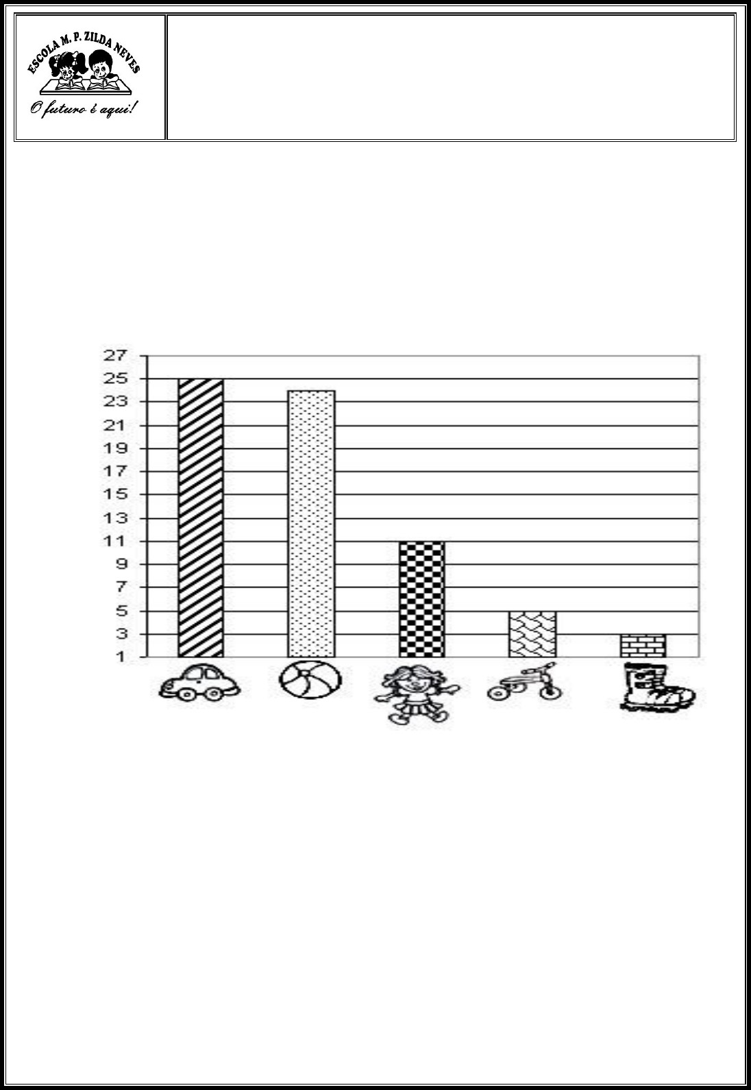 Escola Municipal Professora Zilda Neves Professora: ________________________ Data: ____ / ____ /____ Aluno (a): _____________________________________________________________ ATIVIDADE AVALIATIVA DE MATEMÁTICA I UNIDADE Observe o gráfico e responda as questões: BRINQUEDOS PREFERIDOS DAS TURMAS DO 3° ANO DA ESCOLA ONDE SUZI ESTUDA Sobre o que é este gráfico? _____________________________________________________________ Quantos alunos votaram na boneca? _____________________________________________________________ Qual o brinquedo favorito desta turma? _____________________________________________________________ E qual o menos votado? _____________________________________________________________ Quais os brinquedos que entraram na pesquisa para montar o gráfico? _____________________________________________________________ Onde foi feito este gráfico? _____________________________________________________________ Com quem foi feita a pesquisa? _____________________________________________________________ Quantos votos os patins receberam? _____________________________________________________________ Calcule a diferença de votos entre a bola e a boneca: Some os votos do carrinho, da boneca e dos patins: Preencha a tabela de preços, colocando preço nos brinquedos abaixo: BRINQUEDOS PREÇOS CARRINHO PATINS VELOCÍPEDE BOLA BONECA Escreva por extenso o preço da bola: _____________________________________________________________ Resolva os probleminhas: Mariana foi ao mercado para sua mãe e comprou 1kg de farinha que custa R$ 3,00. Ela levou R$ 10,00. Teve troco? ________________________________________________ Se teve foi quanto? __________________________________________ Num jardim havia uma dúzia de flores vermelhas e meia dúzia de flores amarelas. Quantas flores havia no total neste jardim? Desenho Cálculo Resposta Na escola de Suzi tem 247 alunos. Hoje faltaram 21 alunos. Quantos alunos foram a escola onde Suzi estuda no dia de hoje? Arme e resolva as contas abaixo: 23 + 45+ 67 = b) 98 – 76 = Leia: COMPREI UM QUILO DE FARINHA PRA FAZER FAROFA PRA FAZER FARROFA PRA FAZER FAROFA FA FA Agora responda: Quanto pesa um quilo de farinha? ( ) 1.000 g ( ) 500 g ( ) 250 g ( ) 200 g Se colocarmos numa balança de um lado 1kg de farinha e do outro 2 kg, como ficará a balança? Desenhe para mostrar: E se colocarmos numa balança, 1 kg de um lado e 1kg do outro como ficará a balança? Desenhe para mostrar: O que é mais pesado? 1 kg de pedra ou 1kg de algodão? ( ) 1 kg de algodão ( ) 1 kg de pedra ( ) Tanto faz, é tudo um quilo, o que muda é quantidade dos elementos. BEIJOCAS DA TIA BETE!
