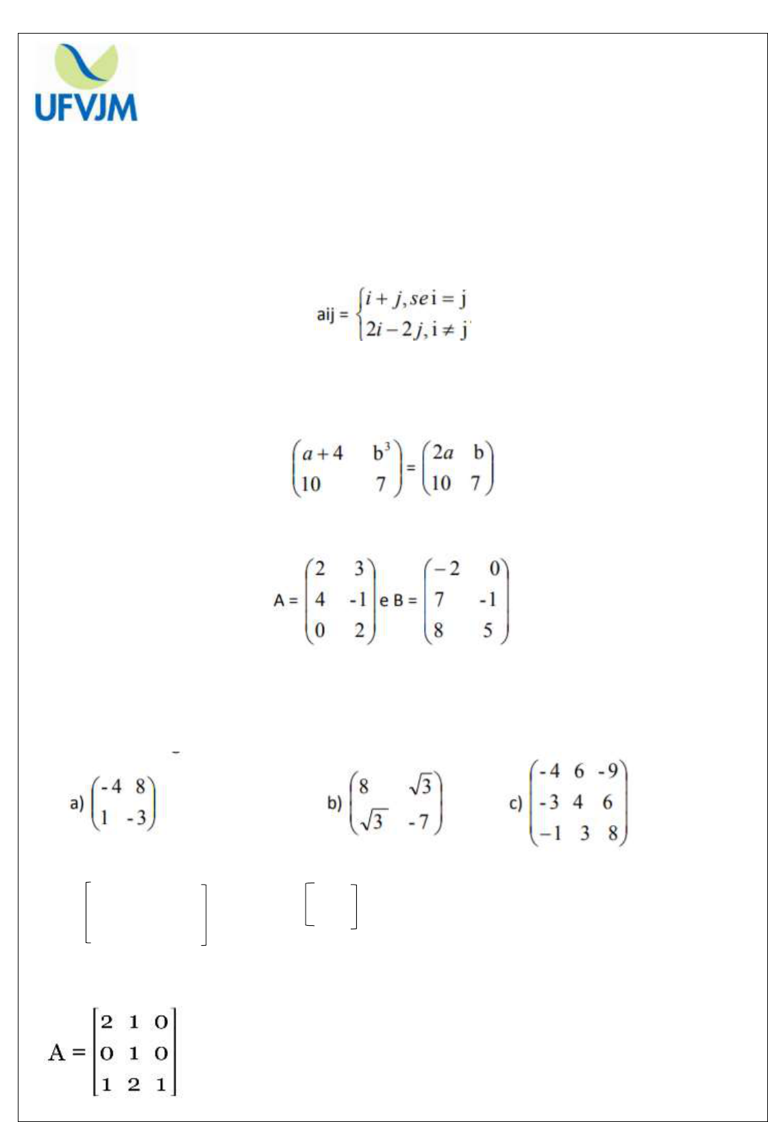 TRABALHO AVALIATIVO – MATRIZES E SISTEMAS LINEARES – CEX122 Professor: Marcelo Luiz Vieira Data de entrega: 16/08/2019 Valor: _______ Nota: ______ Aluno (a): _____________________________ Matricula: _____________ Turma: ________ 1) Determine a matriz A = (aij)3x4 e verifique qual o valor de 𝑎22 + 𝑎31: 2) Determine a soma dos elementos da 3º coluna da matriz A = (aij)3x3 tal que aij = 4 + 3i –i. 3) Determine a soma dos elementos da matriz linha (1x5) que obedece a lei: aij = 2i2 – 7j. 4) Determine a e b para que a igualdade seja verdadeira. 5) Determine (𝐴 + 𝐵)𝑡 : 6) Considere as matrizes A = (aij) e B (bij) quadradas de ordem 2, com aij = 3i + 4j e bij = -4i – 3j. Sabendo que C = A + B, determine C² . 7) Calcule os determinantes das matrizes abaixo: 8) Determine a inversa de cada matriz abaixo: a) 3 4 1 b) 1 1 2 1 0 2 4 4 1 3 9) Calcule o cofator da matriz A: MINISTÉRIO DA EDUCAÇÃO UNIVERSIDADE FEDERAL DOS VALES DO JEQUITINHONHA E MUCURI FACULDADE DE CIÊNCIAS SOCIAIS APLICADAS E EXATAS CURSO DE MATEMÁTICA www.ufvjm.edu.br