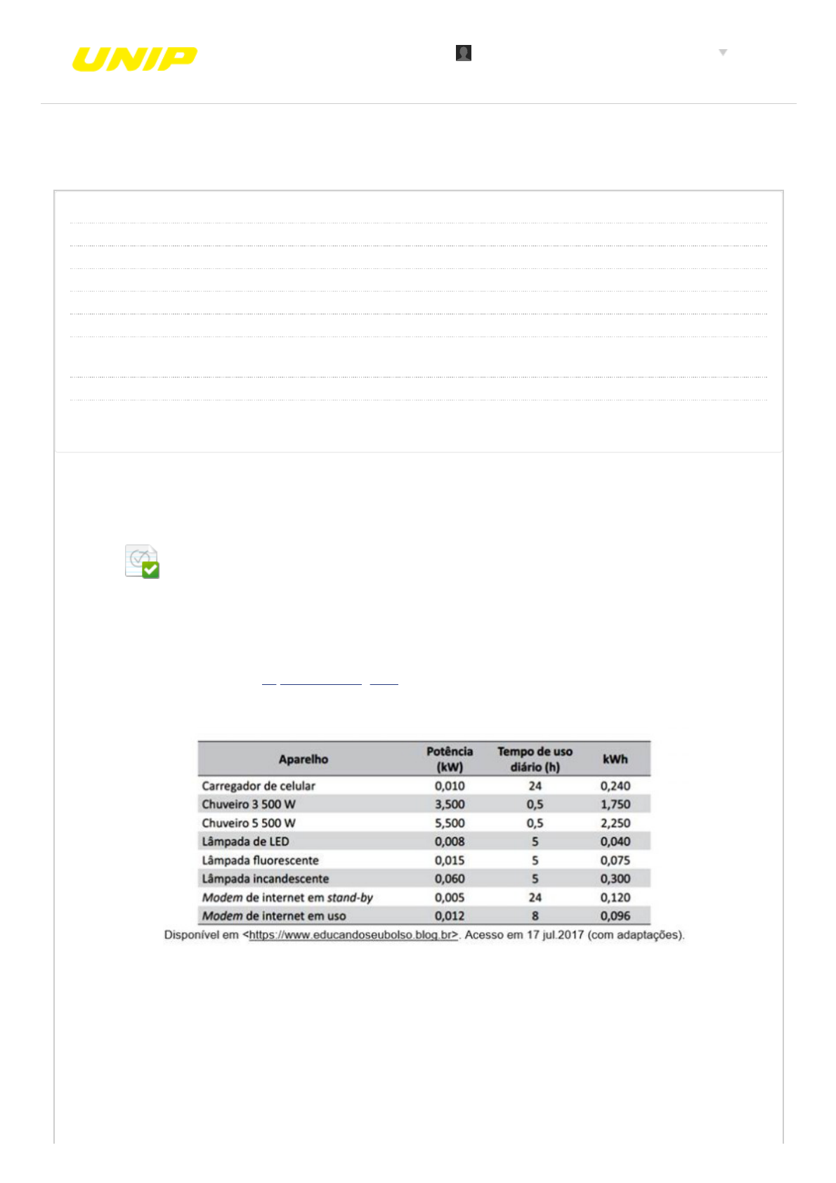 18/11/2019 Revisar envio do teste: AVALIAÇÃO II – 6596-15_SEI_TI_... https://ava.ead.unip.br/webapps/assessment/review/review.jsp?attempt_id=_27479600_1&course_id=_50994_1&content_id=_783922_1&return… 1/13 Revisar envio do teste: AVALIAÇÃO II ESTUDOS DISCIPLINARES IV 6596-15_SEI_TI_0119_R_20192 CONTEÚDO Usuário willian.oliveira23 @unipinterativa.edu.br Curso ESTUDOS DISCIPLINARES IV Teste AVALIAÇÃO II Iniciado 18/11/19 14:52 Enviado 18/11/19 15:16 Status Completada Resultado da tentativa 8 em 10 pontos Tempo decorrido 24 minutos Resultados exibidos Todas as respostas, Respostas enviadas, Respostas corretas, Comentários, Perguntas respondidas incorretamente Pergunta 1 (Enade 2017) Leia o texto a seguir. O sistema de tarifação de energia elétrica funciona com base em três bandeiras. Na bandeira verde, as condições de geração de energia são favoráveis, e a tarifa não sofre acréscimo. Na bandeira amarela, a tarifa sofre acréscimo de R$0,020 para cada kWh consumido, e na bandeira vermelha, condição de maior custo de geração de energia, a tarifa sofre acréscimo de R$0,035 para cada kWh consumido. Assim, para saber o quanto se gasta com o consumo de energia de cada aparelho, basta multiplicar o consumo em kWh do aparelho pela tarifa em questão. Disponível em < http://www.aneel.gov.br > . Acesso em 17 jul.2017 (com adaptações). Na tabela a seguir, são apresentadas a potência e o tempo de uso diário de alguns aparelhos eletroeletrônicos usuais em residências. Considerando as informações do texto, os dados apresentados na tabela, uma tarifa de R$0,50 por kWh em bandeira verde e um mês de 30 dias, avalie as a�rmativas a seguir. I- Em bandeira amarela, o valor mensal da tarifa de energia elétrica para um chuveiro de 3.500W seria de R$1,05 e de R$1,65 para um chuveiro de 5.500W. II- Deixar um carregador de celular e um modem de internet em stand-by conectados na rede de energia durante 24 horas por dia representa um gasto mensal de R$5,40 na tarifa de energia elétrica em bandeira verde, e de R$5,78, em bandeira amarela. III- Em bandeira verde, o consumidor gastaria mensalmente R$3,90 a mais na tarifa de energia elétrica em relação a cada lâmpada incandescente usada no lugar de uma lâmpada LED. É correto o que se a�rma em: UNIP EAD BIBLIOTECAS MURAL DO ALUNO TUTORIAISCONTEÚDOS ACADÊMICOS 1 em 1 pontos willian.oliveira23 @unipinterativa.ed... 1 18/11/2019 Revisar envio do teste: AVALIAÇÃO II – 6596-15_SEI_TI_... https://ava.ead.unip.br/webapps/assessment/review/review.jsp?attempt_id=_27479600_1&course_id=_50994_1&content_id=_783922_1&return… 2/13 Resposta Selecionada: b. Respostas: a. b. c. d. e. Feedback da resposta: III, apenas. II, apenas. III, apenas. I e II, apenas. I e III, apenas. I, II e III. Resposta: B Comentário: No texto introdutório da questão, é dito que o sistema de tarifação de energia elétrica opera com três bandeiras: verde, amarela e vermelha. As condições relativas a cada uma dessas bandeiras estão indicadas a seguir. Foi dito que, em bandeira verde, a tarifa é de R$0,500 por kWh consumido. Logo, as tarifas referentes a cada tipo de bandeira são as mostradas na tabela a seguir. Sabendo os valores das tarifas para cada tipo de bandeira (em R$ por kWh consumido) e conhecendo as potências (em kW) e os tempos de usos diários (em horas) dos aparelhos mostrados na tabela do enunciado, podemos analisar as a�rmativas da questão. I – A�rmativa incorreta. JUSTIFICATIVA. Para sabermos os valores mensais, em bandeira amarela, do gasto com energia elétrica para um chuveiro de 3.500W e para um chuveiro de 5.500W, fazemos, para cada um dos aparelhos, a multiplicação da potência do chuveiro (em kW) pelo seu tempo diário de uso (em horas), pelo número de dias em um mês (30 dias) e pelo valor da tarifa em bandeira amarela (R$0,520 por kWh consumido). Para o chuveiro de 3.500W, em bandeira amarela, temos o gasto mensal de R$27,30, pois: II – A�rmativa incorreta. JUSTIFICATIVA. Para sabermos os valores mensais, em bandeira amarela, dos gastos com energia elétrica para um carregador de celular e um modem de internet em stand-by conectados na rede de energia durante 24 horas por dia, fazemos, para cada um deles, a multiplicação da potência do aparelho (em kW) pelo seu tempo diário de uso (24 horas), pelo número de dias em um mês (30 dias) e pelo valor da tarifa em bandeira amarela (R$0,520 por kWh consumido). Para o carregador de celular, em bandeira amarela, temos o gasto mensal de R$3,74, pois: Para os dois aparelhos (carregador de celular e modem de internet em stand-by), em bandeira amarela, temos o gasto mensal de R$22,46, pois: Para sabermos os valores mensais, em bandeira verde, dos gastos com energia elétrica para um carregador de celular e um modem de internet em stand-by conectados na rede de energia durante 24 horas por dia, fazemos, para cada um deles, a multiplicação da potência do aparelho (em kW) pelo seu tempo diário de uso (24 horas), pelo número de dias em um mês (30 dias) e pelo valor da tarifa em 18/11/2019 Revisar envio do teste: AVALIAÇÃO II – 6596-15_SEI_TI_... https://ava.ead.unip.br/webapps/assessment/review/review.jsp?attempt_id=_27479600_1&course_id=_50994_1&content_id=_783922_1&return… 3/13 bandeira amarela (R$0,500 por kWh consumido). Para o carregador de celular, em bandeira verde, temos o gasto mensal de R$3,60, pois: III – A�rmativa correta. JUSTIFICATIVA. Para sabermos os valores mensais, em bandeira verde, dos gastos com energia elétrica para uma lâmpada incandescente e para uma lâmpada LED, fazemos, para cada uma delas, a multiplicação da potência do aparelho (em kW) pelo seu tempo diário de uso (em horas), pelo número de dias em um mês (30 dias) e pelo valor da tarifa em bandeira verde (R$0,500 por kWh consumido). Para a lâmpada incandescente, em bandeira verde, temos o gasto mensal de R$4,50, pois: Pergunta 2 Resposta Selecionada: e. Respos