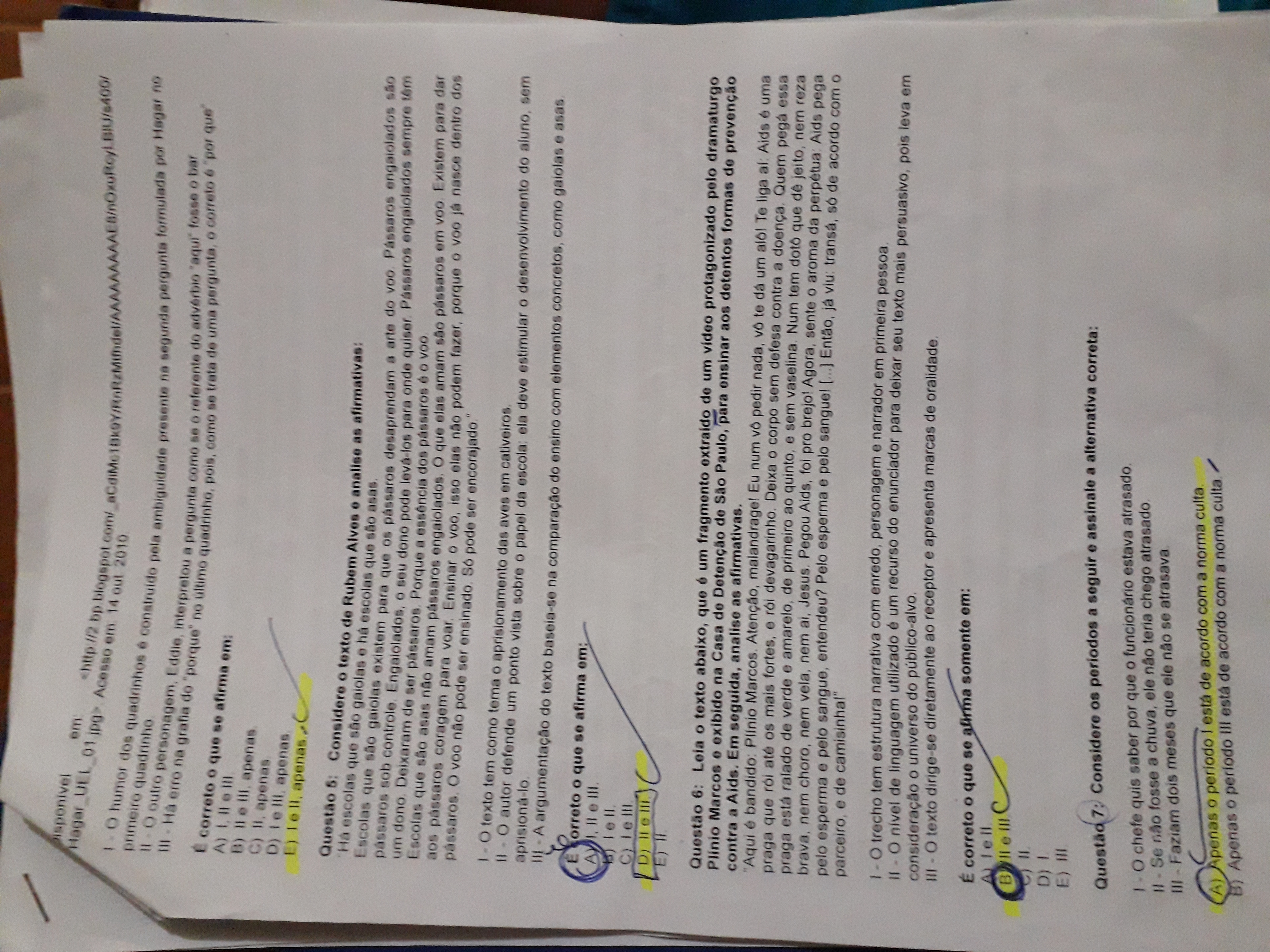 O trecho tem estrutura narrativa com enredo, personagem e narrador em primeira pessoa. O texto dirige-se diretamente ao receptor e apresenta marcas de oralidade. I. O nivel de linguagem utilizado e um recurso do enunciador para deixar seu texto mais persuasivo, pois leva em consideracao universo do publico-alvo. II. O trecho tem estrutura narrativa com enredo, personagem e narrador em primeira pessoa. III. O texto apresenta marcas de oralidade. A) I e II B) Apenas II C) Apenas III D) I e III E) II e III