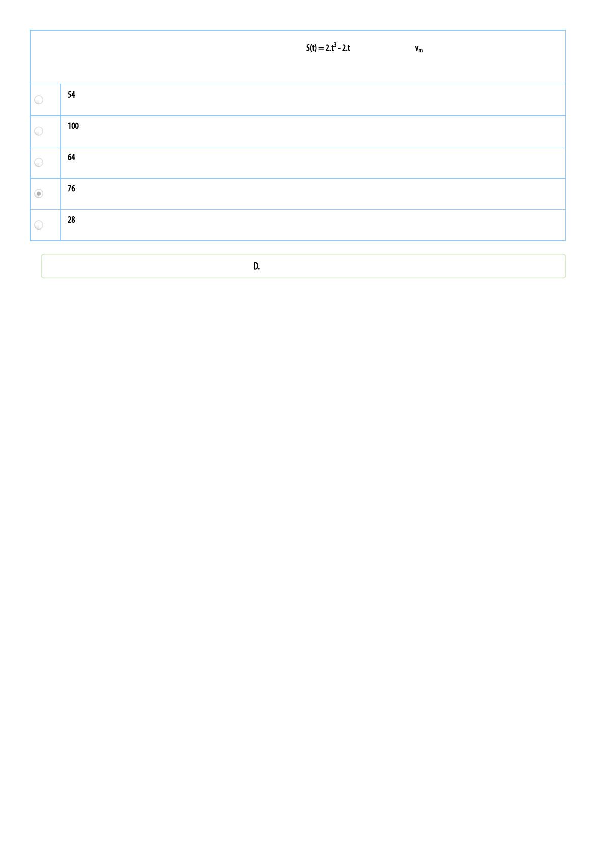 01/07/2019 https://online.unip.br/exercicio/detalhes/319454 https://online.unip.br/exercicio/detalhes/319454 1/1 A equação do espaço S (em m) em função do tempo t (em s) para uma partícula móvel é: S(t) = 2.t - 2.t. A velocidade média (v ) da partícula entre os instantes 2 s e 5 s vale, em m/s: A 54 B 100 C 64 D 76 E 28 3 m Você já respondeu e acertou esse exercício. A resposta correta é: D.