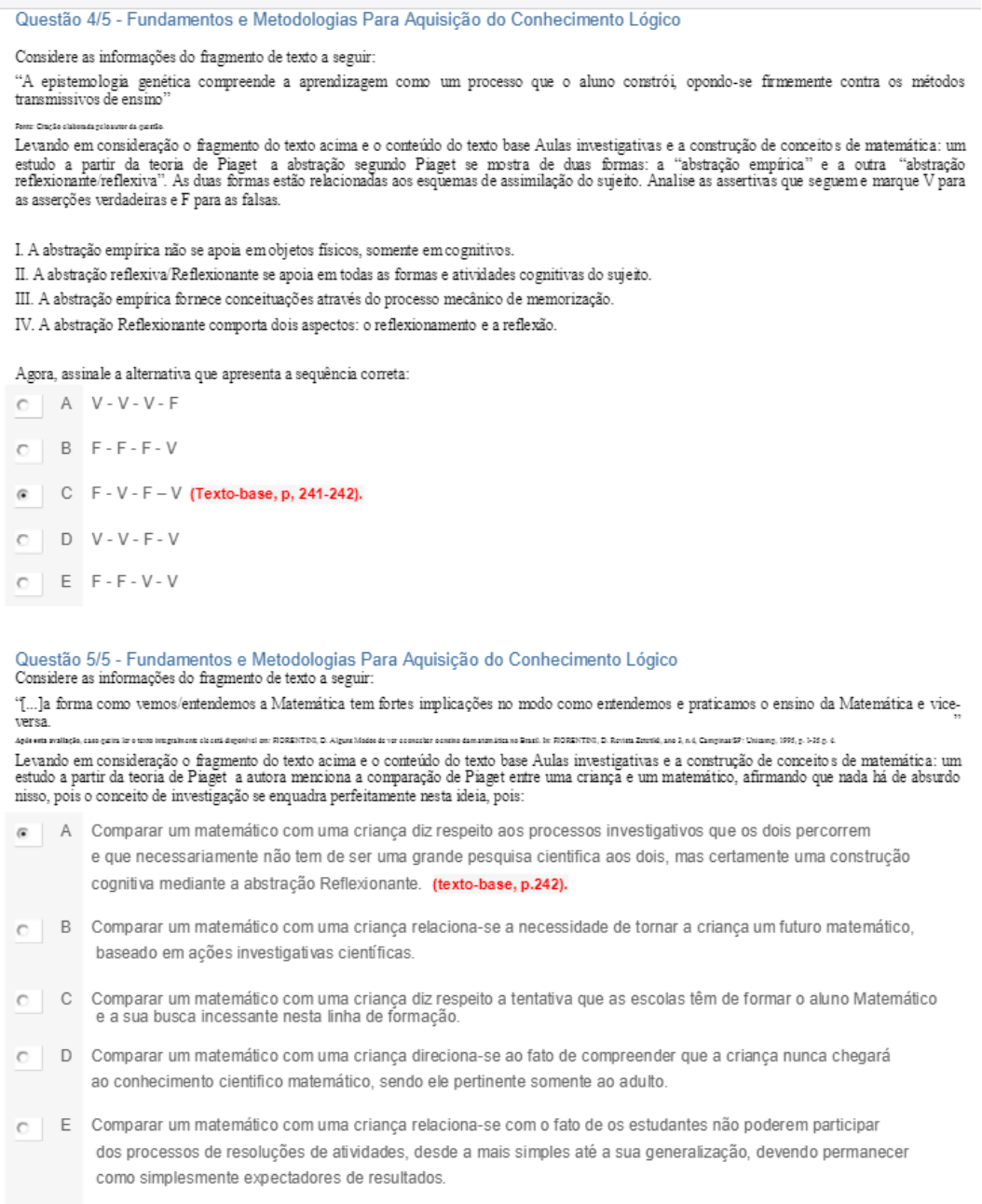 Questão 1/5 - Desenvolvimento do Conhecimento Lógico Leia o fragmento de texto a seguir: A matemática sempre foi a ciência de números e de cálculos. Desde a antiguidade, o homem utiliza a matemática para facilitar a vida na sociedade. A matemática foi usada pelos egípcios nas construções da pirâmides, diques, canais de irrigação e estudos de astronomia. Os gregos antigos também desenvolveram vários conceitos matemáticos. Podemos dizer, que a matemática está presente em tudo que olhamos. Após esta avaliação, caso queira ler o texto integralmente ele está disponível em: CAETANO, Thamyres. A Origem da Matemática: A Evolução da Matemática. <http://thamycaytano.blogspot.com.br/>. Acesso em 19 abr. 2017. Levando em consideração o dado fragmento de texto e o texto-base Matemática Concreta X Matemática Abstrata: Mito ou Realidade? Assinale a alternativa correta em relação à função original da matemática: Nota: 20.0 A A função inicial da matemática era somente a leitura. B A função original da matemática era analisar as probabilidades da seca. C A função de origem da matemática era contar, calcular e resolver problemas. Você acertou! A função social e profissional de origem da matemática era contar, calcular e resolver problemas (texto-base, p.01) D A matemática era totalmente dispensável nas escolas na década de 1920. E A matemática se originou com a raiz quadrada e com a matemática quântica. Questão 2/5 - Desenvolvimento do Conhecimento Lógico Leia a seguinte citação: “A educação não formal até os anos de 1980 foi tratada como de pouca importância no Brasil, sendo vista como um processo delineado para alcançar a participação de indivíduos e grupos específicos voltados às áreas rurais”. Após esta avaliação, caso queira ler o texto integralmente ele está disponível em: ALMEIDA, S. B. Maria. Educação não formal, informal e formal do conhecimento científico nos diferentes espaços de ensino e aprendizagem. Os desafios da escola pública paranaense na perspectiva do professor PDE. Produções didático-pedagógicas- Cadernos PDE. v.2, 2014. http://www.diaadiaeducacao.pr.gov.br/portals/cadernospde/pdebusca/producoes_pde/2014/2014_uel_bio_pdp_maria_salete_bortholazzi_almeida.pdf. Acesso em 15 mai. 2017. De acordo com a citação acima e o conteúdo do texto-base O Saber Matemático na Vida Cotidiana: um enfoque etnomatemático como a psicologia cognitiva passou a considerar as conexões entre os conhecimentos formais e não formais, assinale a alternativa correta: Nota: 20.0 A Formais: construídos através da experiência fora da escola. B Informais: adquiridos através da escolarização. C Formais e informais diante da psicologia cognitiva não são adquiridos fora da escola. D Formais: supostamente construídos através da escolarização. Informais: supostamente adquiridos da experiência fora da escola. Você acertou! A alternativa correta é a letra d). Meira (2002, p. 19) acrescenta que, atualmente, inclusive “[...] a psicologia cognitiva a passou a considerar as conexões entre conhecimentos formais (supostamente construídos através da escolarização) e informais (supostamente adquiridos através da experiência diária fora da escola).” E Diante da psicologia existem dois paradigmas da educação: a formal que está inserida em escolas particulares e a informal que está contextualizada nas escolas públicas. Questão 3/5 - Desenvolvimento do Conhecimento Lógico Leia o excerto de texto a seguir: A necessidade de contar começou com as primeiras formas de agricultura. Pela manhã para cada animal que saia para o rebanho, era inserida uma pedrinha em um saco. No final da tarde a operação era inversa, onde, para cada animal que retornava era retirada uma pedra do saco. Se a quantidade de pedras fosse maior que número de animais, é porque faltavam animais, na comparação inversa, significava que voltaram mais animais, onde nesse caso, acrescentaria a pedra no saco referente aquele animal. Isso sempre feito de um a um. Após esta avaliação, caso queira ler o texto integralmente, ele está disponível em: ASSIS, R. O. Jessica. A Origem dos números. Campinas, 2014.http://www.ime.unicamp.br/~ftorres/ENSINO/MONOGRAFIAS/JR_M1_FM_2014.pdf. Acesso em 24 abr. 2017. Considerando o fragmento de texto dado e o conteúdo do texto-base A Definição de Número: Uma hipótese sobre a hipótese de Piaget, sobre a história do número até o século 18, assinale a alternativa correta: Nota: 20.0 A A matemática e seus fundamentos era uma preocupação constante até o século 18. B Até o século 18, a matemática não era dedutiva. C A matemática até o século 18 não estava ligada aos algoritmos. D De uma maneira em geral, à exceção do período clássico, na Grécia Antiga, não houve evolução das ideias matemáticas. E Até o século 18, a matemática estava ligada aos algoritmos e pouca ou nenhuma preocupação existia quanto à natureza dos seus elementos ou à seus fundamentos. Você acertou! Até o século 18, embora já inteiramente dedutiva, a matemática estava particularmente ligada aos algoritmos, e pouca ou nenhuma preocupação existia quanto à natureza de seus elementos ou quanto aos seus fundamentos. De uma maneira geral, à exceção do período clássico, na Grécia Antiga, a evolução das ideias matemáticas prosseguiu, até aí, de uma maneira linear, sem maiores revoluções (texto-base p. 136). Questão 4/5 - Desenvolvimento do Conhecimento Lógico Considere a seguinte citação: “O aluno supervalorizando o poder da matemática formal, perde a autoconfiança em sua intuição matemática, diminuindo a cada dia seu raciocínio matemático e assim, não conseguindo associar a solução do problema encontrada matematicamente com a solução do mesmo problema numa situação real”. Após esta avaliação, caso queira ler o texto integralmente ele está disponível em: ANDRADE, C. C