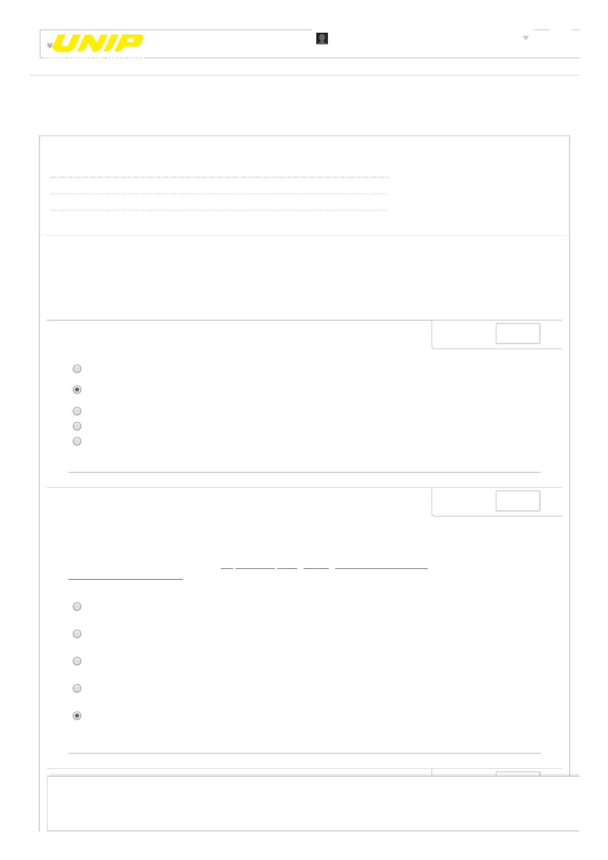 09/09/2019 Fazer teste: QUESTIONÁRIO UNIDADE III – 5603-60_59801_R_... https://ava.ead.unip.br/webapps/assessment/take/launch.jsp?course_assessment_id=_232149_1&course_id=_45567_1&content_id=_715960_1… 1/4 Fazer teste: QUESTIONÁRIO UNIDADE IIIINSTITUIÇÕES DE DIREITO 5603-60_59801_R_20192 CONTEÚDO Informações do teste Descrição Instruções Várias tentativas Este teste permite 3 tentativas. Esta é a tentativa número 1. Forçar conclusão Este teste pode ser salvo e retomado posteriormente. a. b. c. d. e. PERGUNTA 1 É consequência do agir ético empresarial: Custos maiores. Legitimidade moral, para exigir comportamento ético de toda teia organizacional. Avaliação equivocada do desempenho da estrutura empresarial. Diminuição dos lucros em razão das constantes contingências. Desrespeito dos parceiros comerciais. 0,4 pontos Salva a. b. c. d. e. PERGUNTA 2 “Desde 2004, IPÊ e Havaianas têm uma parceria que encanta os brasileiros e o mundo por meio das Havaianas IPÊ, sandálias com estampas que retratam a fauna e �ora das matas brasileiras. Comercializadas em cerca de 100 países, elas colaboram para a conservação da biodiversidade do Brasil, com repasse de 7% das vendas líquidas para o Instituto.”. ( http://www.ipe.org.br/negocios-sustentaveis/ca ses-de-mrc/832-havaianas). As Havaianas: Preocupam-se, unicamente, com o aumento de seus lucros e a conquista de uma fatia maior do mercado internacional. Encontra grandes di�culdades de conciliar e�ciência econômica e preocupação social. Não utiliza o poder da marca em benefício mútuo, isto é, da empresa e da sociedade. Aumenta a vulnerabilidade de empresa, investindo em áreas de pouco interesse, aumentando as retaliações do “stakeholders”. Adotam a responsabilidade social agregando projetos sociais com valores aos produtos e serviços. 0,4 pontos Salva a PERGUNTA 3 A responsabilidade empresarial adquire o caráter social pela adoção de um conjunto de práticas, dentre elas: Deixar para segundo plano a diversidade interna da empresa e o combate 0,4 pontos Salva ? Estado de Conclusão da Pergunta:UNIP EAD BIBLIOTECAS MURAL DO ALUNO TUTORIAIS Clique em Salvar e Enviar para salvar e enviar. Clique em Salvar todas as respostas para salvar todas as respostas. CONTEÚDOS ACADÊMICOS jaqueline.amaral3 @unipinterativa.edu.br 09/09/2019 Fazer teste: QUESTIONÁRIO UNIDADE III – 5603-60_59801_R_... https://ava.ead.unip.br/webapps/assessment/take/launch.jsp?course_assessment_id=_232149_1&course_id=_45567_1&content_id=_715960_1… 2/4 a. b. c. d. e. p g p p às discriminações. Não interferir nas condições de trabalho dos empregados dos prestadores de serviços. Incluir investimentos em pesquisa tecnológica para inovar processos e produtos, além de melhor satisfazer os clientes ou usuários. Evitar discussões e ações de conservação e restauração do meio ambiente. Distanciar-se da comunidade local. a. b. c. d. e. PERGUNTA 4 Analise os temas abaixo: I - Regulamentação da troca de presentes, grati�cações, favores, cortesias, brindes, convites de fornecedores ou clientes. II - Autorização para que se realize a espionagem econômica ou industrial e não dispensando o uso do benchmarking e da inteligência competitiva. III - Postura diante do trabalho infantil e do trabalho forçado. IV - Responsabilidade ambiental. V - Incentivo à formação de cartéis e a forma de participação em associações empresariais. Quais deles devem ser recorrentes nos Códigos de Conduta Ética? I, II e III. II, III e IV. III, IV e V. I, III e IV I, II e V. 0,4 pontos Salva a. b. c. d. e. PERGUNTA 5 Avalie as asserções a seguir e a relação proposta entre elas: I - É importante que o conteúdo do Código de Conduta Ética seja re�etido nas atitudes das pessoas a que se dirige e encontre respaldo tanto na alta administração da empresa quanto no último empregado contratado PORQUE II - Todos têm a responsabilidade de vivenciá-lo e praticá-lo, para que se formalize um padrão de conduta considerado adequado para uma organização. A respeito dessas asserções, assinale a opinião correta: As asserções I e II são proposições verdadeiras, e a II é uma justi�cativa da I. As asserções I e II são proposições verdadeiras, mas a II não é uma justi�cativa da I. A asserção I é uma proposição verdadeira, e a II é uma proposição falsa. A asserção I é uma proposição falsa, e a II é uma proposição verdadeira. As asserções I e II são proposições falsas. 0,4 pontos Salva PERGUNTA 6 Determinada marca registrada de sandálias plásticas é titular do registro de seus produtos. Entretanto, toma conhecimento de que uma loja está produzindo e distribuindo calçados plásticos idênticos aos seus, o que vem resultando em prejuízos materiais decorrentes da indevida comercialização além de sério abalo 0,4 pontos Salva Estado de Conclusão da Pergunta: Clique em Salvar e Enviar para salvar e enviar. Clique em Salvar todas as respostas para salvar todas as respostas. 09/09/2019 Fazer teste: QUESTIONÁRIO UNIDADE III – 5603-60_59801_R_... https://ava.ead.unip.br/webapps/assessment/take/launch.jsp?course_assessment_id=_232149_1&course_id=_45567_1&content_id=_715960_1… 3/4 a. b. c. d. e. prejuízos materiais decorrentes da indevida comercialização, além de sério abalo econômico. Trata-se violação ao (à): Marca. Modelo de utilidade. Desenho industrial. Invenção. Adição de invenção. a. b. c. d. e. PERGUNTA 7 Para Kant, a moral reside na pureza da vontade, na retidão dos propósitos. Afere- se a moralidade de um ato através da boa vontade do homem, que é a vontade de usar as virtudes humanas. Continua seus estudos através dos imperativos categóricos a�rmando que seu fundamento é a pessoa humana, pois: O ser humano deve agir segundo uma máxima tal que deve querer ao mesmo que se afaste de se tornar uma regra universal, re�etindo unicamente os interesses pesso