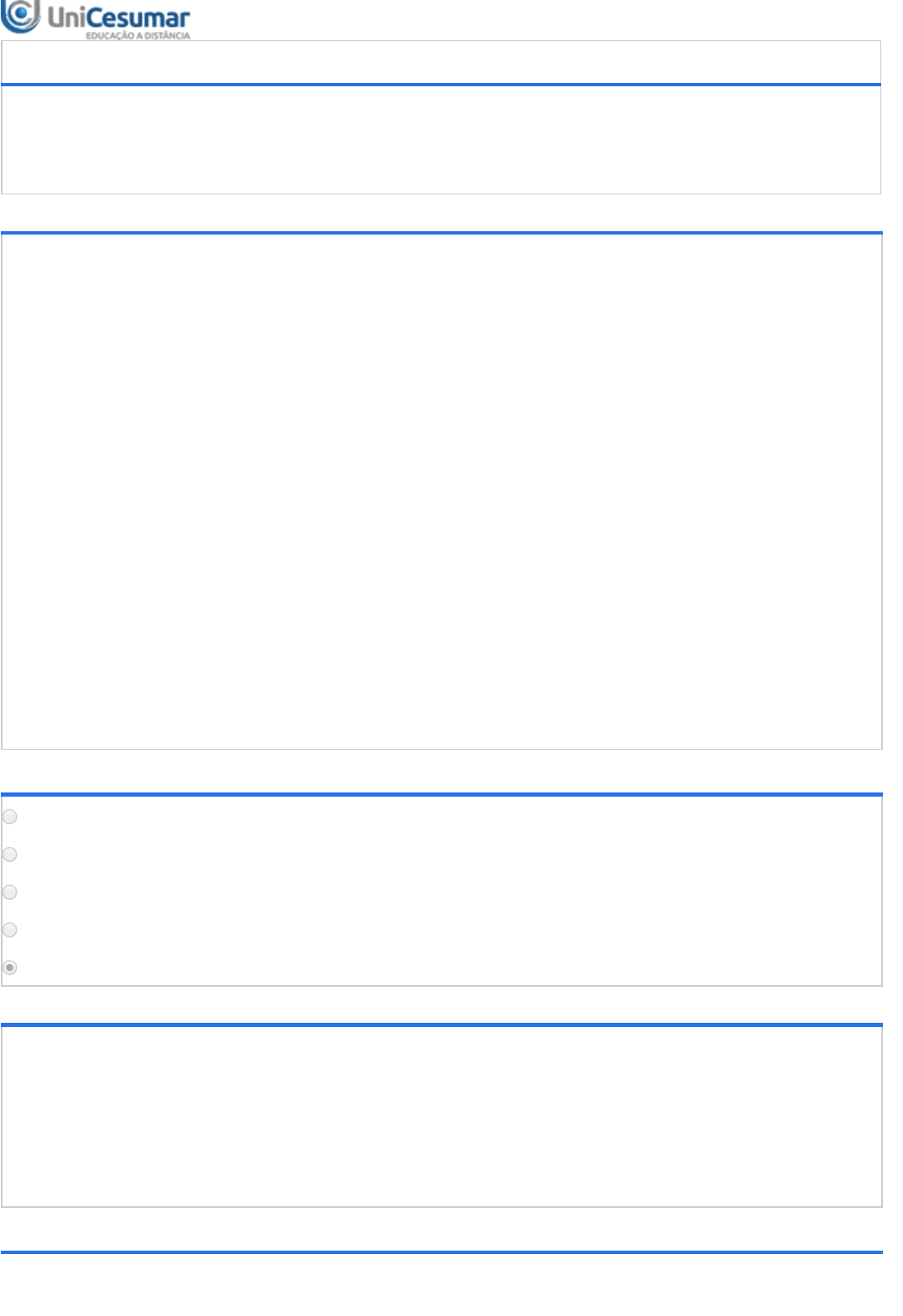 ATIVIDADE 1 - PSICO - PRINCÍPIOS TEÓRICOS DA PSICOPEDAGOGIA - 2019D1 Período:11/11/2019 08:00 a 06/12/2019 23:59 (Horário de Brasília) Status:ABERTO Nota máxima:0,50 Gabarito:Gabarito será liberado no dia 07/12/2019 00:00 (Horário de Brasília) Nota obtida: 1ª QUESTÃO Quando falamos da Psicopedagogia no Brasil, verificamos que a visão de que a dificuldade de aprendizagem estava relacionada com problemas orgânicos também foi mantida por diversos anos, sendo decisiva no tratamento do fracasso escolar. Isso ocorreu principalmente na década de 1970, período em que a causa dos problemas de aprendizagem passou a ser relacionada com problemas neurológicos, cuja denominação atribuída foi a de Disfunção Cerebral Mínima (DCM), tirando o foco dos problemas sociopedagógicos. GARCIA, R.A.B. Princípios Teóricos da Psicopedagogia. Maringá-Pr: UniCesumar, 2019. Analisando a história da psicopedagogia no Brasil, verifique as afirmativas: I. Em 1984, foi criada a Associação Paulista de Psicopedagogia e aconteceu o I Encontro de Psicopedagogos. II. No ano de 1988 houve o I Congresso de Psicopedagogos e os temas desses primeiros encontros estavam voltados para a compreensão da identidade profissional, sua formação, práxis, e entre outros temas de relevância para a psicopedagogia. III. Na década de 1990, foi marcada pela influência do argentino Jorge Visca, que ministrou aulas em diferentes cidades, principalmente na região Norte do país. Ele também criou centros psicopedagógicos nas cidades de Campinas, Salvador, Curitiba e São Paulo. IV - Em 2002, o psicopedagogo foi incluído na Classificação Brasileira de Ocupações, reconhecendo seu trabalho por meio da Portaria Ministerial 391/2002. É correto o que se afirma em: ALTERNATIVAS I apenas. I e II apenas. I e III apenas. I, II e III apenas. I, II e IV apenas. 2ª QUESTÃO A psicopedagogia tem procurado, por meio do estudo de outras áreas de conhecimento, um aprofundamento no entendimento acerca do processo de aprendizagem nos diferentes contextos em que ela aconteça. GARCIA, R.A.B. Princípios Teóricos da Psicopedagogia. Maringá-Pr: UniCesumar, 2019. Analisando a aprendizagem em diferentes enfoques teóricos, assinale a afirmativa que corresponde a teoria da Análise do Comportamento. ALTERNATIVAS Os domínios funcionais seguem as leis de alternância, predominância e integração. Procura compreender o papel e a influência dos estímulos ambientais na determinação das nossas ações. O conhecimento acontece de forma contínua, sendo construído por meio da relação do indivíduo com o ambiente (social e físico). Nenhum comportamento acontece por acaso: eles sempre estão relacionados a diferentes causas, as quais, na maioria das vezes, não temos consciência. A aprendizagem resulta das interações sociais do sujeito, as quais possibilitam a construção dos conhecimentos que servirão de alicerce para o desenvolvimento. 3ª QUESTÃO Quando se fala em fracasso escolar, podemos dizer que este tema passou a ter relevância no Brasil a partir do século XIX, quando foi instaurada a educação obrigatória, a qual provocou mudanças importantes na sociedade. Este tema tem sido analisado a partir de diferentes pontos de vistas: social, médico, psicométrico, político entre outros. GARCIA, R.A.B. Princípios Teóricos da Psicopedagogia. Maringá-Pr: UniCesumar, 2019. Ponderando sobre as vertentes de entendimento do processo do fracasso e culpabilização escolar, analise as afirmativas: I - A técnica de ensino adequada vai oferecer as condições para que o aluno consiga desenvolver as suas potencialidades. – Culpabilização da escola. II - Ao utilizar os conhecimentos interdisciplinares, oferece subsídios para que haja reflexões sobre seus reais propósitos – Culpabilização do professor. III - Questões relacionadas a carência cultural decorrente das condições socioeconômicas, também são entendidas como causa do fracasso escolar. – Culpabilização do aluno e da família. IV - As relações de poder que acontecem no interior da escola, ressaltando a arbitrariedade com que ela não reconhece a cultura popular e é organizada com base na cultura dominante, gera o fracasso escolar. – Culpabilização de questões políticas. É correto o que se afirma em: ALTERNATIVAS I e II apenas. II e III apenas. III e IV apenas. II, III e IV apenas. I, II, III e IV. 4ª QUESTÃO Quando fala-se em código de ética profissional consideramos que este apresenta as normativas que norteiam o trabalho de determinado profissional. Este por sua vez visa levar o sujeito a refletir, analisando os princípios que orientam sua ação e tomada de decisões. No ano de 1996, a Associação Brasileira de Psicopedagogia (ABPp) organizou o Código de Ética do Psicopedagogo. GARCIA, R.A.B. Princípios Teóricos da Psicopedagogia. Maringá-Pr: UniCesumar, 2019. Quais dos itens contemplados refere-se ao cuidado que o profissional deve ter com o conteúdo apresentado pelo sujeito e suas produções? ALTERNATIVAS Responsabilidades do Psicopedagogo. Relações com outras profissões. Publicidade profissional. Honorários. Sigilo. 5ª QUESTÃO De acordo com Fonseca et al. (2015), podemos compreender que a interdisciplinaridade consiste numa maneira de entender a conexão entre conhecimentos diferentes que se unem com o intuito de inovar, ampliando o saber, recuperando possibilidades e superando o pensamento fragmentado. GARCIA, R.A.B. Princípios Teóricos da Psicopedagogia. Maringá-Pr: UniCesumar, 2019. Refletindo o tema da interdisciplinaridade na psicopedagogia, analise as afirmativas abaixo e assinale V para verdadeiro e F para falso: I - A pedagogia possui seu conhecimento fundamentado em concepções e teorias que buscam compreender as práticas e fenômenos educativos, a fim de obter a organização e a sistematização das ações pedagógicas no contexto escolar. II - As contribuições da psicanálise para a psico