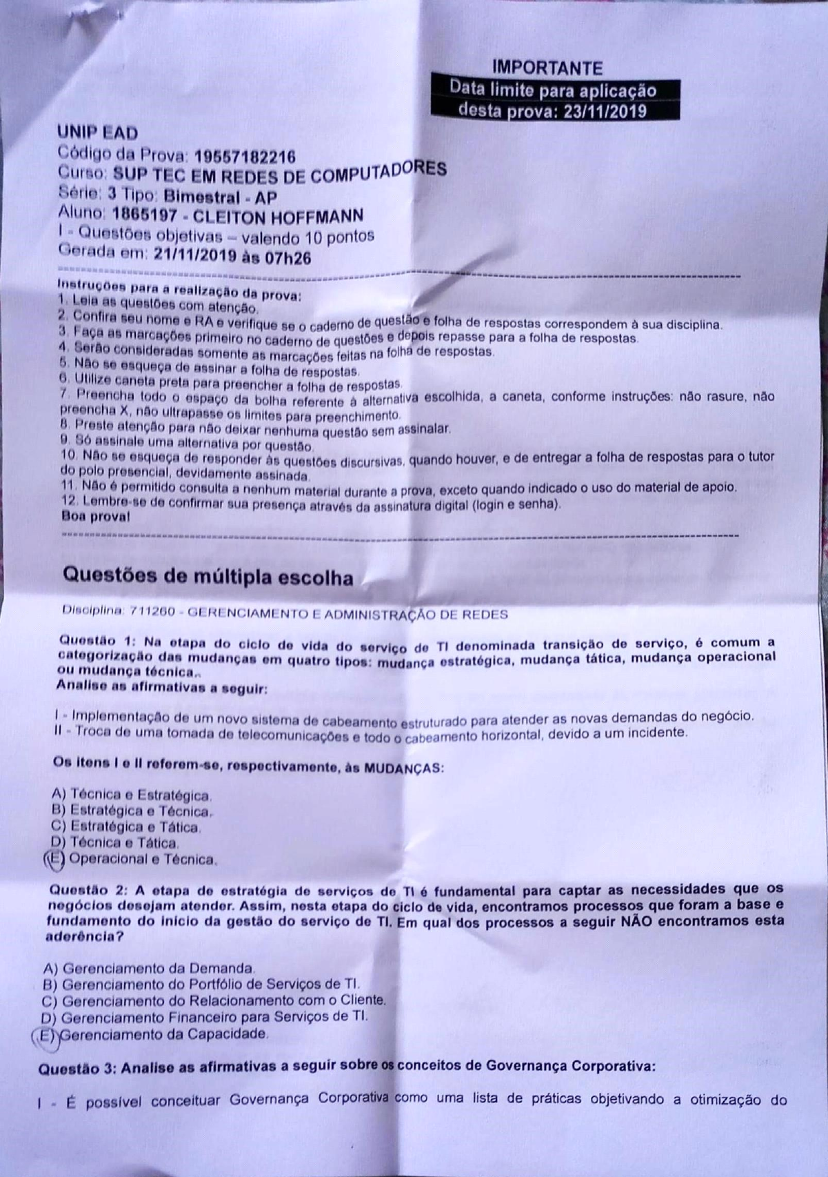 IMPORTANTE Data limite para aplicação desta rova: 23/11/2019 UNIP Código da Prova: 19657182216 CUI(OO: SUP TEC EM REDES DE COMPUTADOREs Sólio: 3 Tipo: Bimogtral - AP Aluno: j065197 • CLEITON HOFFMANN I • objotivas valendo 10 pontos em, 21/11/2019 às 07h26 inatroçOos para roallzaçao da prova:Leio as questOes com atençaow2. Confira ag nome e RA primeiro verifique no caderno o caderno de de questao•e e depois folha repasse de respostas para a folha correspondem de respostas. à sua disciplina.30 Faça 4. O, Sorno NOO 50 conoidoradao esqueça do againar somente a folha ao marcaçoos de regpostag• feitas na folha de respostas. 0. Utilizo canota prota pata proonchor a folha de respostasProoncha todo o ogpaço da bolha alternativa escolhida, a caneta, conforme instruçOes: nao rasure, não proencha mao ultrapasso 00 limitos para preenchimentO, 0, Prooto atonçâo para nOo deixar nenhuma questâo sem assinalar. 0, Oó assinalo uma alternativa por quostao. IO, NOO 00 ooquoço do rogpondor às quogtoos discursivas, quando houver, e de entregar a folha de respostas para o tutor do polo proooncial, d0Vidomonto assinada NOO O pormitido consulta o nonhutn material durante a prova. exceto quando indicado o uso do material de apoio. 12, l.ombro.oo do confirmar gua prooonça através da assinatura digital (login e senha). Boa prova' Questóes de múltipla escolha • OEIRENCIAMENTO E ADMINISTRAÇÃO DE REDES Quostao f: Na otapa do ciclo do vida do serviço do TI denominada transição do serviço, é comum a catogorizaçao das mudanças om quatro tipos: mudança ostratégica, mudança tática, mudança operacionalou mudança técnica.. Analiso ao afirmativas a soguir: I • Implomontaçao do um novo sistema de cabeamento estruturado para atender as novas demandas do negócio. II - Troca do uma tomada do telecomunicaç0es e todo o cabeamento horizontal. devido a um incidente. Os 'tons I o II roforom•so, rospoctivamonto, às MUDANÇAS: A) Técnica o Estratégica. B) Estratégica o Técnicae C) Estratégica e Tática, D) Técnica e Tática, (9 Operacional e Técnica, Quootao 2: A otapa do ostratégia do sorvicos do TI é fundamental para captar as necessidades que os nogócios dosojam atondor. Assim, nosta etapa do Ciclo de vida, encontramos processos que foram a base e fundamento do inicio da gostao do serviço do TI. Em qual dos processos a seguir NÃO encontramos esta adorôncia? A) Gerenciamento da Demanda, B) Gerenciarnento do Portfólio de Serviços de TI. C) Gerenciamento do Relacionamento com o Cliente. D) Gerenciamento Financeiro para Serviços de TI. (É?frerenciamento da Capacidade. Quostao 3: Analiso as afirmativas a seguir sobre os conceitos de Governança Corporativa: I • É possivel conceituar Governança Corporativa como uma lista de práticas objetivando a otimizaçáo do cleit Destacar cleit Substituir cleit Substituir xxxxxxxxxxxxxxxxxxxxxxxxxxxxxxxxxnullnullnullnullnullnull cleit Riscar cleit Ondulado cleit Retângulo cleit Retângulo cleit Linha desempenho de uma Corporação, - Governança Corporativa é também um mecantsrn0 ou fUndament0 em que se bawarn os dentro das organizaç0es. III - Infelizmente as práticas de Governança Corpora Uva levam ao conflito na relação de acionistas e gestores). É(sao) VERDADEIRA(S) a(s) afirmativa(s): ) II e III. C) I e III. E) II. Questão 4: Em qual das fases do ciclo do vida do 00 co encontramos os processos que tratam L Acordo de Nivel de Serviço? A) Estratégia do Serviço, (b Desenho do Serviço. C) Transição do Serviço. D) Operação do Serviço. E) Melhoria Continuada do Serviço. Questão 5: Por meio dessas rotinas e boas práticas, é possível colher e trabalhar com as ataústjcat de dedesempenho e de falhas, que devem ser constantemente coletadas, Essas estatísticas formam a baze conhecimento sobre problemas relacionados, favorecendo o encaminhamento de soluçOes rápidas e com impacto reduzido para os usuários. Qual das alternativas a seguir se refere ao Tempo Médio de Concerto? (d NO de horas ou dias de operação contínua antes da falha do componente, Média de minutos ou horas até que o dispositivo ou circuito que falhou esteja novamente operacional C) Média de minutos até que a raiz da causa da falha seja diagnosticada corretzrnentw D) Média de minutos ou horas até que o pessoal de servi chegue ao local do problema para começara traba;nar nele. E) Mostra a rapidez com que o pessoal de manutençZop e corrigi/ o problema apog chegar Questão 6: Analise as afirmativas a seguir, os conceitos de serviços do TI o sua gostho•, I - Um serviço de TI entrega valor por meio de ferramentas e recursos de infraestrutura de TI em 'Jota da satiEfae,40 dos clientes. II - Gerenciar serviços de TI e produtos (infraestrutura) de TI é em suma desenvolver as mesmas ativídades. A principal diferença é que em serviços, deixamos de ter a pessoa do cliente,III - O gerenciamento de serviços de TI é uma composiçao especializada de habilidades organtzacionais gue na forma de serviços de TI entregam valor aos clientes. É CORRETO apenas o que se afirma em: B) II. C) III. Oleil. E) I e III. Questão 7: O Acordo de Nível de Serviço (ANS) é celebrado entre o provedor de serviços de TI e o cliente que recebe os serviços de TI. Os ANS podem ser classificados como: A Baseados no Serviço / Baseados no Cliente I Multinlvel. ) Baseados no Serviço / Baseados no Protocolo I Multinível, C) Baseados no Serviço / Baseados na Entrega I Multitarefa. D) Baseados na Entrega / Multinível I Multitarefa. E) Baseados na Entrega / Baseados no Protocolo I Baseados no Cliente. Questão 8: Pode-se definir administração de redes como um conjunto de tarefas com o intuito de planejar, operar, controlar e monitorar as redes de computadores. A administração das redes pode ser dividida em seis funções básicas. A função que está relacionada à garantia de que a rede funcione de forma adequada, eficiente e conforme planejado 