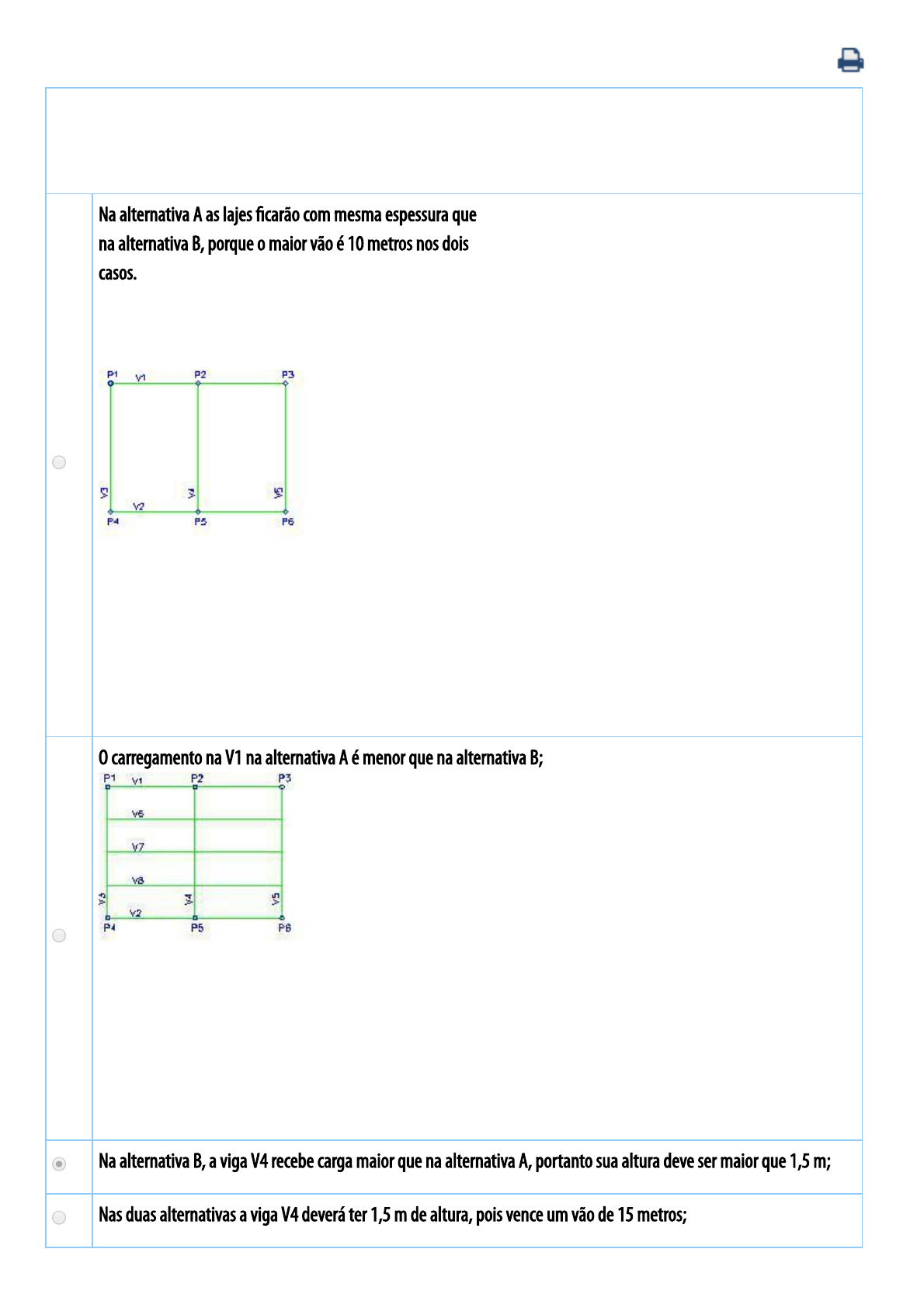 21/11/2019 Universidade Paulista - UNIP : Disciplina On-line. https://www.unip.br/presencial/central/Interna.aspx 1/2 Os desenhos abaixo representam esquema uni�lar (indicando os eixos das vigas e pilares) de duas alternativas possíveis para uma estrutura destinada a cobrir uma área de 20m x 15m, sem pilares intermediários. Pode-se a�rmar que: A Na alternativa A as lajes �carão com mesma espessura que na alternativa B, porque o maior vão é 10 metros nos dois casos. B O carregamento na V1 na alternativa A é menor que na alternativa B; C Na alternativa B, a viga V4 recebe carga maior que na alternativa A, portanto sua altura deve ser maior que 1,5 m; D Nas duas alternativas a viga V4 deverá ter 1,5 m de altura, pois vence um vão de 15 metros; 21/11/2019 Universidade Paulista - UNIP : Disciplina On-line. https://www.unip.br/presencial/central/Interna.aspx 2/2 E A carga no pilar P1 na alternativa A é maior que na alternativa B; Você já respondeu e acertou esse exercício. A resposta correta é: C. 21/11/2019 Universidade Paulista - UNIP : Disciplina On-line. https://www.unip.br/presencial/central/Interna.aspx 1/1 Um cliente, dono de uma construtora, aparece em seu escritório com um projeto que pretende executar, para consultá-lo sobre as possibilidades de utilização de alguns tipos de lajes nas estruturas. Trata-se de um edifício comercial, com as seguintes características principais: - área de projeção da ordem de 24m x 30m. - edifício sem subsolos. - piso térreo sem laje (piso em lastro de concreto magro lançado sobre o terreno). - 1º, 2º e 3º pisos com as mesmas dimensões e utilizações muito parecidas. - laje de cobertura sobre boa parte do 3º piso – cerca de 70%. O resto do 2º piso �cará descoberto, funcionando como terraço. - inexistência de balanços. - vigas e pilares de concreto armado. - vãos variando de 4m a 6m. - estrutura �nal em concreto revestido, não aparente. - não há necessidade de urgência na obra. Com base nesses dados você pode a�rmar que a tipologia mais adequada para as lajes da estrutura é: A lajes tipo steel-deck B lajes alveolares protendidas C lajes maciças em concreto protendido D lajes nervuradas E lajes em concreto armado, moldadas no local ou pré-moldadas Você já respondeu e acertou esse exercício. A resposta correta é: E. 21/11/2019 Universidade Paulista - UNIP : Disciplina On-line. https://www.unip.br/presencial/central/Interna.aspx 1/1 Dentre os critérios práticos para a estruturação de edi�cações, para os casos gerais, indique a alternativa errada: A O posicionamento de vigas e pilares, de uma forma genérica não depende das cargas de utilização futura da edi�cação, embora suas dimensões possam variar em função dessas cargas. B As vigas devem ser locadas de forma que os panos de laje resultem com dimensões de mesma ordem de grandeza. C Sempre que possível, as vigas devem ser colocadas sob as alvenarias, pois como as vigas possuem rigidez superior à das lajes, suas deformações são menores. D Os pilares devem ser posicionados sem descontinuidade, da fundação até a cobertura, evitando assim vigas de transição, que encarecem a estrutura. E Os pilares de canto devem ser locados de maneira que possuam sempre as mesmas dimensões que os pilares internos. Você já respondeu e acertou esse exercício. A resposta correta é: E. 21/11/2019 Universidade Paulista - UNIP : Disciplina On-line. https://www.unip.br/presencial/central/Interna.aspx 1/1 São consideradas ações diretas sobre as estruturas: A cargas permanentes e cargas variáveis B efeitos térmicos C retração do concreto D �uência E �ambagem Você já respondeu e acertou esse exercício. A resposta correta é: A. 21/11/2019 Universidade Paulista - UNIP : Disciplina On-line. https://www.unip.br/presencial/central/Interna.aspx 1/1 Tendo-se duas vigas em concreto armado bi-apoiadas com comprimentos e carregamentos idênticos, pode-se dizer que: A aquela que apresentar maior momento de inércia à �exão terá melhores condições de resistência à �exão B aquela que apresentar menor momento de inércia à �exão terá melhores condições estruturais para ser calculada C o tipo de apoio das vigas não interfere na estabilidade da estrutura D o tipo de engaste não interfere na estabilidade da estrutura E a altura das vigas não necessita ser levada em conta nos cálculos da estrutura Você já respondeu e acertou esse exercício. A resposta correta é: A. 21/11/2019 Universidade Paulista - UNIP : Disciplina On-line. https://www.unip.br/presencial/central/Interna.aspx 1/1 Parâmetro levado em consideração no dimensionamento dos pilares em concreto armado: A excentricidade B bordos das lajes C engastamento da laje D apoio das vigas E impermeabilização rígida Você já respondeu e acertou esse exercício. A resposta correta é: A. 21/11/2019 Universidade Paulista - UNIP : Disciplina On-line. https://www.unip.br/presencial/central/Interna.aspx 1/1 Os desenhos de formas abaixo apresentam duas soluções para a estrutura do mesmo pavimento de uma edi�cação, uma com um pilar central P4, outra sem o pilar central. A solução A está desenhada do lado esquerdo, e a solução B do lado direito. Para essas duas soluções, as medidas da edi�cação são as mesmas. Com base na análise dessas duas soluções, pode-se a�rmar que: A O carregamento na V1 na solução A é menor que na solução B; B Na solução A, a viga V5 se apóia no P4, e na solução B, a viga V5 se apóia na viga V2 porque a V2 vence um vão maior; C Nas duas soluções a viga V5 não consegue receber a carga da viga V2 porque seu valor é muito elevado; D A carga no pilar P1 na solução A é maior que na solução B; E O dimensionamento das lajes é idêntico para as duas soluções; Você já respondeu e acertou esse exercício. A resposta correta é: E. 21/11/2019 Universidade Paulista - UNIP : Disciplina On-line. https://www.unip