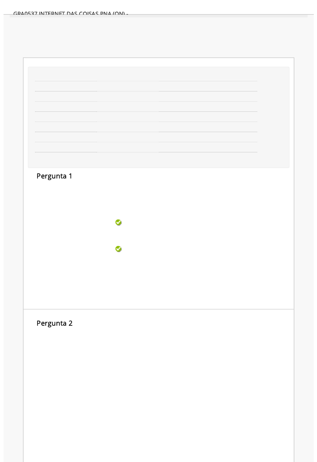 Revisar envio do teste: ATIVIDADE 3 GRA0537 INTERNET DAS COISAS PNA (ON) - Unidade 3 Revisar envio do teste: ATIVIDADE 3 Usuário Curso Teste Iniciado Enviado Status GRA0537 INTERNET DAS COISAS PNA ATIVIDADE 3 Completada Resultado da tentativa 2 em 2,5 pontos Tempo decorrido 2 horas, 30 minutos Resultados exibidos Respostas enviadas, Respostas corretas, Comentários Pergunta 1 Resposta Selecionada: Resposta Correta: Feedback da resposta: A cláusula select possui diversos comandos que quando são executados juntos resultam em resultados diversos. A partir disso, a gama de possíveis resultados que podemos obter em uma consulta é enorme. Sobre o comando Between, podemos afirmar que: Serve para quando precisamos selecionar valores entre um intervalo de dados. Serve para quando precisamos selecionar valores entre um intervalo de dados. Resposta Correta: O comando Between têm a função de verificar uma comparação de valores entre um intervalo de dados, assim, por exemplo, podemos retornar dados que estão entre 20 e 30. Pergunta 2 A falta de uma cláusula WHERE indica que não há condição sobre a seleção de linhas de uma tabela, sendo assim, serão retornados todas as linhas existentes na tabela utilizando o comando de consulta. Considere uma tabela de nome BATIMENTOS, com os campos cod, bat_cardiaco, horário e pressão. Com base nos dados exposto e os conceitos apresentados no texto-base da disciplina, analise as asserções a seguir e a relação proposta entre elas: I – Para se realizar uma consulta e obter como resposta os dados dos batimentos a partir da verificação do batimento cardíaco sendo maior ou igual a 73 e pressão = 12:8, o comando a ser executado é: SELECT * FROM batimentos WHERE bat_cardiaco >= 73 AND pressao = “12:8”. Porque 0,25 em 0,25 pontos 0,25 em 0,25 pontos Resposta Selecionada: Resposta Correta: Feedback da resposta: II – A atualização de registros a respeito de pressão arterial que possuem pressão igual a 15:9 para o novo valor de 12:8, deve acontecer a partir do comando UPDATE SET pressao = “12:8” batimentos WHERE cor = “15:9”. A seguir, assinale a alternativa correta: A asserção I é uma proposição verdadeira, e a II é uma proposição falsa. A asserção I é uma proposição verdadeira, e a II é uma proposição falsa. Resposta Correta. A asserção I é uma proposição correta, com as especificações do batimento cardíaco sendo maior ou igual a 73 e pressão = 12:8, a seleção de todos os dados dos batimentos é feito pelo comando SELECT * FROM batimentos WHERE bat_cardiaco >= 73 AND pressao = “12:8”. Pergunta 3 Resposta Selecionada: Resposta Correta: Feedback da resposta: Ao trabalhar com banco de dados estamos trabalhando com uma Linguagem de Consulta Estruturada, ou simplesmente SQL. É nesta linguagem que temos os comandos de inserir, atualizar, excluir, selecionar, e diversas outras cláusulas que irão nos auxiliar na manipulação dos dados. Analise a tabela abaixo: umidade temperatura umi_Ar 30 90 35 60 25 65 15 31 22 15 Fonte: Elaborada pelo autor. Considerando as informações expostas e o conteúdo do texto-base, o comando que devemos executar para as temperaturas de valor 30 e valor 25 é: SELECT temperatura FROM umidade WHERE (temperatura = 30 AND temperatura = 25). SELECT temperatura FROM umidade WHERE (temperatura = 30 AND temperatura = 25). Resposta Correta. A alternativa está correta, pois como queremos somente a temperatura e como cláusula os valores 30 3 25, devemos aplicar o comando de seleção e utilizar o operador de comparação AND. Assim, o comando correto deverá ser: SELECT 0,25 em 0,25 pontos temperatura FROM umidade WHERE (temperatura = 30 AND temperatura = 25); Pergunta 4 Resposta Selecionada: Resposta Correta: Feedback da resposta: Comandos e dados devem ser verificados para melhor performance na sua execução. A partir da verificação, podemos verificar determinados erros e ainda corrigi-los antes da execução dos comandos. Considerando o exposto acima e os conceitos apresentados no texto-base da disciplina, analise as asserções a seguir e a relação proposta entre elas: I - O comando UPDATE DATA INTO temperatura SET grau = valor WHERE horario = valor2; está correto e possibilita a atualização de um dado na tabela denominada temperatura. Porque II – O comando DELETE FROM temperatura WHERE 35 <= 30 está correto e permite excluir registros da tabela temperatura. . A seguir, assinale a alternativa correta: As asserções I e II são proposições falsas. As asserções I e II são proposições falsas. Resposta Correta. A asserção I é uma proposição incorreta, e para estar correta deveria possuir a sintaxe como: UPDATE <nome da tabela> SET <nome da(s) coluna(s)> = valor WHERE <condição>. A asserção II é uma proposição incorreta, devendo possui a sintaxe: DELETE FROM <nome da tabela> WHERE <condição>, para que ela seja correta. Pergunta 5 Resposta Selecionada: Resposta Correta: Feedback da resposta: Parecido com o comando Between, temos o comando In. Comandos como este são muito utilizados em consultas para obter resultados específicos. Verifiquemos assim o trecho de comando abaixo: SELECT valor1 FROM umidade WHERE valor1 IN (35, 55, 75); Considerando o comando apresentado, é correto afirmar que o retorno de dados será: Todos os valores da coluna valor1 da tabela umidade, em que o valor corresponde a 35, 55 e 75. Todos os valores da coluna umidade da tabela valor1, em que o valor corresponde a 35, 55 e 75. Resposta Incorreta: Os valores retornados são especificamente os valores iguais a 35, 55 e 75, sendo assim, não serão retornados valores entre o intervalo 55 e 75 e nem entre 35 e 75, nem valores maiores que 35. 0,25 em 0,25 pontos 0 em 0,25 pontos Pergunta 6 Resposta Selecionada: Resposta Correta: Feedback da resposta: Na maioria dos comandos de manipulação de dados, podemos nos utilizar do auxílio de operadores relacionais, ou ainda, operador