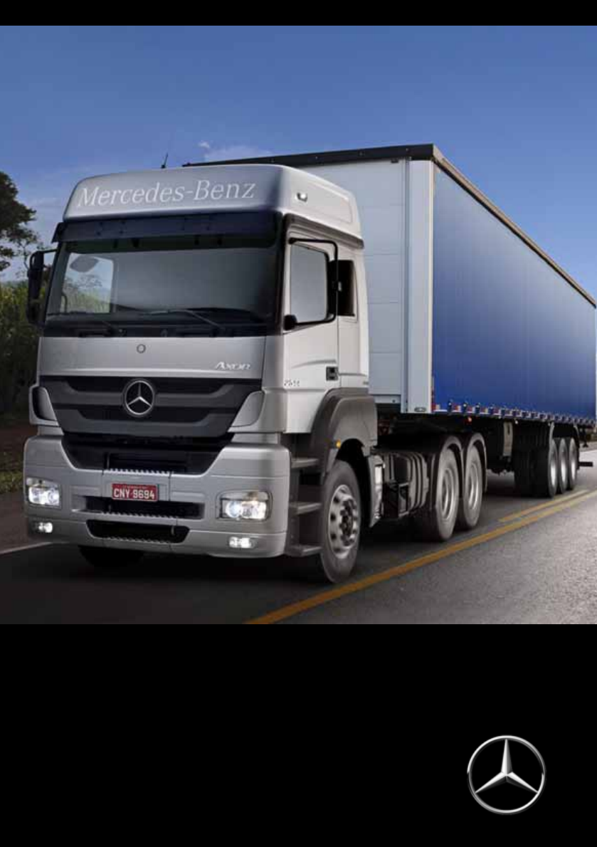 Axor Manual de Operação Símbolos G Advertências (riscos de acidentes) H Notas sobre o meio ambiente G Riscos de danos no veículo iInformações adicionais XIndicação de procedimentos (página) Indicação da página com informações adicionais sobre o assunto é a tecnologia Mercedes-Benz de pós-tratamento dos gases de escape por Redução Catalítica Seletiva (SCR) aplicada aos seus veículos comerciais (caminhões e ônibus) para atender às exigências da norma brasileira, que equivale à norma europeia Euro 5 e que, por meio do Programa de Controle de Poluição do Ar por Veículos Automotores (PROCONVE), fase P7, estabelece os limites máximos admissíveis de emissões de gases e materiais particulados para os veículos comerciais a diesel com peso bruto total (PBT) acima de 3.856 kg e fabricados a partir de janeiro de 2012. Abasteça seu veículo somente com óleo diesel com baixo teor de enxofre Para garantir o funcionamento adequado do sistema de pós-tratamento dos gases de escape BlueTec5®, os veículos com motor em conformidade com o PROCONVE P7 (Euro 5) devem ser abastecidos com óleo diesel com baixo teor de enxofre (óleo diesel S50 ou S10). Utilizar óleo diesel com alto teor de enxofre, além de aumentar consideravelmente os níveis de emissões de gases e materiais particulados, fazendo com que o veículo não esteja em conformidade com as exigências da norma, danifica os componentes do sistema de injeção e de pós-tratamento dos gases de escape e aumenta o desgaste dos cilindros e dos anéis de segmento dos motores. ARLA 32 No Brasil, o produto ARLA 32 (Agente Redutor Líquido de NOx Automotivo) é um reagente químico à base de ureia, essencial para o funcionamento do sistema de pós- tratamento dos gases de escape BlueTec5®. O produto também é conhecido como AdBlue® na Europa e DEF (Diesel Exhaust Fluid) nos EUA. O veículo com motor em conformidade com o PROCONVE P7 (Euro 5) deve estar sempre abastecido com ARLA 32, pois o funcionamento do motor sem este produto eleva consideravelmente os níveis de emissão de NOx (óxido de nitrogênio), fazendo com que o veículo deixe de atender às determinações legais de proteção ao meio ambiente. Bem-vindo ao mundo da Mercedes-Benz! Antes de iniciar sua primeira viagem, leia este Manual de Operação para familiarizar- se com a operação, condução, controles e sistemas de conforto do seu veículo, pois isso ajudará a aproveitar as vantagens operacionais do veículo e reduzirá os riscos de uma operação inadequada que possam colocar você e outras pessoas em perigo. Leia também o manual de instruções fornecido pelo implementador do veículo porque ele contém as instruções para usar os componentes da carroceria e aos equipamentos adicionais instalados pelo implementador. Como a especificação liberada para o seu veículo pode variar de acordo com o equipamento solicitado, algumas descrições e ilustrações podem ser diferentes dos equipamentos nele instalados. Se a operação equipamentos disponíveis em execuções especiais precisar de explicações, elas estarão descritas neste Manual de Operação. O seu veículo foi homologado para ser utilizado no país onde foi comercializado e pode não atender às determinações legais de outros países. Em alguns países, os veículos podem ter equipamentos específicos, equipamentos opcionais com disponibilidade limitada ou produtos com diferentes designações. A qualidade dos serviços de montagem da carroceria e dos equipamentos adicionais em seu veículo também é um fator de extrema importância para a eficiência do veículo e para a durabilidade das peças e equipamentos instalados. Portanto, certifique-se de que estes serviços tenham sido executados de acordo com as diretrizes estabelecidas pela Mercedes- Benz que estão disponíveis na Internet no endereço www.mercedes-benz.com.br. Observe que qualquer complementação no veículo que não atenda às diretrizes estabelecidas pela Mercedes-Benz pode restringir o direito de garantia do seu veículo. A Mercedes-Benz do Brasil Ltda. reserva- se o direito de modificar desenhos, equipamentos, softwares e características técnicas a qualquer momento sem a obrigação de estender essas modificações aos veículos comercializados anteriormente. Por esta razão, nenhuma reclamação pode ser baseada nos dados, ilustrações ou descrições contidas neste Manual de Operação. Consulte o Concessionário ou Posto de Serviço Autorizado Mercedes-Benz para esclarecer suas dúvidas e obter maiores informações sobre as modificações que podem ser feitas em seu veículo e seus respectivos valores. O Manual de Operação, o Manual de Manutenção e outros suplementos específicos são partes integrantes do veículo e devem ser mantidos a bordo do veículo. Em caso de venda do veículo, entregue-os ao novo proprietário. A equipe de literatura técnica da Mercedes-Benz do Brasil Ltda. deseja-lhe uma condução segura e confortável. A Mercedes-Benz não só produz veículos com a mais avançada tecnologia, mas também oferece assistência técnica para mantê-los em perfeitas condições de operação por meio de uma rede de Concessionários ou Postos de Serviços Autorizados Mercedes-Benz no Brasil e na América Latina. Portanto, se seu veículo precisar de manutenção, reparo ou apresente algum problema, leve-o a um Concessionário ou Posto de Serviço Autorizado Mercedes- Benz. Concessionários e Postos de Serviços Autorizados no Brasil Para encontrar o Concessionário ou Posto de Serviço Autorizado Mercedes-Benz mais próximo de você, consulte a Central de Relacionamento com o Cliente Mercedes- Benz (24h) ou acesse o site: www.mercedes-benz.com.br Central de Relacionamento com o Cliente Mercedes-Benz telefone: 0800 970 90 90 Concessionários ou Postos de Serviços Autorizados Mercedes-Benz na América Latina Para encontrar um Concessionário ou Posto de Serviço Autorizado Mercedes- Benz na
