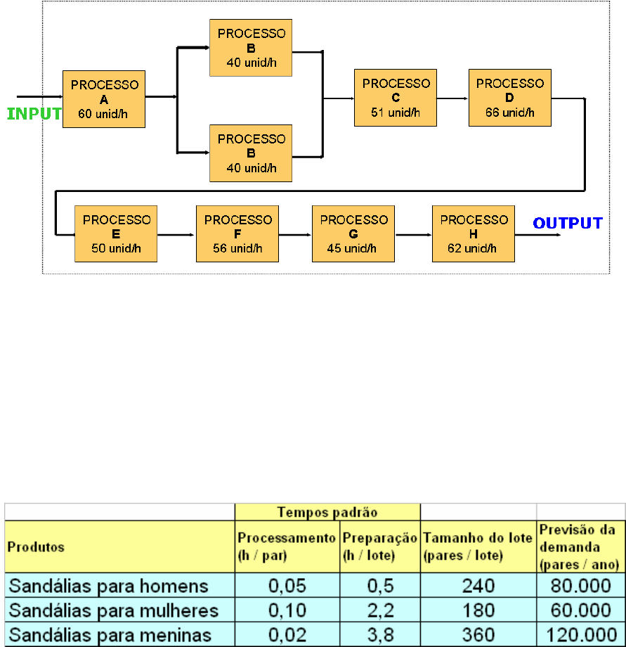 Exercícios propostos Capacidade de produção. Aluno: __________________________________________________ 1) Determine a capacidade do sistema de produção abaixo. Qual é o valor do output neste sistema ? 2) Você foi solicitado a elaborar um plano de capacidade para um gargalo crítico na empresa X de sandálias. Sua medida de capacidade é o número de máquinas. Existem três produtos (sandálias para homens, mulheres e meninas). Os tempos padrão (processamento e preparação), os tamanhos do lote e as previsões de demanda são fornecidos na tabela a seguir. A empresa opera dois turnos de oito horas, cinco dias por semana, 50 semanas por ano. A experiência indica que uma reserva de capacidade de 5% é o suficiente. a) Quantas máquinas são necessárias ? b) Se a operação possui atualmente 2 máquinas, qual é a falta de capacidade? 3) Lucia e João Oliveira possuem um pequeno escritório de contabilidade e um computador pessoal. Se seus clientes mantiverem registros organizados, qualquer um dos donos poderá usar o computador para preparar uma declaração do imposto de renda por hora, em média. Durante as primeiras duas semanas de abril ambos trabalham turnos distintos de 12 horas. Isso lhes permite usar seu computador ininterruptamente. a) Qual é o pico de capacidade, medido em declarações por semana (7 dias)? b) Os sócios normalmente trabalham das 9 às 19 horas, cinco dias por semana. Qual é sua capacidade efetiva, medida em declarações por semana? c) Durante a terceira semana de janeiro, o casal processou 40 declarações. Qual é a sua utilização, medida como porcentagem da capacidade efetiva? 4) As indústrias Próton querem começar a fabricar uma série de placas (todas de design similar) que ela anteriormente havia comprado de um fornecedor externo. Para fazer isto, ela precisa instalar um centro de usinagem com prensas. Dois produtos produzidos pela Próton exigirão placas das máquinas. Um exigirá aproximadamente 11.000 peças por ano; o segundo exigirá 6.000 peças por ano. A placa para o primeiro produto deverá exigir seis minutos (0,1 hora) para produzir, será necessária em lotes de 200, e necessitará de aproximadamente 15 minutos (0,25 hora) de tempo de preparação de máquina. A placa para o segundo produto leva 9 minutos (0,15 hora) para fabricar, será necessária em lotes de 300 peças e exige 24 minutos (0,4 hora) de tempo de preparação. A Próton opera 302 dias por ano e possui um turno de 7,5 horas por dia. A administração decidiu por uma reserva de capacidade de 20 por cento. a) Calcule a necessidade de capacidade e o Número de máquinas necessárias. 5) Uma prensa pode produzir 1.500 placas por dia sob condições ideais, enquanto 700 peças por dia é considerado uma taxa mais realista de operação. Atualmente, seu operador produz uma média de 810 placas por dia na máquina. Qual é sua utilização (expressa como porcentagem) relativa à sua capacidade pico e à sua capacidade efetiva? 6) Uma fábrica de rodas estampadas deseja instalar um número de prensas que seja suficiente para produzir 1.000.000 de rodas por ano. Cada prensa deve trabalhar em 2 turnos de 8 horas por dia, com um trabalho útil de 6,9 horas/ turno, e produzir uma roda a cada 0,8 minutos. Considerando que existe uma perda de 1% na produção e que o ano tem 300 dias úteis, quantas prensas são necessárias para atender à demanda estipulada? 7) Uma fábrica de condicionadores de ar produz três modelos diferentes: o de luxo, o padrão e o econômico. O modelo de luxo pode ser montado em 1,5 hora, o padrão, em 1 hora e o econômico, em 0,75 horas. A área de montagem da fábrica tem disponibilidade de 800 horas de pessoal de montagem por semana. Se a demanda para unidades de luxo, padrão e econômica estiverem na proporção 2:3:2, a) o número de unidades produzidas por semana será ? b) Se mudar a proporção da demanda de unidades de luxo, econômica e padrão para 1:2:4, qual será o número de unidades produzidas por semana ? 8) A barbearia Barba new possui 4 cadeiras de barbeiro.Durante a semana anterior as férias de fim de ano e a semana após o carnaval a barbearia apresenta picos de demanda. Cortes de cabelo estilo militar levam 5 minutos cada, enquanto que outros estilos levam 20 minutos cada. Operando das 9 às 18 horas nos seis dias antes das férias de fim de ano a barbearia realizou 500 cortes de cabelo no estilo militar e 400 cortes nos outros estilos. Durante uma semana comparável de seis dias após o carnaval, a barbearia realizou 700 cortes de cabelo no estilo militar e 300 nos outros estilos. Durante qual destas semanas a utilização foi maior ? 9) Uma fábrica de frascos plásticos soprados deseja instalar um número de máquinas de sopro que seja suficiente para produzir 2.000.000 de frascos por ano. Cada máquina deve trabalhar 2 turnos de 8 horas por dia, porém com um trabalho útil de 7 horas / turno, produzindo 1 frasco a cada 15 segundos. Sabe- se também que existe uma perda de 3 % na produção por problemas de qualidade. Considerando que o ano tem 300 dias úteis, determine quantas máquinas de sopro são necessárias para atender a demanda estipulada? 10) Um produto tem um processo que utiliza as máquinas M1, M2, M3 e M4, cujos tempos por peça são dados pela tabela a seguir. Quantas máquinas de cada tipo são necessárias se a empresa deseja produzir 2000 peças por semana e tem jornada de trabalho de 40 horas semanais? 11) Uma fábrica de biscoitos está limitada em sua produção ao forno de cozimento de biscoitos. A demanda adicional a ser atendida é de 10.000 caixas de biscoito por mês e, apesar de haver uma variação de tempo de cozimento em função do tipo de biscoito, estima-se que este tempo seja de 5 minutos em média para uma quantidade de biscoitos correspondente a uma caixa. O novo forno que se pensa adquirir tem condição de trabalhar 22 horas por dia e 95% dos 30 dias disponíveis do mês, sendo o 
