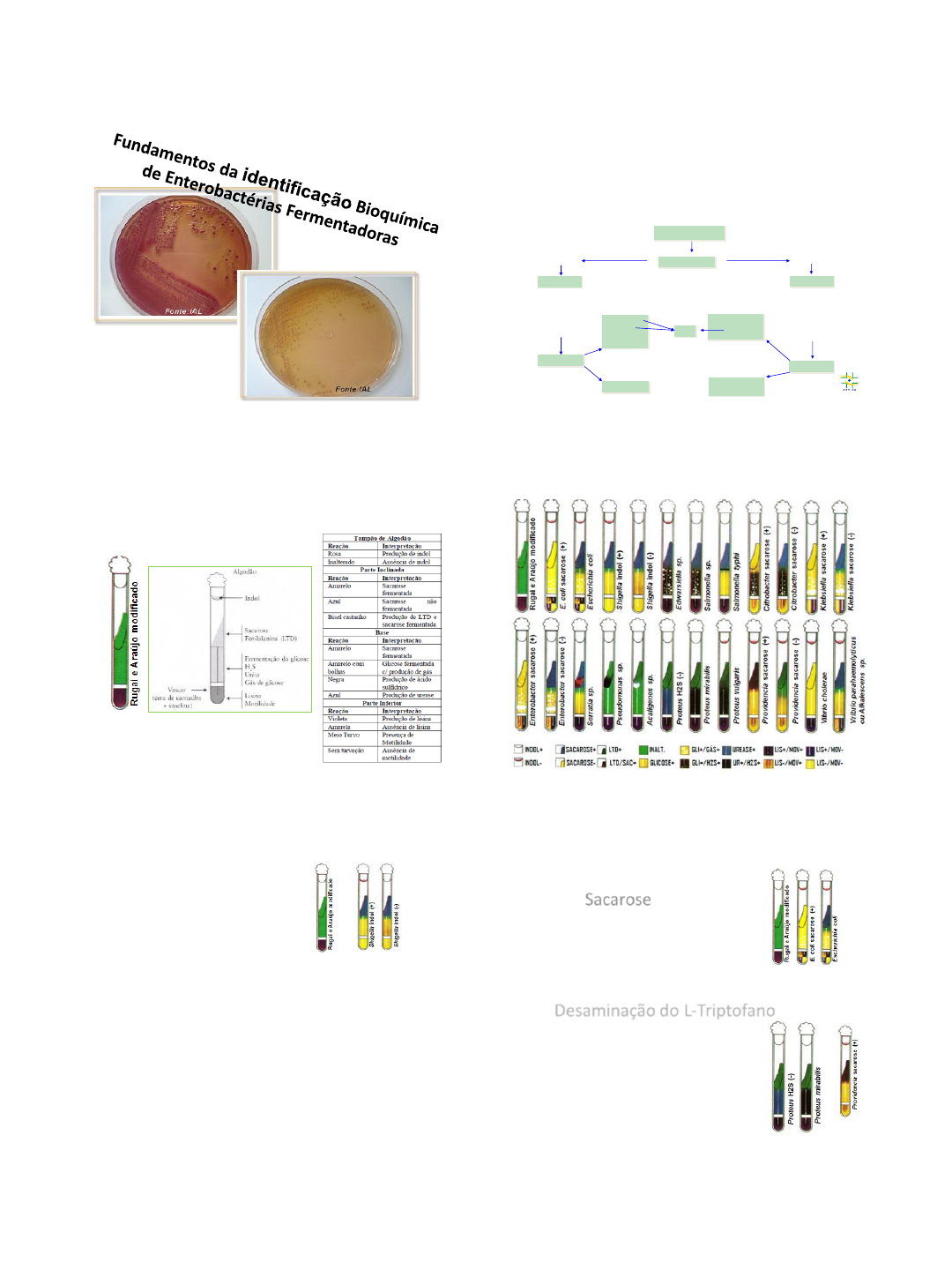 23/09/2018 1 Fluxograma BGN Oxidase Lac + Lac - E.coli Enterobacter Klebsiella Kluyvera Citrobacter Shigella Salmonella Serratia Proteus Providencia Morganella Ágar Mac Conkey IALIAL Cit. Simmons Cit. Simmons + Enterobacter Klebsiella Kluyvera Citrobacter - E.coli VP + + Salmonella Serratia Proteus/Prov.(V) - Shigella Morganella Meio de Rugai com lisina Meio de cultura diferencial destinado à triagem (identificação presuntiva) de enterobactérias oxidase negativas . Indol O objetivo é determinar a capacidade do micro-organismo degradar o aminoácido triptofano (presente em quase todas as proteínas) até indol. O triptofano é um aminoácido essencial que pode sofrer oxidação pelas atividades enzimáticas de algumas bactérias. A conversão do triptofano em produtos metabólicos é mediada pela enzima triptofanase. Como a capacidade de hidrolisar o triptofano com produção de indol (não é utilizado e acumula-se no meio) não é uma característica de todos os micro- organismos serve como marcador bioquímico. Há micro-organismos que não metabolizam o triptofano ou então fazem metabolização completa desse aminoácido sem produzir indol. O surgimento de uma cor vermelha caracteriza a prova positiva. Sacarose Fermenta a lactose ou a sacarose com viragem do indicador de todo o meio para amarelo. Deve ser lido no ápice do tubo. As bactérias produtoras de L-triptofanodesaminase promovem o escurecimento do meio. A cor produzida é o verde musgo (escuro), e a prova negativa se caracteriza pela manutenção da cor original do meio ou cor amarelada; Desaminação do L-Triptofano 23/09/2018 2 Glicose O surgimento de cor amarela na porção inferior de meio, caracteriza prova positiva, do contrário, o meio mantém-se inalterado; esta prova deve ser obrigatoriamente positiva para todas as enterobactérias. Produção de Gás Caso a bactéria em estudo produza gás a partir da glicose, irão se formar bolhas no interior do meio, podendo em alguns casos o meio pode chegar a se partir e sofrer deslocamento; Gás sulfídrico - H2S Bactérias que possuem a enzima tiossulfato redutase reagem com o tiossulfato de sódio, produzindo H2S, que é um gás incolor. A produção de gás sulfídrico é evidenciada pelo surgimento de coloração negra com intensidade variável na porção inferior do meio. Hidrólise da Uréia A urease cataliza a hidrólise da uréia em amônia e CO2, o que torna o meio alcalino. Considera-se a prova positiva quando há a formação de uma coloração azulada na porção inferior de meio. Descarboxilação da Lisina A descarboxilação da lisina resulta na formação de amina que torna o meio alcalino. Inicialmente o meio ficará amarelo indicando que a bactéria é viável, e no caso de haver a descarboxilação da lisina, o meio volta à cor púrpura original, do contrário, para prova negativa, o meio mantém-se amarelo. Motilidade Caso o crescimento bacteriano fique restrito à linha de picada, considera-se a motilidade negativa, do contrário, para a motilidade positiva há um crescimento difuso com turvação parcial ou completa do meio. Outros meios Meio EPM CONJUNTO EPM / MILI Base Produção de gás Formação de bolhas ou rachaduras no meio Produção de H2S Presença de pigmento negro de qualquer intensidade Hidrólise da Uréia Coloração azul esverdeada (fraca) na base indica prova positiva Superfície Desaminação do Triptofano Reação positiva – verde escuro ou acastanhado Reação negativa – superfície inalterada Meio MILI Motilidade: as imóveis crescem apenas na linha de picada. Descarboxilação da lisina: lisina positiva o meio torna-se roxo, na prova negativa o meio permanece amarelado nos 2/3 inferiores. Indol: a formação de um anel rosa na superfície do meio indica positividade para o indol. 23/09/2018 3 Citrato de Simmons Permite diferenciar micro-organismos atendendo à sua capacidade para usar o citrato como única fonte de carbono. Na ausência de glicose ou lactose fermentáveis, alguns micro-organismos são capazes de usar o citrato como única fonte de carbono para produzir energia. Não inoculado Fermentativo Oxidativo Meio OF – Oxidação – Fermentação Verificar a capacidade do micro- organismo em utilizar os carboidratos pela via oxidativa ou fermentativa. TSI – Triplo Açúcar Ferro Púrpura/amarelo (ápice púrpuro e base amarela) fermentação apenas da glicose (lactose e sacarose negativas) Amarelo/amarelo (ápice e base amarelos) fermentação da glicose + lactose e/ou sacarose (2 ou 3 açúcares) Presença de gás (CO2) bolhas ou meio fragmentado H2S positivo presença de precipitado negro Interpretação do resultado das reações encontradas no TSI FENILALANINA PRINCÍPIO Verifica a capacidade da bactéria de produzir ácido fenilpirúvico a partir da fenilalanina por ação enzimática. UTILIDADE Diferenciar gêneros e espécies de enterobactérias. OBS: A solução de cloreto férrico 10% é utilizada para revelar a atividade da enzima fenilalanina desaminase no meio de fenilalanina. CONTROLE DE QUALIDADE Positivo: Proteus vulgaris ATCC 8427 ou Proteus mirabilis ATCC 12453. Negativo: Escherichia coli ATCC 25922. URÉIA (CHRISTENSEN) PRINCÍPIO Determinar a habilidade do micro-organismo de degradar a uréia em duas moléculas de amônia pela ação da enzima urease, resultando na alcalinização do meio. UTILIDADE Bacilos Gram negativos fermentadores e não fermentadores, Staphylococcus e Haemophilus. CONTROLE DE QUALIDADE Esterilidade: colocar 100% do lote preparado na estufa 35 ±1°C por 24 horas. Se não houver mudança de cor liberar para uso. Positivo: Proteus vulgaris ATCC 13315 Negativo: Escherichia coli ATCC 25922 Vermelho de metila - VM O Meio MR VP é recomendado para a realização de testes de Vermelho Metila e Voges-Proskauer na diferenciação dos grupos coliaerógenos Caldo MR-VP. APLICAÇÃO E USO: Clark e Lubs descobriram que a adição de vermelho metil nas culturas de Escherichia coli