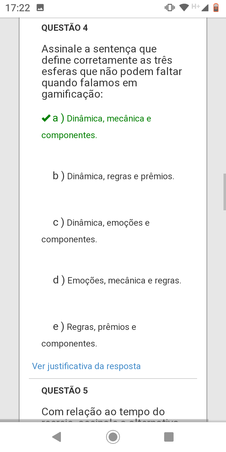 Assinale a sentenca que define corretamente as tres esferas que nao podem faltar quando falamos em gamificacao: a- Dinamica, mecanica e componentes. b- Dinamica, regras e premios. c- Dinamica, emocoes componentes. d- Emocoes, mecanica e regras. e- Regras, premios e componentes.