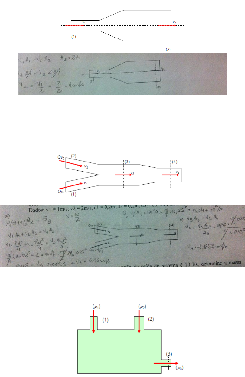 LISTA EXTRA DE EXERCICIOS 1. Água escoa na tubulação mostrada com velocidade de 2m/s na seção (1). Sabendo-se que a área da seção (2) é o dobro da área da seção (1), determine a velocidade do escoamento na seção (2). 2. Para a tubulação mostrada determine: a) A vazão e a velocidade no ponto (3). b) A velocidade no ponto (4). Dados: v1 = 1m/s, v2 = 2m/s, d1 = 0,2m, d2 = 0,1m, d3 = 0,25m e d4 = 0,15m. 3. Sabendo-se que Q1 = 2Q2 e que a vazão de saída do sistema é 10 l/s, determine a massa específica da mistura formada e calcule o diâmetro da tubulação de saída em (mm) sabendo-se que a velocidade de saída é 2m/s. Dados: ρ1 = 790kg/m³ e ρ2 = 420kg/m³. Correção: a resposta do diâmetro é 252mm 4. Determine a altura da coluna da água no reservatório de grandes dimensões mostrado na figura. Dados: ρh20 = 1000kg/m³ e g = 10m/s². 5. Água escoa em regime permanente através do tubo de Venturi mostrado. Considere no trecho mostrado que as perdas são desprezíveis. Sabendo-se que A1 = 2,5A2 e que d1 = 10 cm. Determine a vazão de água que escoa pelo tubo. 6. O reservatório mostrado na figura possui nível constante e fornece água com uma vazão de 15 litros/s para o tanque B. Verificar se a máquina é uma bomba ou uma turbina e calcule sua potência sabendo-se que η = 75%. Dados: γH2O = 10000N/m³, Atubos = 10 cm², g = 10 m/s². 7. A figura a seguir mostra parte de uma instalação de bombeamento de água. Considerando que a vazão é igual a 8 litros/s, que a tubulação possui o mesmo diâmetro ao longo de todo o seu comprimento e que os pontos (2) e (3) estão na mesma cota, determine a diferença de pressão entre a saída e a entrada da bomba. Dados: NB = 4cv, 1cv = 736,5W, η = 70%, ρH2O = 1000kg/m³ e g = 10m/s². 8. Deseja-se elevar água do reservatório A para o reservatório B. Sabe-se que a vazão é igual a 4 litros/s, determine: a) A velocidade da água na tubulação de sucção. b) A velocidade da água na tubulação de recalque. c) A potência da bomba. d) O tempo necessário para se encher o reservatório B. Dados: γH2O = 10000N/m³, g = 10m/s², dsuc = 8cm, drec = 4cm, VB = 15m³, ηB = 65%.