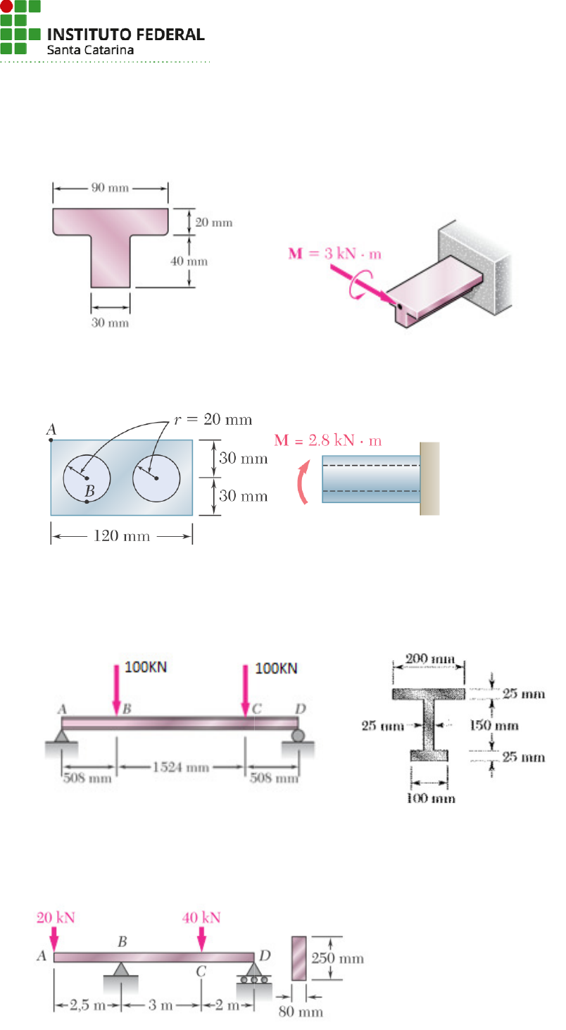 1 – Uma peça de máquina feita de ferro fundido está submetida a um momento conforme mostra a figura. Desprezando o efeito dos arredondamentos nas extremidades da peça, determine as tensões de tração e compressão máximas na peça fundida. (Resposta: σtração = 76 MPa; σcompressão 2 – Sabendo que o momento mostrado atua em um plano vertical, determine a tensão no (a) ponto A e (b) ponto B. (Resposta: σA = -44,02 3 – Duas forças verticais são Determine a tensão de tração e de (Resposta: σtração = 100,95 MPa; 4 – Para a viga de madeira e o carregamento mostrado na cortante e momento fletor, e determine a tensão máxima provocada pelo momento fletor. (Resposta: σmáx = 93,6 MPa) RESISTÊNCIA DOS MATERIAIS AULA 08 – FLEXÃO Prof.: Anderson José Antonietti Uma peça de máquina feita de ferro fundido está submetida a um momento figura. Desprezando o efeito dos arredondamentos nas extremidades da peça, determine as tensões de tração e compressão máximas na peça fundida. compressão = -131,3 MPa) Sabendo que o momento mostrado atua em um plano vertical, determine a tensão no (a) ponto A 44,02 MPa; σB = 29,35 MPa) Duas forças verticais são aplicadas à viga com a seção transversal mostrada na figura. tração e de compressão máximas da viga. MPa; σcompressão = -68,03 MPa) Para a viga de madeira e o carregamento mostrado na figura, trace os diagramas de força etor, e determine a tensão máxima provocada pelo momento fletor. RESISTÊNCIA DOS MATERIAIS Uma peça de máquina feita de ferro fundido está submetida a um momento fletor de 3 kN.m figura. Desprezando o efeito dos arredondamentos nas extremidades da peça, Sabendo que o momento mostrado atua em um plano vertical, determine a tensão no (a) ponto A transversal mostrada na figura. , trace os diagramas de força etor, e determine a tensão máxima provocada pelo momento fletor. 5 – Uma barra de seção transversal circular cheia, com diâmetro d e feita de aço, está vinculada, conforme mostra a figura. Sabendo que a densidade do aço é ρ = 7860 kg/m3, determine o menor diâmetro d que pode ser utilizado para que a tensão normal provocada pelo momento fletor não ultrapasse 28 MPa. Considere que g = 9,81 m/s². (Resposta: d = 25,58 mm) 6 – Uma barra de seção transversal quadrada cheia, de lado b e feita de aço, está vinculada, conforme mostra a figura. Sabendo que a densidade do aço é ρ = 7860 kg/m3, determine a dimensão b que pode ser utilizado para que a tensão normal provocada pelo momento fletor não ultrapasse 50 MPa. Considere que g = 9,81 m/s². (Resposta: b = mm) 7 – Utilize o método das seções para traçar os diagramas de força cortante e momento fletor para a viga e carregamento mostrados, e determine o valor máximo absoluto da força cortante e do momento fletor. a) b) c) d) e) f) 8 – Utilize o método gráfico de construção dos diagramas de esforço de corte e momento fletor e trace os gráficos para cada caso do exercício anterior.