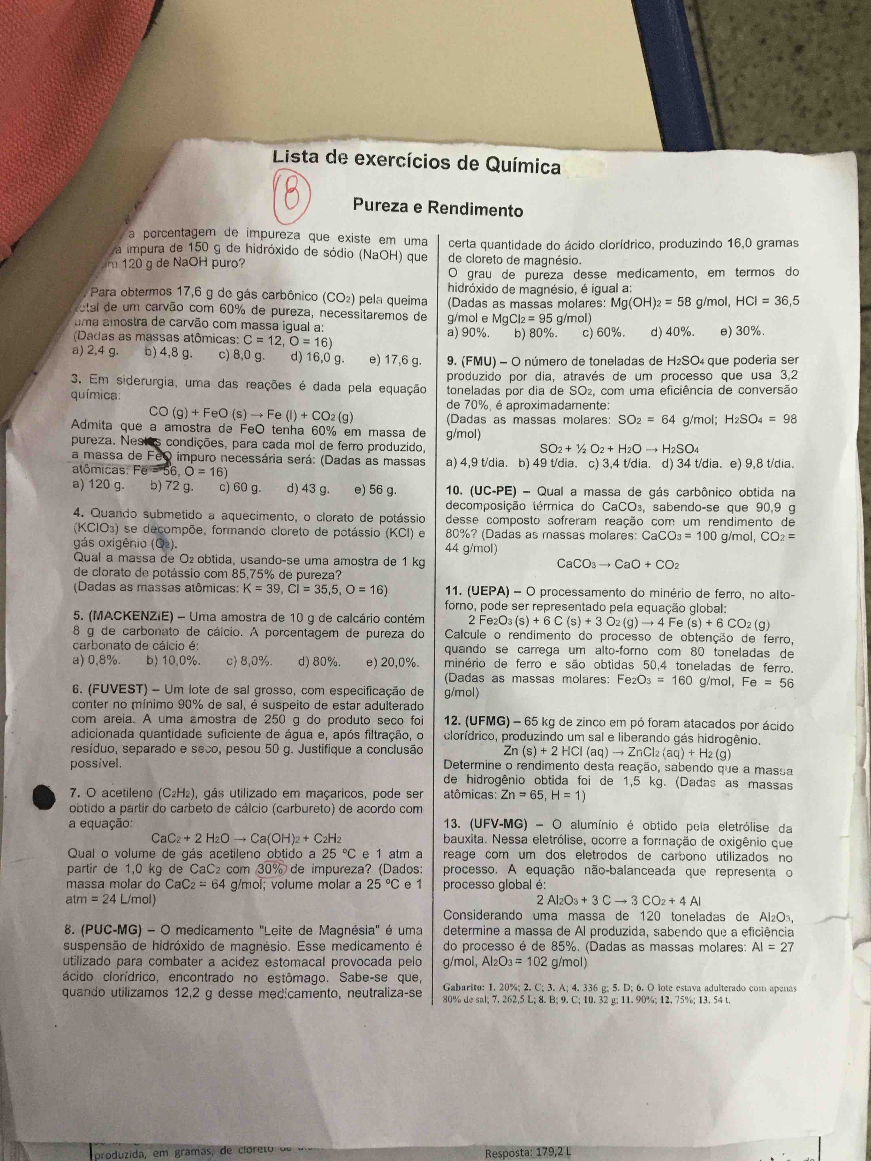 Quando se carrega um alto-forno com 80 toneladas de minério de ferro e são obtidas 50,4 toneladas de ferro, qual é a porcentagem de pureza do minério? a) 0.8% b) 10,0% c) 8,0% d) 80% e) 20,0%