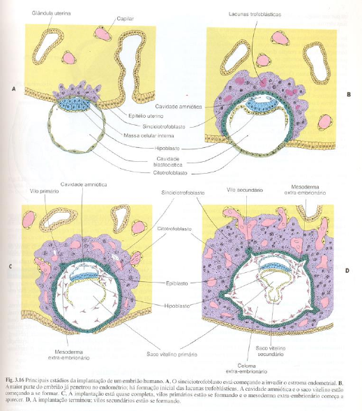 GASTRULAÇÃO FORMAÇÃO DAS CAMADAS GERMINATIVAS E DERIVADOS INICIAIS Ao implantar-se na parede do útero, a organização do embrião passa por profundas transformações. Até o momento da implantação, o blastocisto consiste na massa celular interna, da qual provêm o corpo do embrião propriamente dito, e no trofoblasto externo, que representa a futura interface entre o embrião e a mãe. Os dois componentes do blastocisto funcionam como precursores de outros tecidos, que aparecem em estádios subseqüentes do desenvolvimento. No item implantação vimos como o citotrofoblasto começa a dar origem a uma camada sincicial externa, o sinciciotrofoblasto, pouco antes de prender-se ao tecido uterino (Fig. 3.16). Logo depois, a massa celular interna começa a originar outros derivados teciduais. A subdivisão da massa celular interna acaba resultando em um corpo de embrião que contém as três camadas germinativas embrionárias: o ectoderma (camada externa), o mesoderma (camada média) e o endoderma (camada interna). O processo pelo qual as camadas germinativas são formadas através de movimentos celulares é denominado gastruIação. Após a formação das camadas germinativas, o avanço continuado do desenvolvimento do embrião depende de uma série de sinais, denominados induções embrionárias, trocados entre as camadas germinativas ou outros precursores de tecidos. Em uma interação indutiva, um tecido (o indutor) age sobre outro (o respondedor) de tal modo que o curso do desenvolvimento do último é diferente do que teria sido na ausência do indutor. ESTADIOS DAS DUAS CAMADAS GERMINATIVAS Pouco antes do implante do embrião no endométrio, no início da segunda semana, começam a ocorrer mudanças significativas na massa celular interna, assim como no trofoblasto. Com o rearranjo das células na massa celular interna em uma disposição epitelial, aparece uma fina camada de células ventralmente à massa principal de células (Fig. 3.16). A camada superior principal de células é conhecida como o epiblasto e a camada inferior é denominada hipoblasto ou endoderma primitivo. Não se sabe como o hipoblasto se forma nos embriões humanos, mas dados de embriologia comparada sugerem que as células destas camadas surgem por delaminação (separação) da massa celular interna, O hipoblasto é considerado um endoderma extra-embrionário e é ele que dá origem ao revestimento endodérmico do saco vitelino (Fig. 3.16). Depois do hipoblasto se tornar uma camada bem definida e o epiblasto ter assumido um aspecto epitelial, a antiga massa celular interna transformou-se em um disco bilaminar, com o epiblasto situado na superfície dorsal e o hipoblasto na ventral. O epiblasto contém as células que vão constituir o embrião propriamente dito, mas tecidos extra-embrionários também provêm desta camada (Fig. 4.2). A próxima camada a surgir após o hipoblasto é o âmnio, uma camada de ectoderma extra-embrionário que acaba por envolver todo o embrião em uma câmara cheia de fluido denominada cavidade amniótica. Estudos com embriões de primatas indicam que uma cavidade amniótica primordial surge, primeiro, por cavitação (formação de um espaço interno), dentro do epiblasto pré-epitelial; ela é coberta por células que derivam da massa celular interna. Segundo alguns pesquisadores, o teto do âmnio abre-se, então, expondo a cavidade amniótica primordial ao citotrofoblasto sobreposto. Logo depois (cerca de 8 dias após a fertilização), o epitélio amniótico original torna a formar um teto sólido sobre a cavidade amniótica. Enquanto o embrião ainda está mergulhando no endométrio (cerca de 9 dias após a fertilização), células do trofoblasto começam a espalhar-se revestindo a superfície interna do citotrofoblasto com uma camada contínua de endoderma extra-embrionário denominado endoderma parietal (Fig. 4.2). Quando a difusão do endoderma termina, formou-se uma vesícula denominada saco vitelino (Fig. 3.16). Neste ponto (cerca de 10 dias após a fertilização), o complexo embrionário consiste em um disco germinativo bilaminar, localizado entre o saco vitelino primário, que fica na sua superfície ventral, e a cavidade amniótica, na superfície dorsal. Cerca de 12 dias após a fertilização, começa a aparecer outro tecido extra-embrionário, o mesoderma extra-embrionário (Fig. 4.2). Parece que as primeiras células mesodérmicas extra-embrionárias surgem da transformação de células endodérmicas parietais. A estas células juntam-se, mais tarde, células mesodérmicas extra-embrionárias que se originaram da linha primitiva. O mesoderma extra-embrionário torna-se o tecido que sustenta o epitélio do âmnio e do saco vitelino, assim como os vilos coriônicos, que provêm dos tecidos trofoblásticos. A sustentação dada pelo mesoderma extra-embrionário não é somente mecânica, mas também trófica, pois o mesoderma serve de substrato através do qual os vasos sangüíneos suprem os vários epitélios de oxigênio e nutrientes. GASTRULAÇÃO E AS TRÊS CAMADAS GERMINATIVAS EMBRIONÁRIAS No fim da segunda semana, o embrião consiste em duas camadas de células achatadas, o epiblasto e o hipoblasto. No início da terceira semana de gravidez, o embrião entra no período de gastrulação, durante o qual as três camadas germinativas do embrião ficam claramente estabelecidas. A morfologia da gastrulação humana segue o padrão das aves. Por causa da grande quantidade de vitelo existente nos ovos das aves, o embrião delas forma as camadas germinativas primárias como três discos achatados sobrepostos que repousam sobre o vitelo como uma pilha de panquecas. Somente mais tarde é que as camadas germinativas se dobram para formar um corpo cilíndrico. Apesar do ovo dos mamíferos ser essencialmente livre de vitelo, o conservantismo morfológico do desenvolvimento inicial ainda compele o embrião humano a seguir um padrão de gastrulação semelhante ao 