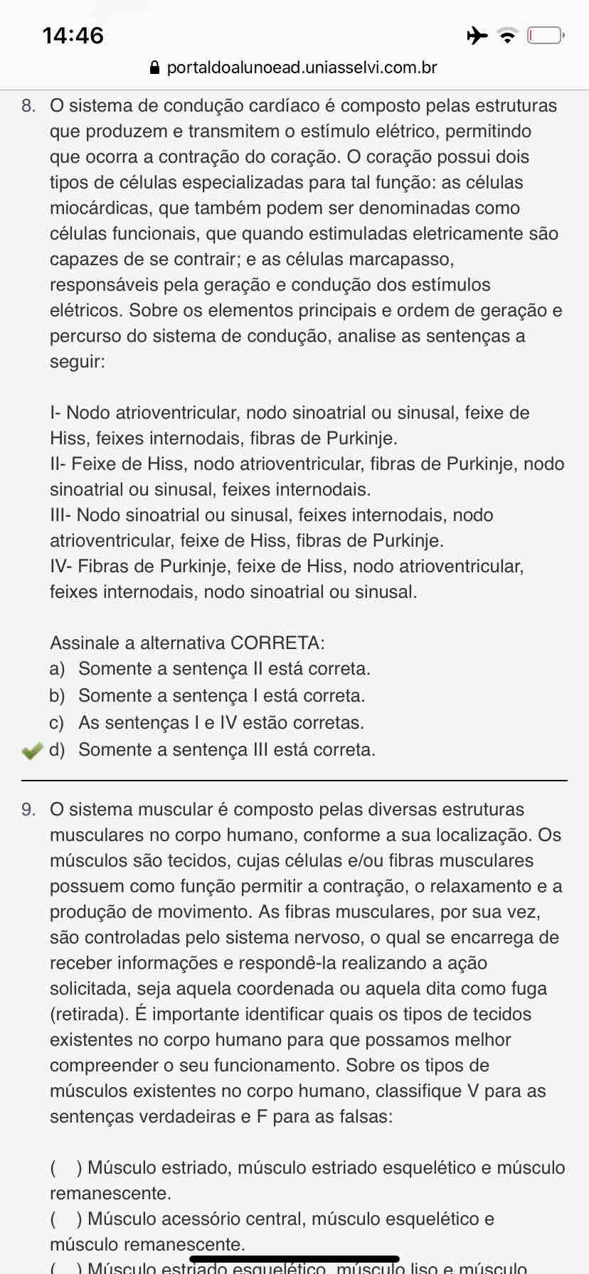 O sistema de condução cardíaco é composto pelas estruturas que produzem e transmitem estímulo elétrico, permitindo que ocorra a contração do coração. O coração possui dois tipos de células especializadas para tal função: as células miocárdicas, que também podem ser denominadas como células funcionais, que quando estimuladas eletricamente são capazes de se contrair; e as células marcapasso, responsáveis pela geração e condução dos estímulos elétricos. Sobre elementos principais e ordem de geração e percurso do sistema de condução, analise as sentenças a seguir. Assinale a alternativa CORRETA: I- Nodo atrioventricular, nodo sinoatrial ou sinusal, feixe de Hiss, feixes internodais, fibras de Purkinje. II- Feixe de Hiss, nodo atrioventricular, fibras de Purkinje, nodo sinoatrial ou sinusal, feixes internodais. III- Nodo sinoatrial ou sinusal, feixes internodais, nodo atrioventricular, feixe de Hiss, fibras de Purkinje. IV- Fibras de Purkinje, feixe de Hiss, nodo atrioventricular, feixes internodais, nodo sinoatrial ou sinusal. a) Somente a sentença I está correta. b) Somente a sentença II está correta. c) As sentenças I e IV estão corretas. d) Somente a sentença III está correta.
