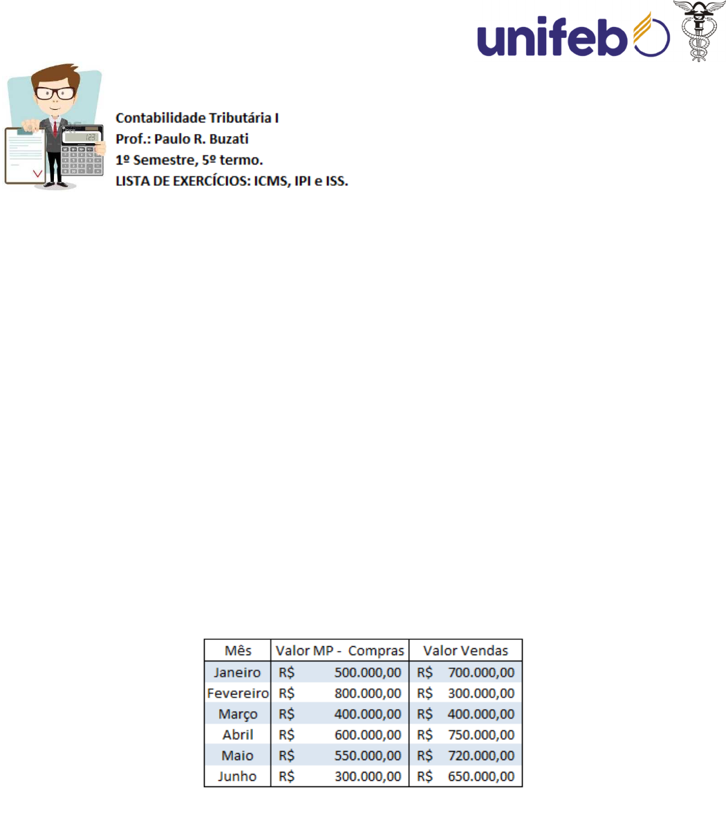 1 1) A empresa Elevada cobrou R$ 11.000,00 pelo serviço de manutenção de dois elevadores. Estão incluídas nesse valor as peças hidráulicas, no valor de R$ 2.300,00; as partes mecânicas, no valor de R$ 1.200,00 e as partes dos componentes elétricos, no valor de R$ 2.500,00. Sabendo-se que a alíquota de Imposto Sobre Serviços (ISS) é de 5%, o ISS devido pela Elevada, nesse serviço, em reais, é: a) R$ 250,00. b) R$ 325,00. c) R$ 365,00. d) R$ 385,00. e) R$ 500,00. 2) Sabendo que o contribuinte é obrigado a emitir uma nota fiscal para cada venda de mercadoria, quantas notas fiscais uma loja emitiu no mês de março sabendo-se se ele realizou 20 vendas por dia, trabalhando todos os dias? Sabendo-se que o ICMS devido em cada operação (= venda) é o produto entre o valor da mercadoria (chamada de base de cálculo) e a alíquota, qual é o valor do imposto de uma carga de couro que custa R$ 20.000,00 cuja alíquota aplicável é de 17%? Sabendo-se que para calcular o ICMS devido em cada venda é o produto entre o valor da mercadoria e a alíquota, qual é a alíquota que incidiu numa operação que a mercadoria custa R$ 30.000,00 e o ICMS devido foi de R$ 2.100,00? 3) Considerando uma alíquota de 10% de IPI para as operações de compras e de 12% para as operações de vendas, indique se as apurações mensais de ICMS e IPI foram DEVEDOR / CREDOR. A empresa e seus fornecedores estão localizados em SP. 4) Considerando os mesmos dados do exercício acima, suponhamos que esse contribuinte comercialize suas mercadorias como USO/ CONSUMO. Calcule o ICMS devido. 5) Na compra de uso consumo posso recuperar o crédito de ICMS e IPI? a) ( ) Apenas o ICMS. b) ( ) Apenas o IPI. c) ( ) Não, uso consumo não tem relação direta com produto final. 2 6) EFETUE A CONTABILIZAÇÃO DO SEGUINTE FATO: A empresa Terra Calçados Ltda. comprou do fornecedor Indústria de Calçados Vulcabrás S/A mercadorias no valor de R$ 98.664,00, conforme Nota Fiscal nº. 5.309, com ICMS incluso na Nota Fiscal, na alíquota de 17% e IPI na alíquota de 15%. A compra foi realizada com 25% a vista e 75% a prazo, mediante aceite de Duplicatas. 7) Continuando o exercício anterior, a empresa efetuou venda interna no estado de SP total do seu estoque, com incidência de 10% de IPI. Sabendo que o valor da venda à vista foi de R$ 120.000,00, apure os valores de ICMS e IPI a recolher e o resultado. 8) (Contador Junior-Petrobras-2010-Cesgranrio) Admita que uma empresa que importou uma máquina para o seu imobilizado apresentou as informações abaixo relativas a tal importação. • Valor da máquina, em dólar, declarado nos documentos de importação - US$ 50.000. • Valor da máquina fixado pela autoridade aduaneira para a base de cálculo do imposto de importação - US$ 54.000. • Imposto de Importação (II) = 10% • Taxa de câmbio na operação US$ 1 = R$ 1,50 • Imposto sobre Produtos Industrializados (IPI) = R$ 4.100,00 • Despesas aduaneiras = R$ 1.800,00 • Frete do porto até ao estabelecimento do importador = R$ 5.000,00 A base de cálculo do ICMS na importação dessa máquina, em reais, é: a) R$ 89.000,00. b) R$ 94.000,00. c) R$ 95.000,00. d) R$ 95.100,00. e) R$ 100.000,00. 9) (Contador Pleno-Petrobras-2005-Cesgranrio) Determinada empresa industrial vende mercadorias a prazo para uma empresa comercial, por R$ 1.500,00, mais R$ 100,00 de frete, com desconto de R$ 50,00, caso o pagamento se realize em até 30 dias. Sabendo que a alíquota de ICMS é de 20% e que a empresa industrial não possui créditos do imposto, o ICMS devido nesta operação, em reais, será: a) R$ 290,00. b) R$ 300,00. c) R$ 310,00. d) R$ 320,00. e) R$ 330,00. 10) (Contador Junior-Petrobras-2006-Cesgranrio) O Posto de Gasolina Dois Amigos Ltda., sob a bandeira da Petrobras, localizado no Rio de Janeiro, adquiriu, de um atacadista no Rio de Janeiro, mercadorias para a sua rede de lojas de conveniência, nas seguintes condições, inclusas na nota fiscal do fornecedor: • Valor da mercadoria, cobrado pelo fornecedor R$ 1.120.000,00. • Frete cobrado pelo fornecedor R$ 60.000,00. • Seguro cobrado pelo fornecedor R$ 12.000,00. • Desconto incondicional concedido pelo fornecedor R$ 112.000,00. Considerando que o Posto Dois Amigos Ltda. está sujeito à alíquota básica de ICMS de 19%, adotada no Estado do Rio de Janeiro, o valor, em reais, do ICMS, nesta operação, suportado pelo Posto Dois Amigos Ltda., é: a) R$ 212.800,00. b) R$ 205.200,00. c) R$ 202.920,00. d) R$ 193.800,00. e) R$ 191.520,00. 3 11) Considere uma empresa comercial que tenha comprado a prazo 600 unidades de uma determinada mercadoria, ao custo unitário de $ 30, pagando frete de $ 0,50 por unidade. Em seguida, tenha vendido metade dessas compras, emitindo nota fiscal de venda no valor de $ 12.000, com entrega em domicílio, pagando frete total de $ 320. Sabendo-se que não havia estoques iniciais, que o frete está isento de tributação, mas que as compras e vendas foram tributadas com ICMS à alíquota de 17%, assinale a opção que indica corretamente o lucro bruto alcançado na operação. a) R$ 3.490,00. b) R$ 2.465,00. c) R$ 2.340,00. d) R$ 2.170,00. e) R$ 2.020,00. 12) Entre as características de determinados impostos, estão a seletividade obrigatória, a não cumulatividade e a não incidência quando o bem ou o serviço destina-se ao exterior. Assinale a opção em que é apresentado imposto sobre o qual se aplicam as três características mencionadas. a) Imposto sobre produtos industrializados b) Imposto sobre a renda e proventos das pessoas jurídicas c) Imposto sobre serviços de qualquer natureza d) Imposto sobre operações de crédito, câmbio e seguro, ou sobre operações relativas a títulos ou valores mobiliários e) Imposto sobre operações relativas à circulação de mercadorias e sobre prestações de serviços 13) (FCC – 2009 – SEFAZ-SP Agente Fiscal de Rendas) A empresa Zidefonte, fabricante de máquinas para indústria m