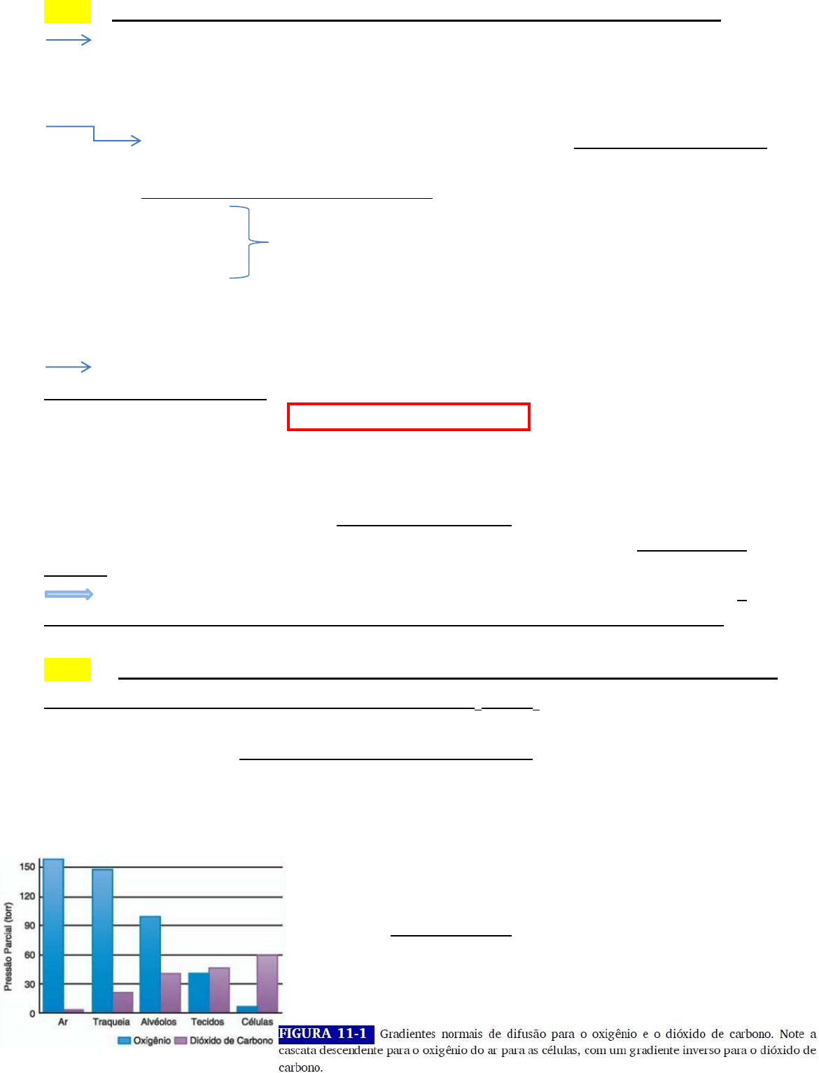 Vgas = [(A x D) / E] x (P1 – P2) ABERTURA 3 – FALTA DE FÔLEGO Obj.1 – Definir a difusão e sua relação com a Lei de Solubilidade (Lei de Fick) A difusão é o processo por meio do qual moléculas de gás se movem de uma área de alta pressão parcial para uma de baixa pressão parcial. Para se difundir para dentro e para fora dos pulmões e dos tecidos, o O2 e o CO2 devem se mover por meio de barreiras significativas. No caso do pulmão, essa barreira à difusão de gases é a membrana alvéolo-capilar. Assim, para o CO2 ou para o O2 se movimentarem entre os alvéolos e o sangue dos capilares pulmonares, três barreiras devem ser ultrapassadas: 1) Epitélio alveolar; 2) Espaço intersticial; Membrana alvéolo-capilar 3) Endotélio capilar. Além disso, esses gases também devem atravessar a membrana plasmática do eritrócito. Primeira lei de difusão de Fick O movimento de um gás através de uma membrana biológica (Vgas) é descrito pela primeira lei de difusão de Fick: --Sendo A a área transversal disponível para a difusão, D o coeficiente de difusão do gás, E a espessura da membrana, e (P1 – P2) o gradiente de pressão parcial através da membrana. De acordo com essa lei, quanto maior for a área de superfície (A), a constante de difusão (D) e o gradiente de pressão (P1 – P2), mais difusão irá ocorrer. Por outro lado, quanto maior for a distancia através da membrana (E), menos difusão ocorrerá. Diante disso, posto que A e E são relativamente constantes em indivíduos saudáveis, a difusão do pulmão normal depende principalmente dos gradientes de pressão dos gases. Obj.2 – Explicar o mecanismo de trocas gasosas nos alvéolos (hematose) e nos tecidos, relacionando com a pressão parcial de O2 e CO2 O movimento de gases entre os pulmões e os tecidos ocorre por meio de difusão simples. Para o O2, existe uma “cascata” gradativamente descendente de pressões parciais a partir da pressão parcial de oxigênio atmosférico (PIO2) – normalmente inspirado de 159 mmHg para um ponto de 40 mmHg ou menos nos capilares. A PO2 intracelular (aprox. 5 mmHg) fornece o gradiente final para a difusão do O2 para dentro da célula. Por outro lado, o gradiente de difusão para o CO2 é o oposto do O2. A pressão parcial de dióxido de carbono (PCO2) é mais alta nas células (aprox. 60 mmHg) e mais baixa no ar ambiente. Logo, uma cascata inversa causa o movimento de CO2 dos tecidos para o sangue venoso, o qual é transportado para os pulmões e, posteriormente, com auxilio da ventilação, eliminado para a atmosfera. Dióxido de carbono alveolar A pressão parcial alveolar do CO2 (PACO2) varia diretamente em relação à produção de dióxido de carbono pelo corpo (VCO2) e inversamente em relação à ventilação alveolar (VA). Usa-se um fator de 0,863 para converter a VCO2, a partir da temperatura e pressão padrão, seca (STPD) para a temperatura e pressão corporal, saturada (BTPS): A PACO2 aumentará acima desse nível se a produção de CO2 aumentar enquanto a ventilação alveolar permanecer constante ou se a ventilação alveolar diminuir enquanto a VCO2 permanecer constante. Do mesmo modo, a PACO2 cairá se a produção de CO2 diminuir ou a ventilação alveolar aumentar. Normalmente, os mecanismos de controle respiratório mantêm a PACO2 dentro de uma faixa de 35 a 45 mmHg sob uma variedade de condições. Assim, se a produção de CO2 aumentar, a ventilação automaticamente aumenta para manter a PACO2 dentro da faixa normal. Tensões alveolares de oxigênio A pressão parcial alveolar de oxigênio (PAO2) é determinada, principalmente, pela pressão parcial inspirada de oxigênio (PIO2). Deve-se considerar também que o oxigênio que está nos pulmões é diluído tanto pelo vapor d’água como pelo CO2. Considerando esses fatores, a seguinte equação do ar alveolar é aplicada: OBS – O componente FIO2 x (PB – 47) da equação é uma simples aplicação da lei de Dalton: pressão parcial = concentração fracionária x pressão total OBS – O componente (PACO2 / 0,8) da equação se refere ao CO2 alveolar. Essa equação representa a diferença entre o movimento do O2 e do CO2 para dentro e para fora dos alvéolos. Isso, portanto, é feito dividindo-se a PACO2 pela relação das trocas respiratórias (R), que representa a relação entre a excreção de CO2 e a captura de O2. OBS – Como a PCO2 arterial é quase igual à PCO2 alveolar, a PACO2 pode ser substituída pela PaCO2. Se um paciente está respirando 60% ou mais de O2 (FIO2 > 0,60), a correção para R pode ser derrubada, resultando na seguinte forma simplificada da equação do ar alveolar: A PAO2 normal é de aprox. 100 mmHg. Alterações nas tensões parciais de gases alveolares Além do O2, CO2 e vapor d’água, os alvéolos normalmente contêm nitrogênio (embora seja um gás inerte que não desempenhe nenhum papel nas trocas gasosas, o nitrogênio ocupa espaço e exerce pressão). De acordo com a lei de Dalton, a pressão parcial do nitrogênio alveolar (PAN2) deve ser igual à pressão que ele exerceria se ele estivesse sozinho. Assim, calcula-se a PAN2 da seguinte forma: As únicas pressões parciais que se alteram no alvéolo são as do O2 e do CO2. Com base na equação do ar alveolar, se a FIO2 permanece constante, então a PAO2 deve variar inversamente com a PACO2. Assim, posto que a PaCO2 varia inversamente com o nível de ventilação alveolar, para uma produção constante de CO2, uma diminuição na VA simultaneamente eleva a PaCO2 e abaixa a PAO2; por outro lado, aumento na VA tem o efeito oposto. OBS – Os mecanismos neurais de controle e o trabalho aumentado de respiração previnem diminuições na PaCO2 muito abaixo de 15 a 20 mmHg. Gradientes pulmonares de difusão De acordo com a lei de Fick, para que as trocas gasosas ocorram entre os alvéolos e os capilares pulmonares, uma diferença nas pressões parciais (P1 – P2) deve existir. A PO2 alveolar é, em méd