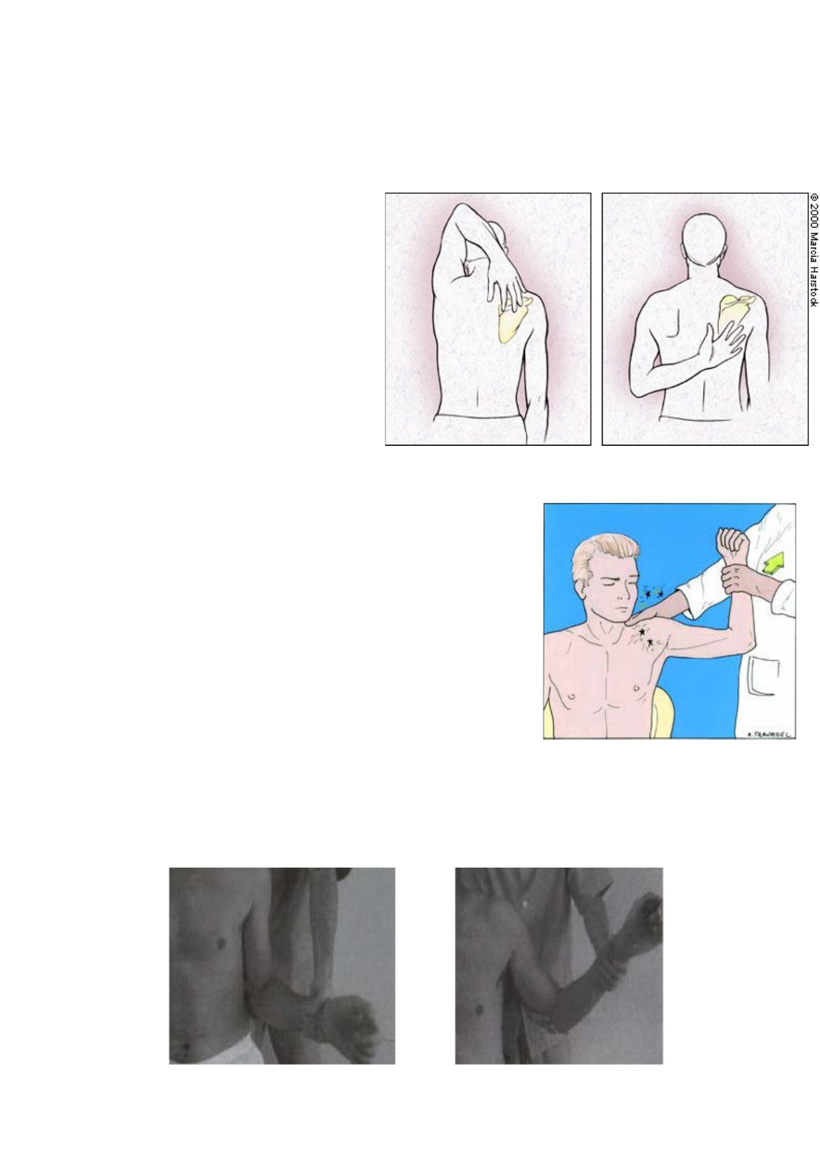 TESTES ESPECIAIS OMBRO T. APLEY; Teste para avaliar a extensão da movimentação do ombro do paciente. Inicia testando a abdução e a rotação externa, paciente tenta alcançar por trás da cabeça o ângulo superior da escápula contralateral. Como teste adicional de rotação interna e adução, paciente tenta alcançar o ângulo inferior da escápula contralateral, com o dorso da mão tocando as costas, positivo para dor ou diminuição de ADM nos movimentos testados. T. APREENSÃO; Teste para o deslocamento do ombro (luxação), paciente em posição D. D., fisio irá abduzir 90 º com cotovelo flexionado, e rode externamente o braço para uma posição em que ele facilmente se deslocará, paciente olhará com expressão de apreensiva, positivo apreensão para a luxação do ombro T. ROCKWOOD; Teste para avaliar instabilidade anterior do ombro (estruturas capsulares e labral), o fisio levará o braço do paciente em abdução com o cotovelo flexionado á 90º, e fará uma rotação externa (45º,90º e 120º), positivo apreensão ou dor posterior. T. DESLIZAMENTO ACRÔMIOCLAVICULAR; Para avaliar se a dor é na articulação acrômioclavicular, paciente sentado com o braço relaxado ao lado do corpo, fisio com uma mão na parte anterior e outra mão na parte posterior do ombro, irá comprimir a clavícula e a espinha da escápula com as palmas das mãos, positivo para dor ou movimento anormal. T. FLEXÃO CRUZADA; Teste para articulação acrômioclavicular, o fisio irá posicionar o braço do paciente á 90º abduzido e irá aduzindo sobre o corpo, palpando a articulação acrômioclavicular com uma mão, enquanto faz a adução (flexão cruzada) com a outra mão, positivo para dor na articulação. T.YERGASON; Teste para verificar se o tendão da cabeça longa do bíceps encontra-se estável no sulco bicipital, paciente sentado ou em pé com o cotovelo flexionado 90º, junto ao corpo e tentará fazer uma supinação, o fisio fará a resistência ao movimento, segurando o punho do paciente com uma mão e a outra palpando o tendão da cabeça longa do bíceps, positivo dor no sulco intertubercular do ombro ou estalidos (pela subluxação do tendão da cabeça longa do bíceps). T. SPEED; Teste para tendinite ou ruptura parcial do tendão do bíceps braquial, paciente sentado com flexão do ombro a 90º e braço estendido e supinado, fisio aplica resistência com uma das mãos na direção contraria (extensão e pronação) e palpa o tendão da cabeça longa do bíceps com a outra mão, positivo se houver dor no tendão da cabeça longa do bíceps. T.QUEDA DE BRAÇO; Teste para verificar se há ruptura dos tendões do manguito rotador, paciente em pé, fisio abduz o braço passivamente 90º com o cotovelo estendido, e pede para o paciente baixar lentamente o braço, positivo se não conseguir ou dor na região do ombro. MANGUITO ROTADOR: SUPRA E INFRA ESPINHAL, REDONDO MENOR E SUBESCAPULAR O manguito rotador é um conjunto de 4 tendões que se localizam no ombro e envolvem a cabeça do úmero (mantém a cabeça do úmero na cavidade glenóide). Os tendões são: tendão supraespinal, infraespinal, subescapular e redondo menor. Esses tendões são essenciais para o bom funcionamento do ombro. São eles os principais responsáveis pela desaceleração do ombro, pelas rotações e por manter o ombro bem posicionado para que outros músculos maiores e mais potentes realizem sua função. Inserção: tubérculo maior do úmero Inervação: nervo supra-escapular (supra e o infra-espinhal) e nervo axilar (redondo menor) T. JOBE-SUPRAESPINHAL; Teste para verificar lesões do supraespinhal, paciente em pé com o ombro elevado a 90 º e com rotação interna, fisio irá fazer resistência apoiando no cotovelo do paciente, que fará elevação contra a resistência do fisio, positivo dor na região do tendão do supraespinhal. T. NEER; Teste para verificar a síndrome do impacto, fisio estabiliza a escápula e eleva o braço do paciente, positivo dor na região do úmero com o acrômio, indica lesão do tendão supraespinhal ou bíceps braquial. ARCO DOLOROSO SINAL DO SULCO: verificar se o paciente é portador de uma subluxação do ombro. Colocando o paciente sentado com o membro superior pendente, iremos observar que se os músculos estabilizam a cabeça do úmero e o ombro não estiverem com boa tonicidade, irá aparecer um sulco entre a cavidade glenóide e a cabeça do úmero. TESTE DE PATTE: verifica-se os comprometimentos do músculo infra-espinhoso. Colocar o ombro do paciente numa posição de abdução a 90 graus com rotação lateral e cotovelo fletido também a 90º. Nesta posição solicitamos ao paciente uma rotação lateral forçado enquanto colocamos resistência para que o movimento não seja executado. Em casos de comprometimento do infra-espinhoso o paciente irá relatar dor no local da inserção do músculo. TESTE DE YOUKUM: teste será positivo para tendinite de supra-espinhoso ou artrite acrômio-clavicular (dor no ápice do ombro). Paciente faz uma flexão do ombro até o cotovelo tocar a testa (síndrome do impacto). COTOVELO T. ESTRESSE VALGO E VARO; Teste para os ligamentos colateral medial e colateral lateral, paciente em D.D. o fisio irá estabilizar a parte distal do úmero com uma das mãos e com a outra fará um movimento em direção lateral do antebraço, e depois um movimento em direção medial, testando os ligamentos colaterais com um estresse em valgo e varo, positivo se houver dor ou frouxidão ligamentar. T. EPICONDILITE LATERAL (COTOVELO DE TENISTA); Teste para os tendões extensores de punho, paciente flexiona os dedos com o antebraço pronado e estende o cotovelo, palpar no epicôndilo lateral, positivo dor na região dos tendões extensores de punho. T. EPICONDILITE MEDIAL; Teste para os tendões flexores de punho, com o antebraço supinado e o cotovelo e punho são estendidos pelo fisio, palpar no epicôndilo medial, positivo dor na região dos tend