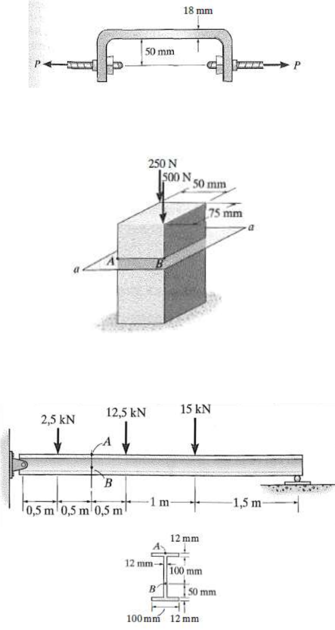 1° Lista de Exercícios – Tensão 1 – O suporte de aço é usado para ligar as extremidades de dois cabos. Se a força P = 2,5 kN for aplicada, determine a tensão normal máxima no suporte. O suporte tem espessura de 12 mm e largura de 18 mm. 2 – O bloco está sujeito ás duas cargas axiais mostradas na figura. Determine a tensão normal que age nos pontos A e B. Despreze o peso do bloco. 3 – A viga de abas largas está sujeita à carga mostrada na figura. Determine as componentes da tensão nos pontos A e B e mostre os resultados em um elemento de volume em cada um desses pontos. 4 – A viga suporta a carga mostrada na figura. Determine o estado de tensão nos pontos E e F na seção a-a e represente os resultados em um elemento de volume diferencial localizado em cada um desses pontos. 5 – A barra tem diâmetro de 40 mm. Se sua extremidade for submetida às duas componentes de força mostradas na figura, determine o estado de tensão no ponto A e mostre os resultados em um elemento de volume diferencial localizado nesse ponto. 6 - A haste maciça de 25 mm de diâmetro está sujeita às cargas mostradas na figura. Determine o estado de tensão no ponto B e mostre os resultados em um elemento diferencial localizado nesse ponto.