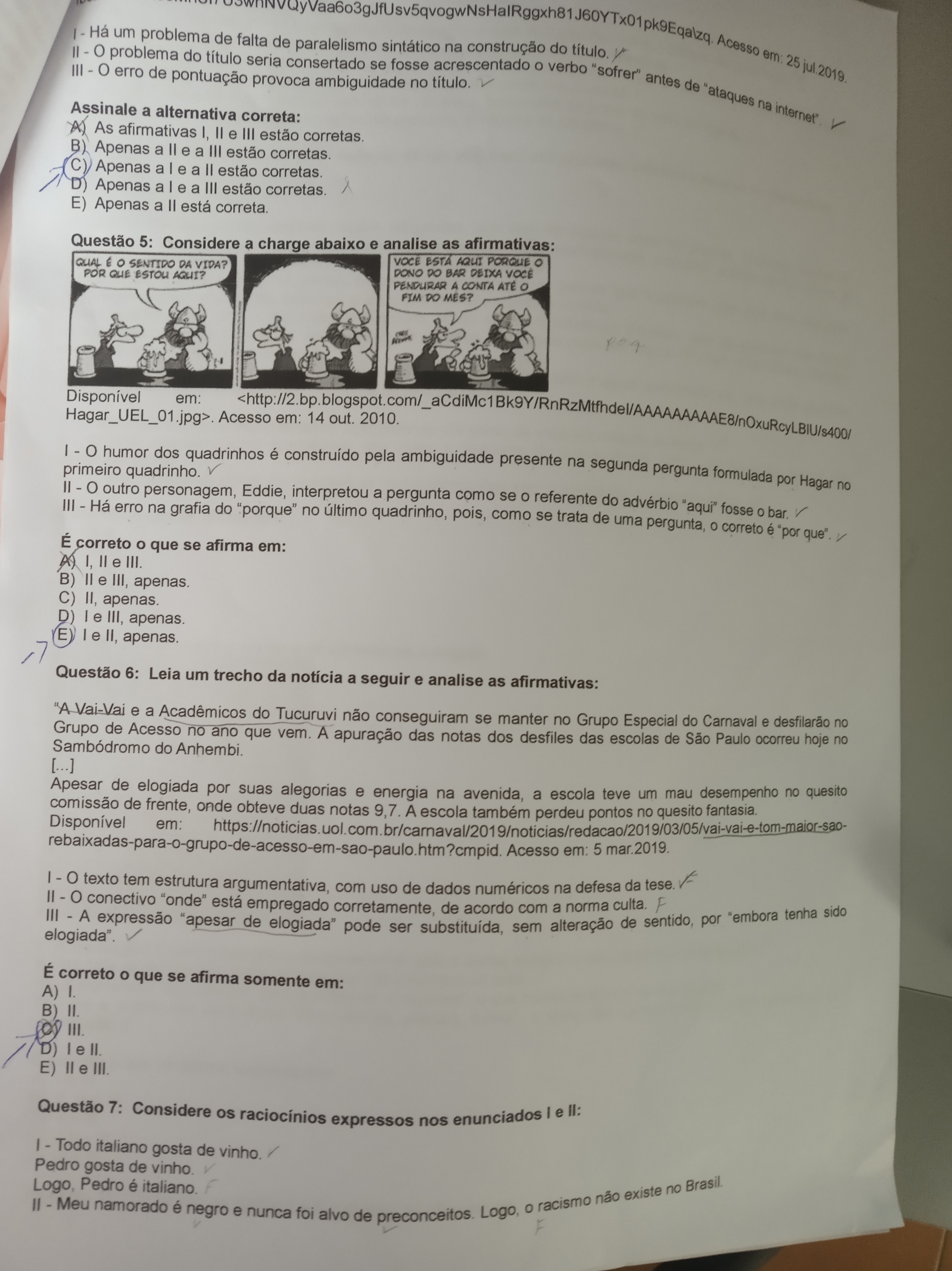 Leia um trecho da noticia a seguir e analise as afirmativas: "AVai-Vai e a Academicos do Tucuruvi nao conseguiram se manter no Grupo Especial do Carnaval e desfilarao no Grupo de Acesso no ano que vem. A apuracao das notas dos desfiles das escolas de Sao Paulo ocorreu hoje no Sambodromo do Anhembi. [...] Apesar de elogiada por suas alegorias e energia na avenida, a escola teve um mau desempenho no quesito comissao de frente, onde obteve duas notas 9,7. A escola tambem perdeu pontos no quesito fantasia. Disponivel em: em: 5 mar 2019. - O texto tem estrutura argumentativa com uso de dados numericos na defesa da tese. - O conectivo "onde" esta empregado corretamente, de acordo com a norma culta. - A expressao "apesar de elogiada" pode ser substituida, sem alteracao de sentido, por "embora tenha sido III elogiada" E correto que se afirma somente em: A) B) II. III. D) e II. E) e III.