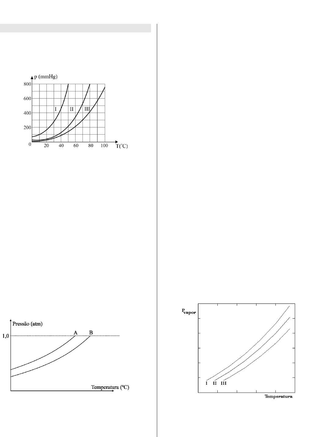 Considerando que as soluções foram preparadas com o mesmo soluto não volátil, pode-se afirmar que as curvas do solvente puro, da solução concentrada e da solução diluída são, respectivamente, a) I, II e III. b) I, III e II. c) II, III e I. d) II, I e III. e) III, II e I. a) I, II e III. b) I, III e II. c) II, III e I. d) II, I e III. e) III, II e I.
