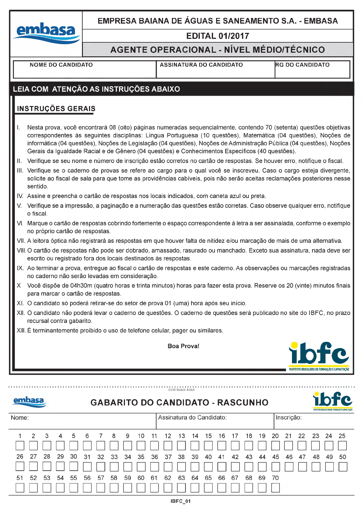 EMPRESA BAIANA DE ÁGUAS E SANEAMENTO S.A. - EMBASA _________________ EDITAL 01/2017_________________ AGENTE OPERACIONAL - NÍVEL MÉDIO/TÉCNICO NOME DO CANDIDATO ASSINATURA DO CANDIDATO RG DO CANDIDATO LEIA COM ATENÇÃO AS INSTRUÇÕES ABAIXO INSTRUÇÕES GERAIS I. Nesta prova, você encontrará 08 (oito) páginas numeradas sequencialmente, contendo 70 (setenta) questões objetivas correspondentes às seguintes disciplinas: Língua Portuguesa (10 questões), Matemática (04 questões), Noções de informática (04 questões), Noções de Legislação (04 questões), Noções de Administração Pública (04 questões), Noções Gerais da Igualdade Racial e de Gênero (04 questões) e Conhecimentos Específicos (40 questões). II. Verifique se seu nome e número de inscrição estão corretos no cartão de respostas. Se houver erro, notifique o fiscal. III. Verifique se o caderno de provas se refere ao cargo para o qual você se inscreveu. Caso o cargo esteja divergente, solicite ao fiscal de sala para que tome as providências cabíveis, pois não serão aceitas reclamações posteriores nesse sentido. IV. Assine e preencha o cartão de respostas nos locais indicados, com caneta azul ou preta. V. Verifique se a impressão, a paginação e a numeração das questões estão corretas. Caso observe qualquer erro, notifique o fiscal. VI. Marque o cartão de respostas cobrindo fortemente o espaço correspondente à letra a ser assinalada, conforme o exemplo no próprio cartão de respostas. VII. A leitora óptica não registrará as respostas em que houver falta de nitidez e/ou marcação de mais de uma alternativa. VIII. O cartão de respostas não pode ser dobrado, amassado, rasurado ou manchado. Exceto sua assinatura, nada deve ser escrito ou registrado fora dos locais destinados às respostas. IX. Ao terminar a prova, entregue ao fiscal o cartão de respostas e este caderno. As observações ou marcações registradas no caderno não serão levadas em consideração. X Você dispõe de 04h30m (quatro horas e trinta minutos) horas para fazer esta prova. Reserve os 20 (vinte) minutos finais para marcar o cartão de respostas. XI. O candidato só poderá retirar-se do setor de prova 01 (uma) hora após seu início. XII. O candidato não poderá levar o caderno de questões. O caderno de questões será publicado no site do IBFC, no prazo recursal contra gabarito. XIII. É terminantemente proibido o uso de telefone celular, pager ou similares. Boa Prova! íbfc INSTITUTO BRASILEIRO DE FORMAÇÃO E CAPACITAÇÃO embasa D E S T A Q U E A Q U I GABARITO DO CANDIDATO - RASCUNHO ib fe INSTITUTO BRASILEIRO DE FORMAÇÃO E CAPACITAÇÃO Nome: Assinatura do Candidato: Inscrição: 1 2 3 4 5 6 7 8 9 10 11 12 13 14 15 16 17 18 19 20 21 22 23 24 25 □ □ □ □ □ □ □ □ □ □ □ □ □ □ □ □ □ □ □ □ □ □ □ □ □ 26 27 28 29 30 31 32 33 34 35 36 37 38 39 40 41 42 43 44 45 46 47 48 49 50 □ □ □ □ □ □ □ □ □ □ □□ □ □ □ □ □ □ □ □ □ □ □ □ □ 51 52 53 54 55 56 57 58 59 60 61 62 63 64 65 66 67 68 69 70 □ □ □ □ □ □ □ □ □ □ □ □ □ □ □ □ □ □ □ □ IBFC 01 OHNflOSVU LÍNGUA PORTUGUESA Para as questões de 1 a 3, considere o texto a seguir, escrito por Clarice Lispector, com o pseudônimo de Tereza Quadros, no jornal Comício, em 1952. Lar, engenharia de mulher Tereza Quadros A notícia curtinha veio em forma de anedota e não descrevia o tipo do homem, o que é um mal. O leitor gosta de ver o personagem e dá menos trabalho quando a fotografia já vem revelada. Negativo é sempre negativo. Em todo o caso, devia ser mais pra baixo do que pra alto, menos magro do que gordo, mas necessitado de um preparado à base de petróleo do que uma boa escova de nylon, para cabelo. É assim que a gente imagina os homens de bom coração e devia ter um de manteiga o que passou a mão pela cabeça arrepiadinha de cachos da menina e falou com bondade: - Que pena vocês não terem um lar. - Lar nós temos, o que não temos é uma casa pra botar o lar dentro - respondeu a menina, que tinha cinco anos e morava com o pai, a mãe e dois irmãozinhos em um apertadíssimo quarto de hotel. Naturalmente, espantada com a ignorância do amigo barbado. E sem saber a felicidade que tinha, sem saber que era dona dessa coisa maravilhosa, que vai desaparecendo nesta época ultracivilizada de discos voadores corvejando por cima da cabeça dos homens. Dá até pra desconfiar que são os homens que não têm lar, que inventam essas geringonças complicadas. Porque o lar é tão gostoso, tão bom, que quem tem um não deve ter lá muita vontade de andar atolado em ferro, em metais, em ácidos corrosivos, fervendo os miolos em altas matemáticas numa fábrica ou num laboratório. O que muitos têm é casa - e são os felizardos, já que a maioria não tem uma coisa nem outra - mas uma casa tão vazia de lar, como a lata de biscoitos, depois que as crianças avançam em cima dela no café da manhã. Casa é difícil, mas ainda se pode arranjar: quem compra bilhete pode ver chegando o seu dia: o funcionário público dorme na fila de uma autarquia e o bancário vai alimentando a esperança de cair nas graças do patrão e numa tabela Price a juros de 7%. Mas lar, lar mesmo, só com muita sorte. Até porque ninguém tem fórmula de “lar”. A rigor, não se sabe bem o que é que faz o lar. Sabe-se que ele pode ser feito, muitas vezes desfeito e, algumas, também refeito. É uma coisa parecida com eletricidade; não se entende a sua origem, mas se faltar a luz dentro de casa todo o mundo sabe que está no escuro. Então lar é isso. É aquilo que a garotinha de cinco anos sentiu com tanta força e que nós todos sabemos quando ele está presente, como sabemos quando houve desarranjo sério nas turbinas ou simples curto circuito num fusível qualquer. Há pessoas práticas e previdentes que costumam ter uma espécie de lar em conserva; 