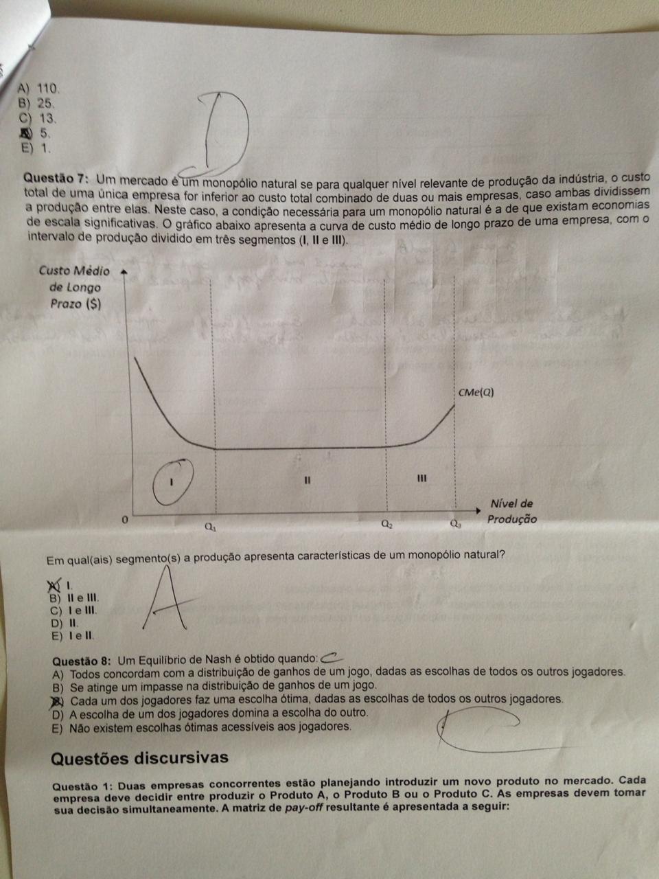 Um Equilibrio de Nash e obtido quando A) Todos concordam com a distribuicao de ganhos de um jogo, dadas as escolhas de todos outros jogadores. B) Se atinge um impasse na distribuicao de ganhos de um jogo. C) Cada um dos jogadores faz uma escolha otima, dadas as escolhas de todos outros jogadores. D) A escolha de um dos jogadores domina a escolha do outro. E) Nao existem escolhas otimas acessiveis aos jogadores.