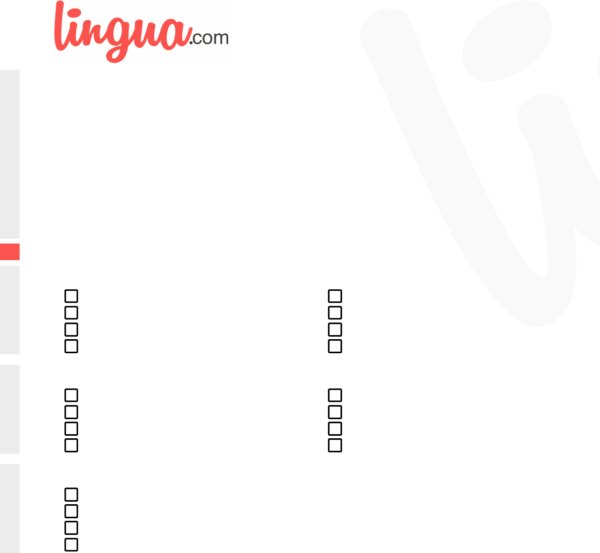 Our Vacation (A1) Every year we go to Florida. We like to go to the beach. My favorite beach is called Emerson Beach. It is very long, with soft sand and palm trees. It is very beautiful. I like to make sandcastles and watch the sailboats go by. Sometimes there are dolphins and whales in the water! Every morning we look for shells in the sand. I found fifteen big shells last year. I put them in a special place in my room. This year I want to learn to surf. It is hard to surf, but so much fun! My sister is a good surfer. She says that she can teach me. I hope I can do it! Did you understand the text? 1) My favorite beach is... Surf Beach Emerson Beach Palm Beach Long Beach a) b) c) d) 2) What animals do I see in the water? Sharks Starfish Dolphins Dogs a) b) c) d) 3) How many shells did I find last year? Twelve Five Fifty Fifteen a) b) c) d) 4) What do I want to learn this year? Surfing Swimming Sailing How to find shells a) b) c) d) 5) Where did I put my shells last year? In a box In the garage In my room In Florida a) b) c) d) Source: https://lingua.com/english/reading/vacation/ Solution: 1) b 2) c 3) d 4) a 5) c https://lingua.com/ https://lingua.com/english/reading/vacation/