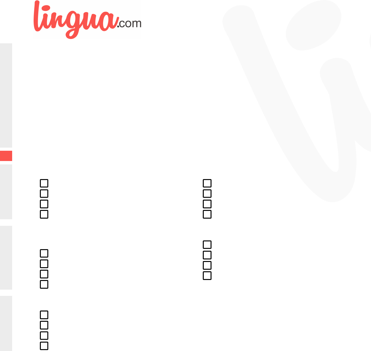 My Wonderful Family (A1) I live in a house near the mountains. I have two brothers and one sister, and I was born last. My father teaches mathematics, and my mother is a nurse at a big hospital. My brothers are very smart and work hard in school. My sister is a nervous girl, but she is very kind. My grandmother also lives with us. She came from Italy when I was two years old. She has grown old, but she is still very strong. She cooks the best food! My family is very important to me. We do lots of things together. My brothers and I like to go on long walks in the mountains. My sister likes to cook with my grandmother. On the weekends we all play board games together. We laugh and always have a good time. I love my family very much. Did you understand the text? 1) My mother is a... Doctor Nurse Writer Waitress a) b) c) d) 2) My house is near the... City Monastery Mountains Italy a) b) c) d) 3) How old was I when my grandmother came? Three years old Just born Ten years old Two years old a) b) c) d) 4) On the weekends, we... Play board games together Go to a movie Clean the house Cook pasta a) b) c) d) 5) My sister is kind, but also... Mean Quiet Nervous Strong a) b) c) d) Source: https://lingua.com/english/reading/wonderful-family/ Solution: 1) b 2) c 3) d 4) a 5) c https://lingua.com/ https://lingua.com/english/reading/wonderful-family/