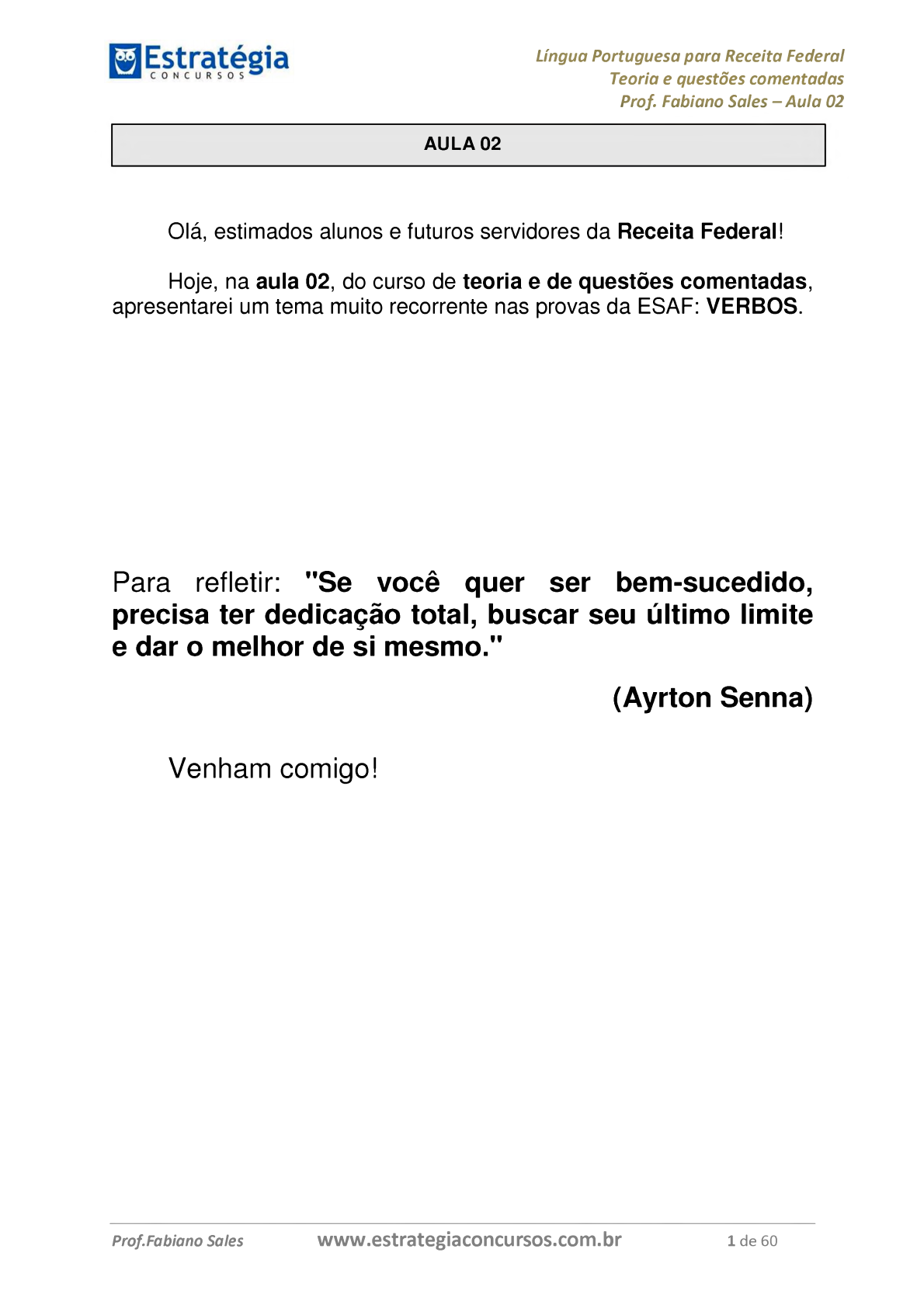 Língua Portuguesa para Receita Federal Teoria e questões comentadas Prof. Fabiano Sales - Aula 02 AULA 02 Olá, estimados alunos e futuros servidores da Receita Federal! Hoje, na aula 02, do curso de teoria e de questões comentadas, apresentarei um tema muito recorrente nas provas da ESAF: VERBOS. Para refletir: "Se você quer ser bem-sucedido, precisa ter dedicação total, buscar seu último limite e dar o melhor de si mesmo." (Ayrton Senna) Venham comigo! Prof.Fabiano Sales www.estrategiaconcursos.com.br 1 de 60 Língua Portuguesa para Receita Federal Teoria e questões comentadas Prof. Fabiano Sales - Aula 02 ESTRUTURA VERBAL Inicialmente, apresento a vocês a estrutura que compõe os verbos, uma vez que será por meio dela que identificaremos a conjugação e o sentido no texto. Em regra, o verbo é formado por três elementos: radical, vogal temática e desinências. > RADICAL Por radical devemos entender o elemento que apresenta o significado da palavra. Em se tratando de formas verbais, o radical é obtido a partir de sua forma infinitiva (o "nome” do verbo), suprimindo as terminações -AR, -ER ou -IR: Cantar ^ Cant- (radical) Vender ^ Vend- (radical) Partir ^ Part- (radical) > VOGAL TEMÁTICA É o elemento que prepara o radical para o recebimento das desinências. É por meio da vogal temática que se identifica a conjugação a que o verbo pertence. Cantar ^ -a- (1ã conjugação) Vender ^ -e- (2ã conjugação) Partir ^ -i- (3ã conjugação) E a que conjugação pertence o verbo pôr ? Meus amigos, esse verbo (e os derivados compor, decompor, supor etc.) pertence à 2ã conjugação, uma vez que apresenta -e- como vogal temática, devido à sua origem da forma latina ponere. Notem que, em algumas pessoas verbais, a vogal temática -e- aparece ao longo da conjugação. Exemplo: Presente do indicativo Eu ponho / Tu pões / Ele põe / Nós pomos / Vós pondes / Eles põem > TEMA Por meio da união entre radical e vogal temática temos o que se chama tema. Fala (tema) ^ fal- (radical) + -a (vogal temática) Vende (tema) ^ vend- (radical) + -e (vogal temática) Parti (tema) ^ part- (radical) + -i (vogal temática) Prof.Fabiano Sales www.estrategiaconcursos.com.br 2 de 60 Língua Portuguesa para Receita Federal Teoria e questões comentadas Prof. Fabiano Sales - Aula 02 Aqui chamo a atenção de vocês para as desinências, pois é a partir delas que perceberemos as flexões verbais. As desinências subdividem-se em: > modo-temporais - indicam o modo (indicativo, subjuntivo e imperativo) e o tempo verbal (presente, passado e futuro); e > número-pessoais - indicam o número (singular e plural) e a pessoa do discurso (1ã, 2ã e 3ã). Exemplos: C a nt a v a yr r yr y radical vogal DMT DNP temática CANT- : radical - apresenta o significado da palavra. -A- : vogal temática - indica que o verbo pertence à 1- conjugação. -VA- : desinência modo-temporal - indica que o verbo está flexionado no pretérito imperfeito do indicativo. -S : desinência número-pessoal - indica que o verbo está flexionado na 2- pessoa do singular. < CD —> Cl e 1 C D l o s y' r yr yr radical vogal DMT DNP temática VEND- : radical - apresenta o significado da palavra. -E- : vogal temática - indica que o verbo pertence à 2- conjugação. -RE- : desinência modo-temporal - indica que o verbo está flexionado no futuro do presente do indicativo. -MOS : desinência número-pessoal - indica que o verbo está flexionado na 1- pessoa do plural. Prof.Fabiano Sales www.estrategiaconcursos.com.br 3 de 60 Língua Portuguesa para Receita Federal Teoria e questões comentadas Prof. Fabiano Sales - Aula 02 P cart i ra s1 yr yr yr yr radical vogal DMT DNP temática PART- : radical - apresenta o significado da palavra. -I- : vogal temática - indica que o verbo pertence à 3- conjugação. -RA- : desinência modo-temporal - indica que o verbo está flexionado no pretérito mais-que-perfeito do indicativo. -S : desinência número-pessoal - indica que o verbo está flexionado na 2- pessoa do singular. A seguir, apresentarei a vocês o paradigma das desinências modo- -temporais e número-pessoais. DESINÊNCIAS MODO-TEMPORAIS Modo Tempo 1ãConjugação Exemplo 2ã e 3ã Conjugações Exemplo Indicativo Presente 0 (zero) falo 0 (zero) vendo, parto Pretérito perfeito 0 (zero) falei 0 (zero) vendi, parti Pretérito imperfeito -va (-ve) falava, faláve is -ia (-íe) vendia, vendíeis; partia, partíeis Pretérito mais-que- -perfeito -ra (-re) átono falara, faláreis -ra (-re) átono vendera, vendêreis; partira, partíreis Futuro do presente -ra (-re) tônico falará, falareis -ra (-re) tônico venderá, vendereis; partirá, partireis Futuro do pretérito -ria (-ríe) falaria, falarieis -ria (-ríe) venderia, venderieis; partiria, partirieis Subjuntivo Presente -e fale , fale is -a venda ,parta Pretérito imperfeito -sse falasse, falasses -sse vendesse, partisse Futuro -r falar,falares -r vender, partir Prof.Fabiano Sales www.estrategiaconcursos.com.br 4 de 60 Língua Portuguesa para Receita Federal Teoria e questões comentadas Prof. Fabiano Sales - Aula 02 DESINÊNCIAS MODO-TEMPORAIS Modo Tempo 1-Conjugação Exemplo 2- e 3- Conjugações Exemplo Imperativo Afirmativo -e fale ,falemos -a vendam, partam Negativo -e não fale , não falemos -a não vendam, não partam Infinitivo Pessoal -r falar,falares -r vendermos, partirmos DESINÊNCIAS NÚMERO-PESSOAIS > 1- pessoa do singular -o (no Presente do indicativo): falo, vendo, parto. -i (no Pretérito perfeito e no Futuro do presente do indicativo): falei, vendi, parti; falarei. 0 (nos demais tempos e modos): falava, falaria, falara, falasse.___________________ > 2- pessoa do singular -s (em todos os tempos, exceto no Imperativo afirmativo): falas, vendes, partes; falarás. -ste (no Pretérito perfeito do indicativo): falaste, vendeste, partiste. 0 (no Imperativo afirmativo): fala (tu), vende (tu), parte (tu)._______________________ > 3- pessoa do singular -u (Pretér
