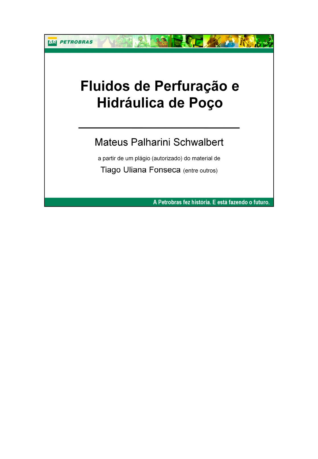 1 Conteúdo: Definição de Fluido de Perfuração Funções do Fluido Tipos de Fluido Fluidos Aquosos Fluidos Não-Aquosos 2 O fluido de perfuração é constituído de um veículo ou base e aditivos: O veículo é o líquido ou gás que será o principal componente do fluido e servirá de meio de transporte para os demais aditivos. Ele é o principal constituinte do fluido. Existem diversas bases possíveis para um fluido e ele normalmente é classificado em função dela. Os aditivos são sólidos ou líquidos que são misturados ou dissolvidos ao veículo para modificar suas propriedades. A unidade utilizada para medir a concentração de aditivos é a libra por barril (lb/bbl). Existem aditivos colocados em quantidades tão pequenas quanto 0,1 lb/bbl até aditivos colocados às dezenas de libras por barril. 3 Remover cascalhos Fluidos de perfuração carreiam os fragmentos de rocha escavados pela brocaFluidos de perfuração carreiam os fragmentos de rocha escavados pela broca até a superfície. A quantidade, tamanho e forma dos cascalhos são determinados pelo tipo de broca e pela velocidade de perfuração. Um carreamento eficiente depende do fluido e dos cascalhos. Cascalhos menores e em menor quantidade são carreados com mais facilidade. A vazão e a viscosidade do fluido também são parâmetros importantes nesse carreamento. Fluidos mais viscosos e circulados a vazões mais altas carreiam melhor. Entretanto, aumentar a vazão e a viscosidade significa aumentar a perda de carga associada ao bombeio e, portanto, as pressões no fundo do poço. Deve- se buscar um equilíbrio entre esses fatores. Embora a densidade do fluido também afete a velocidade de sedimentação dos cascalhos, já que afeta o empuxo, ela afeta muito mais a pressão no fundo do poço. Por isso, nunca se aumenta o peso do fluido no intuito de melhorar a limpeza do poço. Alta rotação da coluna de perfuração introduz um componente circular no movimento do fluido dentro do anular. Aumentar a rotação da coluna é um dos melhores métodos de incrementar a limpeza em poços horizontais ou de grande ângulo. 4 Sustentar cascalhos Os fluidos de perfuração são tixotrópicos, ou seja, eles gelificam quando emOs fluidos de perfuração são tixotrópicos, ou seja, eles gelificam quando em condição estática. Essa característica mantém os cascalhos suspensos quando o fluido não está circulando, como em uma manobra. Da mesma forma, o fluido deve perder a condição de gel rapidamente quando voltar a ser bombeado. Essa suspensão de cascalhos deve acontecer no amplo espectro de condições de pressão e temperatura a que o fluido vai estar exposto. Cascalhos que se precipitem podem entupir o anular, causando prisão da coluna e perda da possibilidade de circular o fluido. Além disso, a precipitação dos cascalhos gera uma variação na densidade do fluido no anular, o que pode gerar mudanças de pressão perigosas no fundo do poço. Essa precipitação ocorre mais comumente em poços de alta temperatura ou grandes inclinações. Uma alta concentração de sólidos é prejudicial para a eficiência da perfuração, pois causa o aumento do peso e viscosidade da lama, o que precisa ser tratado com diluição e adição de aditivos. Também diminui a taxa de penetração (Rate of Penetration - ROP), já que aumenta a potência necessária para fazer a lama circular. 5 Controlar as pressões das formações O fluido é a primeira barreira de segurança do poço. É ele que controla aO fluido é a primeira barreira de segurança do poço. É ele que controla a pressão das formações, impedindo o fluxo de fluidos e o fechamento do poço. À medida que o poço fica mais fundo, as pressões envolvidas aumentam e o mesmo deve acontecer com o peso do fluido. Por outro lado, um fluido pesado demais pode fluir para a formação ou mesmo fraturá-la. Esse assunto será trabalhado com mais detalhes quando se estudar tópicos de Hidráulica de Poço e Reologia. Selar formações permeáveis Para evitar a infiltração de fluido quando se está perfurando formações permeáveis, o fluido conta com materiais “inibidores de filtrado”. Esses materiais são sólidos inertes e polímeros que se acumulam na parede do poço à medida que o fluido invade a formação, rapidamente bloqueando a perda de fluido. O fluido é desenhado para depositar um reboco (filter cake) fino e de baixa permeabilidade, para limitar a invasão sem prejudicar a perfuração. Se um reboco espesso demais é formado, podem acontecer problemas desde dificuldade de se realizar a perfilagem até perda de circulação e prisão de coluna. Em alguns casos, quando a perda é muito severa, podem ser usados agentes obturantes, que são partículas maiores, com o objetivo de fechar poros muito largos. Quando se trata de uma formação de interesse, se busca utilizar obturantes removíveis, como o calcário, que pode ser destruído com o uso de ácido. 6 Manter a estabilidade do poço A composição química e as propriedades físicas do fluido agem em conjuntoA composição química e as propriedades físicas do fluido agem em conjunto para proporcionar estabilidade ao poço. Enquanto o peso da lama é necessário para equilibrar as forças mecânicas, polímeros inibidores e sais são utilizados para evitar a dissolução de formações salinas e o inchamento e dispersão de argilas. A variação do diâmetro do poço (cáliper) pode gerar topadas de revestimento, falhas na perfilagem e problemas de limpeza, além de prisão de coluna. Em fluidos não-aquosos, a própria fase orgânica é estável quimicamente, tornando a função de manter a estabilidade química do poço mais fácil. Minimizar o dano à formação Dano é qualquer diminuição da produção de uma formação para um mesmo diferencial de pressão. Os danos mais comuns são causados pela invasão de sólidos finos nos poros formação, inchamento de argilas presentes na própria forma