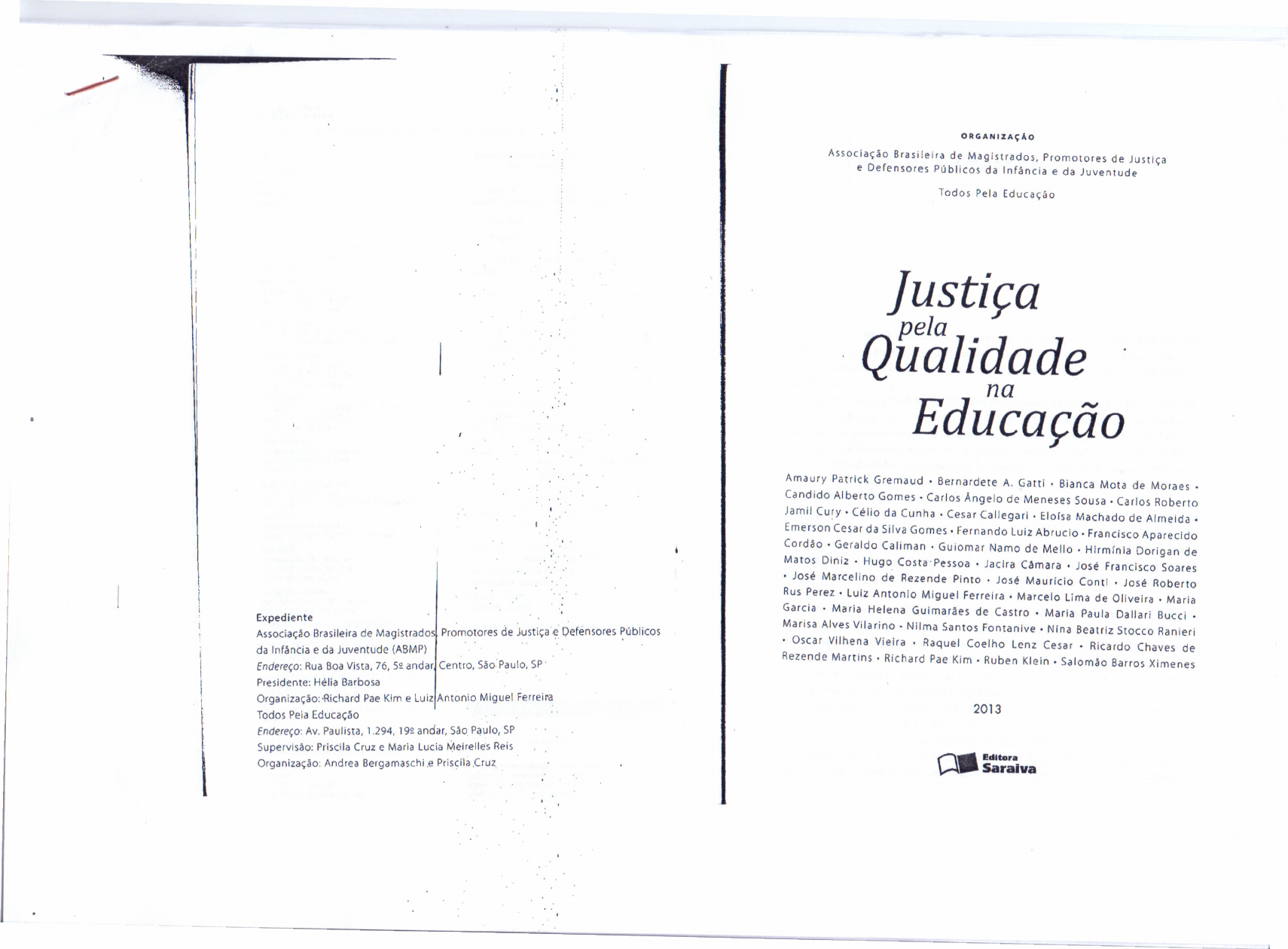 ',' " Expediente " Associação Brasileira de Magistrados Promotores de Justtçae Defensores Públicos da Inf3ncia e da Juventude (ABMP)' " , Endereço: Rua Boa Vista, 76, S~ andar Centro, Sáo.Paulo, SP' Presidente: Hélia Barbosa Organização: 'Richard Pae Kim e Luiz Antonio Miguel Ferreira Todos Pela Educação Endereço: Av, Paulista, 1,294. 19~ andar. S30, Paulo, SP Supervisão: Priscila Cruz e Maria Lucia ~eirelles Reis Organização: Andrea Bergamaschi e Priscila .Cruz ORGANIZAÇAo Associação Brasileira de Magislrados. Promotores de Justiça e Defensores Públicos da Infância e da Juventude Todos Pela Educação justiça pela Qualidade na Educação Amaury Patrick Gremaud • Bernardete A, Gani. Bianca Mota de Moraes • Candido Alberto Gomes· Carlos Ângelo de Meneses Sousa. Carlos Roberto Jami! Cury • Célio da Cunh a . Cesar Callegari • E!olsa Machado de Almeida • Emerson Cesar da Silva Gomes· Fernando Luiz Abruclo . Francisco Aparecido Cor d ão . Geraldo Caliman • Guiomar Namo de Mello. Hirmínia Dorigan de Matos Otnlz • Hugo Co staPe ssoa • Jacira C3mara • José Francisco Soares • José Marcelino de Rezende Pinto· José Maurício Conti • José Roberto Rus Perez· Luiz Antonio Miguel Ferreira • Marcelo lima de Oliveira. Maria Garcia • Maria Helena Guimarães de Castro. Maria Paula Dallari Bucci • Marisa Alves Vilarino· Nilma Santos Fontanlve . Nina Beatriz Stocco Ranieri • Oscar Vilhena Vieira • Raquel Coelho Lenz Cesar • Ricardo Chaves de Rezende Martins • Richard Pae Kim • Ruben K!ein • Salomão Barros Ximenes 2013 (\1. Editora ~ Saraiva (\l.U--~ Saraiva RIJOHt~iIu'Sclwnann, 270, (~queüo C4lcr - lôo PllIlIo- 11' (EP0\413-909 PlBUll) 36133000 \ACJUt 0800 01\ 7688 De 2' o 6', dos 8:30 às 19:30 \Clloivo~1@ediIOCO\OlOivo,Com.br Acl1se: ••••• .lOroivoiuf.eom,b, FIliAIS A/MIONAl/ROH06!lMORAIMA/AUE RIJO(•••• "'OI'tdo,Só-(,"" fOM: (91) 343l-4211- fGx: 1911313l-47S1-Ma",," BAHIA/lEaGlPE ilIo~0/",.13-~"'" fOM: 17113381·58S./33SI·589S ",,:17I13311~919-101vodo< IAlIRUISÃO'AU10I RIJO"""""",,"000 •• 1·II/H7-( •• " I,,,: (I~I 3llH64J - I,,: lU) 3l3H~OI-1io<Ju (w.I!PI.\uI!MAIAHHÀO A'. fQ.- G.",,~ 170 - .~"'''l'f,,,, ISI) 313~13l3/3l3~1384 fOI: ISI} 32~1331- 1~loI", DISTRITOIRlEIAl III/Wc lodIo 2101' 8\0 - li •• 10It~r.mc. AbosIeàr"1O l,no:16Il3344-l9W/33U·1911 fod61} 3344·170'1-Broslio GOIÁS/TOUNnllS I'.•••"ndôoIdo.\330 - III~ ItI0p0n, I•• : 161}3m·1SSl / 321l·2Sij6 10< (l11 m4-30i6-GoiIniI MATOGIOIIO DOIWMATOGROSIO RIJOl4dol••.•. lI~-(,," 1<00: 16713382·3&8l- fOl' 161)3382~112 -Cool><>~"" IIINIIGW~ RIJOAlóm,.r.a..449-1,goinha I••• , 13Il3419~300-1,,: (31} 3419·8310- 8eIo~"",~ ,AlÁ/wlA """" •• ~.I86-Bo,SI'ÚIr~I",,, 19113122·9034/3224·9038 1•• :(91}3241~9'/-"W~ PlRAIt.\!lANTACATAIINI RIJO"""'0;0 iJM"". 2891 -'rodo Vtl'>o 1"'/10< 141}3331·m~ - (uriilb! PEJNMlIIKO/PWlIA!l G. DONORTVllAGOAI RIJO(.,010 d, Iispo. 181- Boar••• 10110: ISI} 341Hl~6- 10< 111}3-4ll~IIO-R,.;{, IIUIIÃO 'afiO llio /lUlO} /N,1,,,,,,,,.1 •• ,.1211-(" •• 1,1\1:116}3610-5S43-lu 1I1}361~2S4 -RiboiIõo~"o lJ() OEJIJIDIO/lsrlRITO 1.00'0 Iiio r"ondo d. \o:l~kobelll3, 119- Vlo IIObo! lon.12Il2177-9~94 - 10l: (21}1177-8867/ 1177·9161 i.doJoroI~ ijO GRANDEDOSUl lII.ll._,.131-I,",pos """flOl: III} 3371~OOI/3371-1467/3371·1167 '.~IieI. SÃo'AUlO /N.ArlIÓfj«).91-Bonol"', lone:'ISX 111}311~3666 -110 PooIo ___ I ISBN 978·85·02·19576·9 Oodos Inlemoci<>noisde (oloi<>gOlôono Publicoç;o ((IP) ((OmOlo 810lileiro do Ui<o. SP, 81O~1) Jusli\o ~Io qoolidodno edu<oçõo / ABMp, Todos pelo 100(0\60 (orgonlzor;õo). - ~iIo Poulo , Soroivo, 2013. Villios OU10l81. BibtooQrofio. UdlKOçõo 2. Educoção· Brosil 3. Edu<odores· formOl;o 4. aU<Jlidod. do ensino I. Todos pelo 8ooCOÇÕO. 12·1\657 COlJ-370.981 Indices poco cotólogo sillemólico: 1, 8rosil : Educoç;o de quolidode 2. Ouolidode 00 ,ducOlÓO : B,osil 370,981 370.981 Direi., ,,"""lal WizRooe;,o c.lia ' Ger•• r. cJ. ptO<lulão .rli/.'ioi ligia ANos fdila(Q TIroIs di ComOlgoRoOO9uBs "O<Iulolo "#0(;"/ C/Grissc BoralemMorio Prapa,oção d. origioo. Ano.CrisIino Goreia 'I~ariotzÓbeI Borre,os 8ileJlC1JU(/Brl1l/J1l IianiaI,Povonillowlr. An •• diagromolõa CriJlinIJApOfe~ ~ de Fleillll Edson Coiobor>< R.visõo d. pt.,cn Rito de cdssÍo OueirOl wgcti WcieM BIPc;:Ii AJiiloMooiz S.1V~os .dil",",. CmArti.UWlek. Moric (di Coutfnho MOfIÍII5 Copo Caso de ldmM IOonitI.o ProdlJf6. grófico lr'!><Ii Rompim , Impr01l4' Ed.Loyo/Q Acabom,,', Ed.loyalr' , /mtJ"lC 8IJIpopel ,óIait do ~l~JlO: GromotUla70 gJm'. Data de fe<hamenlo da edlção: 5·3·2013 O •• lda.7 .Acesse ~.saTai~aiur.com.br . N·U1Ium,p~1I dl~" PUWk.\!O'·~~'; SI( ,,~odUl~' p;, quolquormeio cufolmollmClpléYiooulortl~l»do[dilola 5«oi'tG. A,iob\!t doI dj,il" •• ra". I cri•• IllObelodrlono lola, 9,110/11 I p",~, p.lo arlioo 184 d~ [6r100 ,,,,1. I 1'1 'II, i (' Nota dos organizadores o Todos Pela Educação é um movimento da sociedade civil brasileira que tem como missão contribuí r para a efetivação do direito de todas as crianças e todos os jovens à Educação Básica de qualidade até 2022. ano do bicentenário da Independên- cia do Brasil. A Associação Brasileira de Magistrados. Promotores de Justiça e Defensores Pú- blicos da Infância e da Juventude (ABMP) desenvolve ações nacionais. regionais e estaduais. as quais abrangem os cerca de 6.000 magistrados. promotores de Justiça e defensores públicos que atuam nas aproximadamente 2.700 Comarcas da Justiça Co- mum. Cobrindo todos os municípios brasileiros, essa associação busca aprimorar a garantia de direitos de crianças e adolescentes. do Sistema de Justiça da Infância e da Juventude e de todo o Sistema de Garantia de Direitos brasileiro. A motivação que nos levou a realizar este trabalho em parceria foi o desejo de aproximar o mundo do Direito e o mundo da Educação. não no sentido de promove