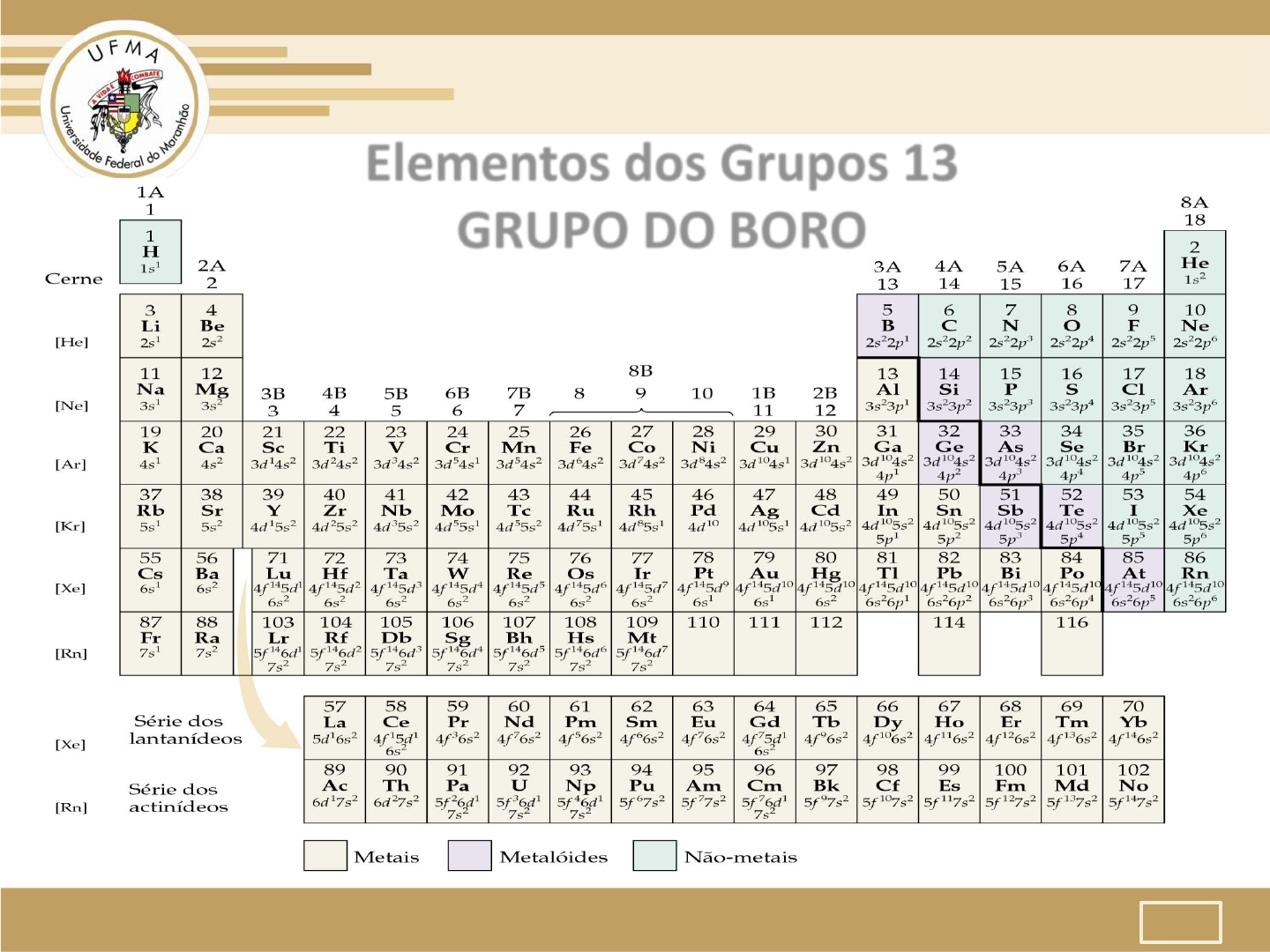 curso Química disciplina Quimica Inorgânica I 01/45 Elementos dos Grupos 13 GRUPO DO BORO curso Química disciplina Quimica Inorgânica I 02/45 Configuração eletrônica e propriedades (Pauling) B [He]2s22p1 metalóide 2,04 Al [Ne]3s23p1 metal 1,61 Ga [Ar]3d104s24p1 metal 1,81 In [Kr]4d105s25p1 metal 1,78 Tl [Xe]4f145d106s26p1 metal 1,62 Sempre forma ligações covalentes Al, Ga, In e Tl são metais moderadamente reativos; Seus compostos situam-se no limite entre aqueles com caráter iônico e covalente; Efeito do par inerte cresce à medida que desce o Grupo . Elementos dos Grupos 13 PROPRIEDADES GERAIS Boro É um não metal Sempre forma ligações covalentes, e normalmente três ligações com ângulos de 120º Não possui nenhuma tendência de formar compostos monovalentes Todos compostos BX3 são deficientes Elementos dos Grupos 13 Al, Ga, In e Tl Formam compostos trivalentes São metais moderadamente reativos Muitos dos seus compostos são covalentes quando anidros, mas formam íons em solução Seus compostos se situam entre aqueles com caráter iônico e covalentes PROPRIEDADES GERAIS Elementos dos Grupos 13 curso Química disciplina Quimica Inorgânica I 13/45 Ocorrência Abundância B Bórax – Na2[B4O5(OH)4].8H2O 38º. Al Bauxita – Al2O3.3H2O 3º. Ga Na forma de sulfetos e como impurezas em minérios dos elementos adjacentes 33º. In 63º. Tl 60º. 03/45 curso Química disciplina Quimica Inorgânica I curso Química disciplina Quimica Inorgânica I 04/45 Obtenção do Alumínio Processo Bayer O minério triturado é dissolvido em NaOH 30% (em massa) a 150 - 230C e alta pressão (30 atm para impedir a ebulição). Al2O3 dissolve: Al2O3.H2O(s) + 2H2O(l) + 2OH-(aq) 2Al(OH)4-(aq) A hidróxido de alumínio pode ser obtido por redução do pH. A alumina é obtida pela calcinação do hidróxido de aluminio. 05/45 curso Química disciplina Quimica Inorgânica I Processo Hall-Héroult Usa o Al2O3 purificado em criolita fundida (Na3AlF6, ponto de fusão 1012C). Anodo: C(s) + 2O2-(l) CO2(g) + 4e- Catodo: 3e- + Al3+(l) Al(l) Os bastões de grafite são consumidos na reação. Para a produção de 1.000 kg de Al, precisamos de 4.000 kg de bauxita, 70 kg de criolita, 450 kg de anodos de C e 56 109 J de energia. 06/45 curso Química disciplina Quimica Inorgânica I Eletrometalurgia 07/45 curso Química disciplina Quimica Inorgânica I Indústria do Al 08/45 curso Química disciplina Quimica Inorgânica I curso Química disciplina Quimica Inorgânica I 09/45 Rmet (Å) B [He]2s22p1 0,88 Al [Ne]3s23p1 1,43 Ga [Ar]3d104s24p1 1,22 In [Kr]4d105s25p1 1,67 Tl [Xe]4f145d106s26p1 1,70 Tetragonal Ortorrômbica Tamanho atômico B, In Al Ga Tl B Icosaedro Rmet (Å) B [He]2s22p1 0,88 Al [Ne]3s23p1 1,43 Ga [Ar]3d104s24p1 1,22 In [Kr]4d105s25p1 1,67 Tl [Xe]4f145d106s26p1 1,70 Não aumenta regulamente no grupo Raios iônicos dos íons M3+ aumentam de cima para baixo, mas não de maneira regular Razões: Não evidências da existência de B3+. Blindagem ineficiente Contração do bloco d (Ga e In) Contração Lantanidica (Tl) Tamanho atômico Orbitais atômicos 10/45 curso Química disciplina Quimica Inorgânica I Energias de ionização (kJ/mol) Elemento 1º. 2º. 3º. B 801 2.427 3.659 Al 577 1.816 2.744 Ga 579 1.979 2.969 In 558 1.820 2.704 Tl 589 1.971 2.877 Os valores não decrescem regularmente dentro do Grupo; 12/45 curso Química disciplina Quimica Inorgânica I 14/45 TFusão (oC) TEbulicao (oC) B [He]2s22p1 2180 3650 Al [Ne]3s23p1 660 2467 Ga [Ar]3d104s24p1 30 2403 In [Kr]4d105s25p1 157 2080 Tl [Xe]4f145d106s26p1 303 1457 As temperaturas de fusão não variam regularmente – diferenças nas estruturas cristalinas. curso Química disciplina Quimica Inorgânica I 15/45 Caráter Metálico Elemento M3+|M (V) M+|M (V) B -0,87 / Al -1,66 +0,55 Ga -0,56 -0,79 In -0,34 -0,18 Tl +1,26 -0,34 Aumento do caráter metálico do B → Al; Ga, In, Tl – não seguem a ordem esperada (contração d); O estado III se torna menos estável à medida que desce o Grupo. Tendência normal esperada Aumento do raio Blindagem ineficiente dos eletrons d (Ga e In) E f para (Tl) curso Química disciplina Quimica Inorgânica I 16/45 Comportamento anômalo do Boro Pequeno tamanho; Maior eletronegatividade; Ausência de orbitais d Ex: O boro forma sempre ligações predominantemente covalentes; O boro forma sempre ligações no estado de oxidação (+III); O óxido de boro, B2O3, possui caráter ácido, enquanto que o Al2O3 é anfótero. Propriedades Químicas Estados de oxidação +I – Efeito do par inerte; Os elétrons s não participam das ligações – contração d e íons com menores poder polarizante (maior caráter iônico na ligação); Não se limita aos elementos mais pesados do Grupo 13 ( Pb2+, Bi3+); GaCl2 – Ga+[GaCl4]- (Não existem estados divalentes para estes elementos) Estado de oxidação (III) Elementos desse grupo apresentam estado de oxidação (III) mais estável – exceção do Tl; As ligações são iônicas ou covalentes? Alguns fatos sugerem a covalência: Regras de Fajas – Tamanho reduzido e elevado estado de oxidação A soma das três energias de ionização (Ia) são muito grandes Valores das eletronegatividades dão maiores que para os grupos 1 e 2. ESTADOS DE OXIDAÇÃO E TIPOS DE LIGAÇÕES A Ia para o boro é tão elevada que esse elemento só forma ligação covalente e no estado de oxidação (+III). Compostos como AlCl3 e GaCl3 são covalentes quando anidros, mas se ionizam em solução. AlCl3 Ia = 5.137 kJmol-1 Hhidrat. = 5.808 kJmol-1 Logo, o AlCl3 se ionização em solução ESTADOS DE OXIDAÇÃO E TIPOS DE LIGAÇÕES ESTADOS DE OXIDAÇÃO E TIPOS DE LIGAÇÕES Estado de Oxidação do Efeito do Par Inerte Grupo 1 – Elementos monovalentes Grupo 2 - Elementos divalentes Grupo 3 - Era de se esperar que todos os elementos fossem trivalentes. Há casos neste grupo com formação de compostos com estado de oxidação (+I) para elementos deste grupo. Por que se formam compostos mon
