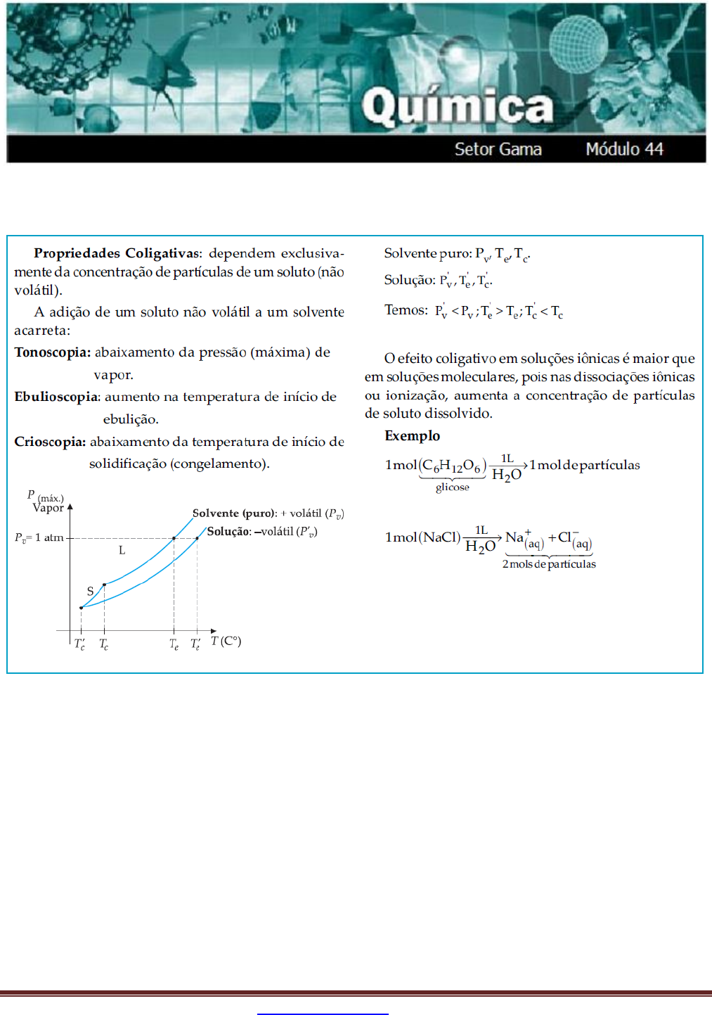 Portal de Estudos em Química (PEQ) – www.profpc.com.br Página 1 PROPRIEDADES COLIGATIVAS EXERCÍCIOS DE APLICAÇÃO 01 (FUVEST-SP) À mesma temperatura, comparando-se as propriedades da água pura e as soluções aquosas de cloreto de sódio, estas devem apresentar menor: a) pressão de vapor. b) concentração de íons. c) densidade. d) condutibilidade elétrica. e) pH. http://www.profpc.com.br/ Portal de Estudos em Química (PEQ) – www.profpc.com.br Página 2 02 A uma dada temperatura, possui a menor pressão de vapor a solução aquosa: a) 0,1 mol/L de glicose. b) 0,2 mol/L de glicose. c) 0,1 mol/L de ácido nítrico. d) 0,2 mol/L de ácido nítrico. e) 0,1 mol/L de ácido clorídrico. 03 (ITE-SP) Considere que, em determinada temperatura t, P = pressão de vapor da água pura; P1 = pressão de vapor da solução aquosa cuja concentração em relação a dado soluto é C1; P2 = pressão de vapor da solução aquosa cuja concentração em relação ao mesmo soluto é 2 C1. A essa temperatura t, tem-se: a) P1 > P2 b) P1 > P c) P = P1 = P2 d) P2 > P e) P2 > P1 04 (UFMG-MG) Estudaram-se as variações das pressões de vapor da água pura e de uma solução aquosa diluída de sacarose (açúcar de cana) em função da temperatura. O gráfico que descreve, qualitativamente, essas variações é: 05 (UFMG-MG) Qual das seguintes substâncias em solução aquosa 0,5 M apresenta a menor pressão de vapor à mesma temperatura? a) MgCℓ2 (α = 90%) b) HCℓ (α ≅ 100%) c) NaCℓ (α = 100%) d) LiOH (α ≅ 100%) e) C6H12O6 (glicose) 06 (UMESP-SP) Três copos, A, B e C, contêm a mesma quantidade de água. São dissolvidos 18,0 g de glicose, 6,0 g de ureia e 34,2 g de sacarose nos copos A, B, e C, respectivamente. A(s) solução(ões) que apresenta(m) maior pressão de vapor à mesma temperatura é (são): Dados (massas molares): glicose (C6H12O6) = 180 g/mol; ureia (CON2H4) = 60 g/mol; sacarose (C12H22O11) = 342 g/mol. a) a do copo A. b) a do copo B. c) a do copo C. d) as dos copos A e C. e) as dos copos A, B e C, pois são iguais. http://www.profpc.com.br/ Portal de Estudos em Química (PEQ) – www.profpc.com.br Página 3 07 (VUNESP-SP) Considere cinco soluções aquosas diferentes, todas de concentração 0,1 mol/L, de glicose (C6H12O6), e de quatro eletrólitos fortes, NaCℓ, KCℓ, K2SO4 e ZnSO4, respectivamente. A solução que apresenta a maior temperatura de ebulição é: a) C6H12O6 b) NaCℓ c) KCℓ d) K2SO4 e) ZnSO4 08 (UFSCar-SP) As curvas de pressão de vapor, em função da temperatura, para um solvente puro, uma solução concentrada e uma solução diluída são apresentadas na figura a seguir. Considerando que as soluções foram preparadas com o mesmo soluto não-volátil, pode-se afirmar que as curvas do solvente puro, da solução concentrada e da solução diluída são, respectivamente: a) I, II e III b) I, III e II c) II, III e I d) II, I e III e) III, II e I 09 (UNIFEI-MG) Qual dos compostos abaixo, após sua dissolução em água, causará um maior abaixamento na pressão de vapor em 1,0 L do solvente? a) 5 mols de cloreto de sódio b) 5 mols de nitrato de potássio c) 5 mols de sulfato de sódio d) 5 mols de glicose 10 (UCS-RS) Raoult relacionou suas leis coligativas: a) à condutividade elétrica das soluções. b) à ligação covalente. c) ao pH das soluções. d) à reação de redox. e) à interação soluto e solvente de uma solução. http://www.profpc.com.br/ Portal de Estudos em Química (PEQ) – www.profpc.com.br Página 4 11 (FCMSC-SP) No gráfico, as curvas referem-se a duas soluções com diferentes concentrações de um mesmo soluto em um mesmo solvente. Neste gráfico: I. a solução 2 é a mais concentrada. II. à mesma temperatura é o solvente puro que possui a menor pressão de vapor. III. à mesma pressão, as duas soluções começam a ferver à mesma temperatura. Está(ão) correta(s): a) I somente. b) I e II. c) I, II e III. d) I e III. e) II somente. 12 (UFRGS-RS) O efeito sobre a pressão de vapor causado por 0,58 g de NaCℓ dissolvido em 1,0 kg de H2O é aproximadamente o mesmo que seria obtido dissolvendo-se, nessa mesma quantidade de solvente: (Dados massas atômicas: H=1; C=12; N=14; O=16; Na=23; Cℓ=35; K=39 Br=80) a) 0,58 g de KCℓ. b) 1,80 g de C6H12O6. c) 0,58 g de NaBr. d) 1,20 g de (NH2)2CO. e) 1,06 g de Na2CO3. 13 (VUNESP-SP) A uma dada temperatura, possui a menor pressão de vapor a solução aquosa: a) 0,1 mol/L de sacarose. b) 0,2 mol/L de sacarose. c) 0,1 mol/L de ácido clorídrico. d) 0,2 mol/L de ácido clorídrico. e) 0,1 mol/L de hidróxido de sódio. 14 (MAUÁ-SP) Têm-se duas soluções aquosas de mesma concentração em mol/L; uma de BaCℓ2, que apresenta grau de dissociação aparente igual a 80%, e outra de K3[Fe(CN)6], que apresenta grau de dissociação aparente igual a 50%. Determine em qual das soluções será observado um maior abaixamento na pressão de vapor da água. http://www.profpc.com.br/ Portal de Estudos em Química (PEQ) – www.profpc.com.br Página 5 15 (UFBA-BA) Considere as seguintes soluções aquosas: A. solução 0,5 mol de C12H22O11 (sacarose) B. solução 0,5 mol de CO(NH2)2 (ureia) C. solução 1 mol de C6H12O6 (glicose) A respeito delas foram feitas as seguintes afirmações: (01) Todas apresentam a mesma pressão máxima de vapor (PV). (02) PVA = PVB ≠ PVC (04) PVA = PVB > PVC (08) PVA = PVB < PVC (16) PVA > PVB > PVC Qual é a soma das alternativas corretas? 16 (UFC-CE) Dadas as soluções aquosas de mesma concentração molar: I. BaCℓ2 II. CaCℓ2 III. NH4NO3 IV. K2SO4 V. Aℓ(NO3)3 As soluções que apresentam menor e maior pressão de vapor são, respectivamente: a) I e II. b) III e IV. c) III e V. d) V e III. 17 (FUVEST-SP) Duas soluções aquosas, uma de glicose e outra de sacarose, contêm a mesma massa, em gramas, de soluto por litro de solução. a) Comparar os valores dos pontos de congelação dessas duas soluções com o da água pura. b) Qual das duas soluções