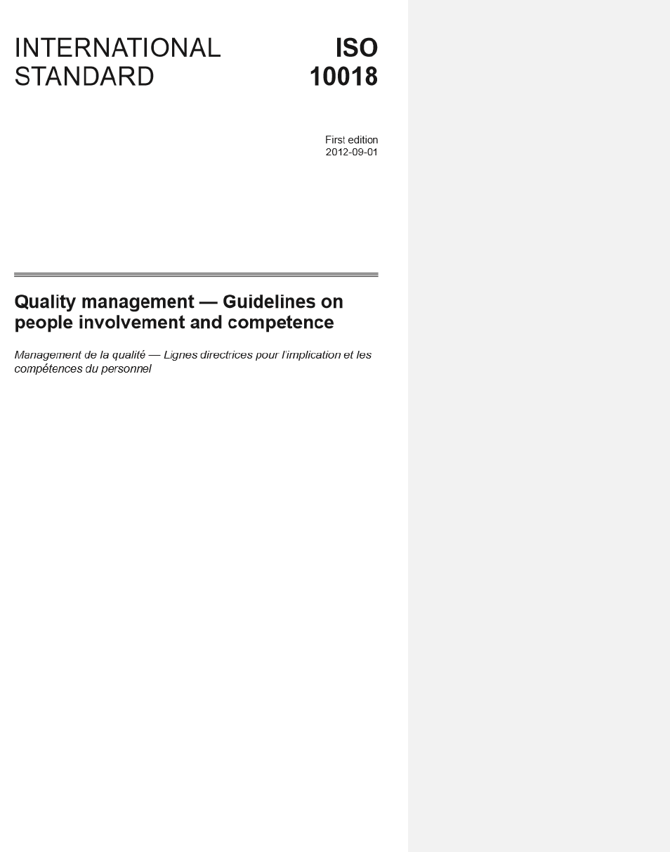 Prefácio A ISO (Organização Internacional de Normalização) é uma federação mundial de organismos nacionais de normalização (organismos membros da ISO). O trabalho de preparação de Normas Internacionais é normalmente realizado por meio de comitês técnicos da ISO. Cada órgão membro interessado em um assunto para o qual um comitê técnico tenha sido estabelecido tem o direito de ser representado nesse comitê. Organizações internacionais, governamentais e não-governamentais, em articulação com a ISO, também participam do trabalho. A ISO colabora estreitamente com a Comissão Eletrotécnica Internacional (IEC) em todos os assuntos de padronização eletrotécnica. As Normas Internacionais são elaboradas de acordo com as regras dadas nas Diretrizes da ISO / IEC, Parte 2. A principal tarefa dos comitês técnicos é preparar Padrões Internacionais. As normas internacionais adotadas pelos comitês técnicos são distribuídas aos órgãos membros para votação. A publicação como uma norma internacional requer a aprovação de pelo menos 75% dos órgãos membros que votam. Chama-se a atenção para a possibilidade de que alguns dos elementos deste documento possam ser objeto de direitos de patente. A ISO não será responsável por identificar qualquer ou todos os direitos de patente. A ISO 10018 foi preparada pelo Comitê Técnico ISO / TC 176, Gestão da Qualidade e Garantia de Qualidade, Subcomitê SC 3, Tecnologias de Suporte. Introdução Geral O desempenho geral de um sistema de gestão da qualidade e seus processos depende, em última instância, do envolvimento de pessoas competentes e da sua correta introdução e integração na organização. O envolvimento das pessoas é importante para que o sistema de gestão da qualidade de uma organização atinja resultados consistentes e alinhados com suas estratégias e valores. É fundamental identificar, desenvolver e avaliar o conhecimento, as habilidades, o comportamento e o ambiente de trabalho necessários para o envolvimento efetivo das pessoas com a competência necessária. Esta Norma Internacional fornece diretrizes para fatores humanos que influenciam o envolvimento e a competência das pessoas e cria valor que ajuda a alcançar os objetivos da organização. Relacionamento com sistemas de gestão da qualidade Os padrões do sistema de gestão da qualidade desenvolvidos pela ISO / TC 176 são baseados nos princípios de gestão da qualidade descritos na ISO 9000. A correlação entre esta Norma ea ISO 9001 facilita o envolvimento e competência das pessoas no sistema de gestão da qualidade. No entanto, esta Norma Internacional também pode ser usada com outros sistemas de gerenciamento. Abordagem baseada em processos para envolvimento e competência de pessoas Esta Norma é baseada em uma abordagem estratégica baseada em processos (ver Figura 1) para desenvolver o envolvimento e a competência de pessoas em todos os níveis da organização. O modelo de processo (veja a Figura 2) ilustra ações táticas, resultados e planos para envolvimento e competência das pessoas. Se o envolvimento e a competência das pessoas são monitorados, medidos e analisados dentro do sistema de gestão da qualidade, isso produz resultados que permitem à alta direção tomar decisões de melhoria, levando a níveis aprimorados de satisfação do cliente. 0.4 O uso desta Cláusula Internacional Clausula 4 descreve os processos que uma organização pode usar para implementar e manter o envolvimento e a competência das pessoas nos sistemas de gestão da qualidade. Os fatores descritos em 4.6 fornecem ações que podem ser tomadas para fortalecer o envolvimento das pessoas. As diretrizes nas Cláusulas 5 a 8 fornecem as ações específicas que podem ser tomadas para atender aos requisitos individuais do sistema de gestão da qualidade, como aqueles especificados na ISO 9001. Esta Norma fornece orientação a líderes, gerentes, supervisores, profissionais da qualidade, representantes da gestão da qualidade e gestores de recursos humanos. Gestão da Qualidade - Diretrizes para o envolvimento e competência das pessoas 1 Escopo Esta Norma Internacional fornece orientação sobre como envolver as pessoas no sistema de gestão de qualidade de uma organização e sobre como melhorar o seu envolvimento e competência dentro dela. Esta Norma Internacional é aplicável a qualquer organização, independentemente do tamanho, tipo ou atividade. 2 Referências normativas Os seguintes documentos referenciados são indispensáveis para a aplicação deste documento. Para referências datadas, somente a edição citada se aplica. Para referências sem data, aplica-se a última edição do documento referenciado (incluindo quaisquer alterações). ISO 9000, Sistemas de gestão da qualidade - Fundamentos e vocabulário 3 Termos e definições Para os propósitos deste documento, aplicam-se os termos e definições apresentados na ISO 9000 e os seguintes. 3.1 Competência para aplicar conhecimentos e habilidades para alcançar os resultados pretendidos NOTA 1 A aplicação contínua de competência pode ser afetada pelo ambiente de trabalho com todas as suas variações, pressões, relacionamentos e conflitos que podem afetar, por exemplo, a atitude e o compromisso de aplicar os conhecimentos e habilidades relevantes. NOTA 2 Os requisitos de competência são mais do que qualificações acadêmicas, treinamento e experiência. Eles definem os resultados ou resultados a serem alcançados para um determinado trabalho, os critérios de desempenho ou padrões a serem alcançados, as evidências necessárias e o método para obtê-lo. NOTA 3 As competências referenciadas nesta Norma aplicam-se tanto às pessoas dentro de uma organização como às terceirizadas. 3.2 Aquisição de competências Processo para assegurar que a competência (3.1) seja alcançada por uma pessoa, um grupo de pessoas ou uma organização. NOTA Para assegurar que as