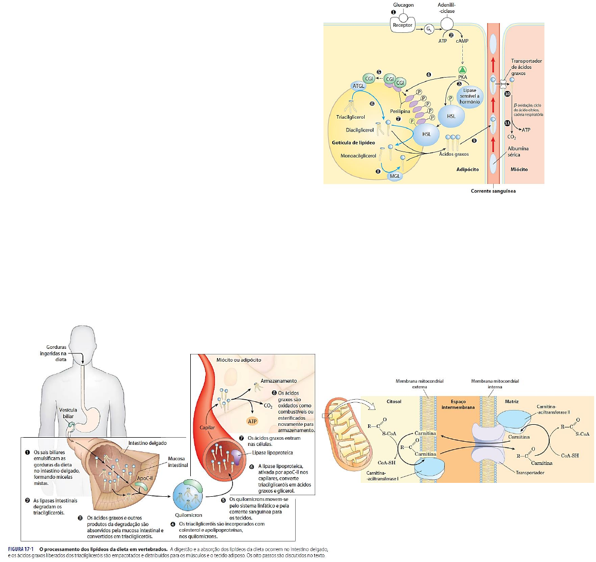 Metabolismo e bioenergética iv Catabolismo de ácidos graxos Digestão, mobilização e transporte de gorduras As células podem obter lipídios de três formas: os consumidos na dieta, os armazenados e os produzidos no próprio organismo. Lipídios consumidos na dieta Há a necessidade de conversão de gordura macroscópica em micelas microscópicas para que haja a absorção. Quando absorvida pelo organismo, a gordura consumida é emulsificada pelos sais biliares (anfipáticos) no intestino delgado. Compostos anfipáticos convertem a gordura em micelas mistas de sais e triacilgliceróis (1). As lipases intestinais degradam essas micelas de triacilglicerol, em compostos menores (mono e diacilglicerol) (2). O produto dessa degradação consegue ser absorvido pelas células epiteliais do intestino, que os converte novamente em triacilglicerol (3). Os triacilgliceróis são incorporados a lipoproteínas, chamadas de quilomícrons (4), e transportados pela linfa. Entrando na corrente sanguínea para os tecidos-alvo (músculo e tecido adiposo) (5). Nos capilares desses tecidos, o quilomícron é clivado pela lipase lipoproteica, e ela hidrolisa os triacilglicerol em ácidos graxos e glicerol (6). Após a hidrolise, as moléculas são absorvidas (7). Permanece nesses tecidos até ser necessário: atividade física (pelo coração) e jejum (ativado pelo glucagon). Hormônios ativam a mobilização dos ácidos graxos Os lipídios são armazenados nos adipócitos como gotículas. A perilipina recobre a superfície das gotículas para impedir que elas sejam metabolizadas por ação de um hormônio. Glucagon e adrenalina possuem um mensageiro em comum (cAMP), estimulando a metabolização do lipídio. O mensageiro produz a pKa que leva lipases sensíveis a hormônios e a perilipina abrindo-a. As lipases sensíveis a hormônios ativam o HSL que degradam em o triacilglicerol em ácidos graxos. Esses se ligam a albumina e conseguem ser transportados pelo sangue para o miócito. Destino do glicerol Fosforilado pela glicerol-cinase, a glicerol-3- fosfato é oxidada a di-hidroxiacetona. Fazendo parte da glicólise na fase de pagamento. Ciclo da carnitina A primeira reação é a sintetização do acil-CoA graxo, logo após o acil-CoA graxo é esterificado e transesterificado (mesclado) a acil-carnitina. Passa pela membrana, através da porina, e regenera a acil-CoA graxo na matriz mitocondrial. Oxidação de ácidos graxos Na primeira etapa da β-oxidação libera compostos de dois em dois C na forma do acetil-coA. Na segunda etapa, o grupo acetil é oxidado a CO2, também ocorrendo na matriz. A terceira etapa é a cadeia respiratória por meio dos transportadores de ē reduzidos. B-Oxidação Composta de 4 etapas: 1. Desidrogenação Transferência de elétrons ao FAD; 2. Hidratação Forma um estereoisômero L; 3. Desidrogenação Transferência de elétrons ao NAD+; 4. Clivagem (Tiólise) Separação dos dois últimos carbonos pela adição de CoA, liberando-os na forma de acetil-coA. Oxidação de ácidos graxo insaturados As partes não insaturadas sofrem β-oxidação, a parte insaturada deve sofrer uma isomerização de cis para trans. E então a β-oxidação ocorre normalmente. Oxidação de ácidos graxos ímpares Na última etapa ao invés de liberar dois acetis-coA, libera um propionil- coA(3C) e um acetil-coA. O propionil carboxila por meio do bicarbonato, e é fosforilado. Depois epimerisa mudando de D para L. O produto é o succinil- coA (ciclo do ácido cítrico). Regulação É regulada para ocorrer em casos de necessidade de energia. Um dos pontos de regulação é no ciclo da carnitina. Carboidratos quando digeridos, transformam-se em glicose, a insulina ativa a ACC, que inibe a β-oxidação e estimula a biossíntese de lipídios. E que converte o acetil-CoA em malonil- CoA. O malonil-CoA inibe a b-oxidação ao inibir a enzima que forma a acil-carnitina. Impedindo assim a b-oxidação. O processo contrário é realizado pelo Glucagon, ele inativa a ACC, mantendo baixa a concentração de malonil-CoA. A baixa concentração diminuindo a inibição da enzima que transfere a acil-carnitina. Corpos cetônicos Derivados do acetil-coA. Utilizados em tecidos como fonte de energia, e produzido no fígado. Cetogênese Inicia com o acetil coA proveniente da β-oxidação. Condensa 2 acetis-CoA. Essa molécula então se condensa novamente com acetil-CoA, liberando o CoA. E o acetoacetato pode gerar mais 2 corpos cetônicos, a depender da ação de enzimas. D-B-Hidroxibutirato A mesma enzima que o forma, gera acetoacetato ao transferir 2 ē. Depois recebe coA e forma dois acetis. Jejum e diabetes Geram a produção de corpos cetônicos. No jejum, o acetil-CoA é usado para produzir corpos cetônicos, já na diabetes não há a captação de glicose.