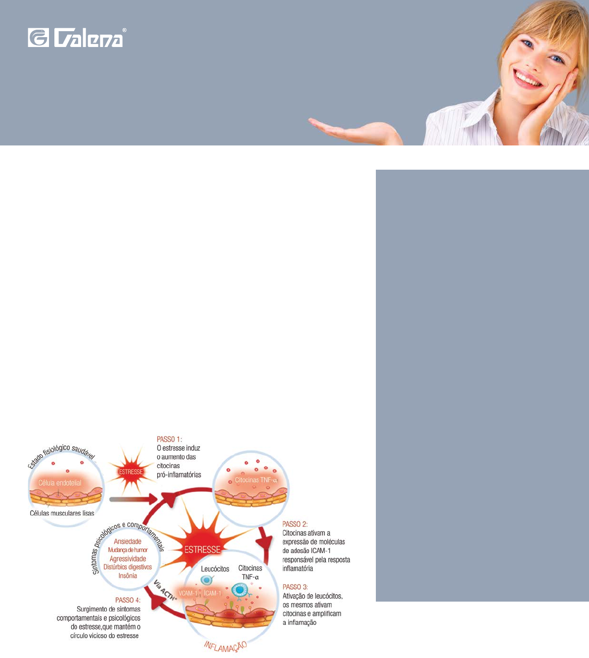 Serenzo™ Auxilia na diminuição dos fatores negativos induzidos pelo estresse Ajuda a reduzir os marcadores inflamatórios e modula o cortisol devolvendo o equilíbrio emocional A relação entre estresse e problemas de saúde tem sido comprovada em vários estudos. O estresse induz o aumento dos marcadores inflamatórios, que também estão aumentados em pacientes com sobrepeso, esta condição favorece um estado inflamatório de baixa intensidade, que quando associados promovem alteração do cortisol podendo levar a disfunções fisiológicas, psicológicas e comportamentais. Considerando esses fatores, a Nexira Health desenvolveu o Serenzo™, ingrediente natural e inovador obtido do Citrus sinensis que auxilia no controle da inflamação associada ao estresse. Serenzo™ auxilia na redução da ansiedade e na diminuição da compulsão alimentar, proporcionando controle do peso corporal. MecaniSMoS de ação Serenzo™ age de forma eficaz auxiliando na: • Redução dos fatores inflamatórios induzidos pelo estresse através da inibição da expressão de ICAM-1. • Diminuição dos sintomas gerados pelo estresse, como ansiedade, irritabilidade, mudanças do humor, agressividade, desordens gástricas, distúrbios de sono e dores musculares (Esch, et al., 2002; Plante, 2002). Nome Científico Dose Usual Atributos do produto • Ativo de origem natural que contém D-limoneno obtido a partir do Citrus sinensis • Certificado ECOCERT e KOSHER • Contribui para reduzir os marcadores inflamatórios associado ao sobrepeso, como TNF-α (Fator de necrose tumoral), I-CAM (molécula intercelular de adesão) e V-CAM (molécula de adesão celular vascular) • Auxilia na diminuição da compulsão alimentar associada à ansiedade • Ajuda a controlar as alterações comportamentais como irritabilidade, alterações de humor e sono • Contribui para diminui os efeitos prejudiciais do estresse • Coadjuvante na modulação do cortisol Citrus sinensis extract 500 mg Mecanismo de ação do Serenzo™ no ciclo vicioso do estresse eFicÁcia do SeRenZo™ Estudo IN VITRO Efeito na redução da inflamação induzida pelo estresse Estudo para avaliar o efeito do Serenzo™ na expressão das ICAM-1, que estão amplamente envolvidas no processo inflamatório. Estudo IN VIVO Efeito na redução dos sintomas e mudanças de humor induzidos pelo estresse Estudo para avaliar as funções motoras e a modulação do humor após 180 minutos da administração do Serenzo™. Efeito do Serenzo™ no alívio do estresse em humanos Estudo para avaliar o alívio do estresse crônico em 40 voluntários através de questionário normativo do estresse: Symptom-Checklist-90-R (SCL – 90 – R). RESULTADO Serenzo™ ajudou a inibir em 58% a expressão de ICAM-1, reduzindo os fatores inflamatórios e contribuindo para limitar a resposta ao estresse. RESULTADO Serenzo™ auxilia na redução dos sintomas comportamentais relaciona- dos ao estresse, proporcionando melhora do bem-estar. RESULTADO Serenzo™ ajuda a reduzir a somatização, sensibilidade interpessoal e ansiedade. Sugestões de Fórmulas uso IN - 58% Serenzo™ 0 60 % d a ex pr es sã o de IC AM -1 Controle 20 40 100 80 80% 60% 40% 20% 0 50% 100% 150% 200% Nervosismo - 67% Resposta à dor Curiosidade 144% 37% - 50% Atividade espontânea Efeito de Serenzo™ na inibição da expressão de ICAM-1 Resultados do questionário Symptom-Checklist-90-R Itens selecionados e avaliadosAvaliação do efeito antiestresse de Serenzo™ Ín di ce d e Gr av id ad e Gl ob al p< 0. 00 1 -53% TO 6 semanas 12 semanas 0,8 0,6 0,4 0,2 0 1 1,2 Somatização Sensibilidade Interpessoal Ansiedade TO 6 semanas 12 semanas 0,8 0,6 0,4 0,2 0 1 1,2 colabora para redução dos marcadores inflamatórios, associados ao estresse Serenzo™..........................................................................250 mg Administrar 1 dose pela manhã e à noite. Modulação do cortisol e redução da inflamação, compulsão por doces e carboidratos Serenzo™..........................................................................250 mg Saffrin®...................................................................................90 mg Rhodiola rosea.......................................................................100 mg Fosfatidilserina......................................................................100 mg Administrar 1 dose pela manhã e 1 dose no final do dia. auxilia no controle da ansiedade e modulação do cortisol Serenzo™..........................................................................250 mg Saffrin................................................................................88,25 mg Administrar 1 dose pela manhã e à noite. Referências bibliográficas Literatura do fornecedor Nexira (França) Esch T et al. Proinflammation: a common denominator or initiator of different pathophysiological disease processes. Med Sci Monit. 2002 May;8(5):HY1-9. Plante GF. Vascular response to stress in health and disease. Metabolism. 2002 Jun;51 (6 Suppl 1): 25-30. Produzido na França desenvolvido por Magistral 0800 142 700 • 0800 701 4311 vendas@galena.com.br industrial 0800 144 150 industrial@galena.com.br exclusividade