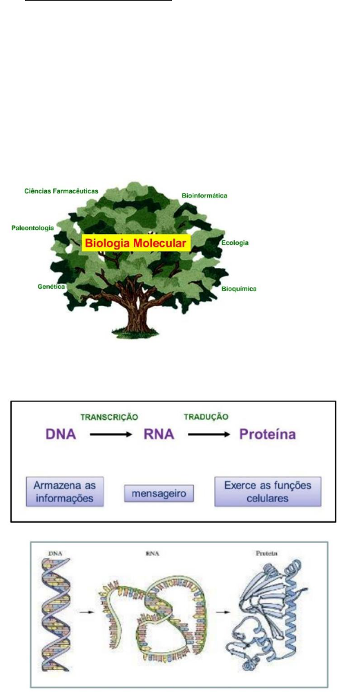 14/08 - AULA 01 – BIOLOGIA MOLECULAR – INTRODUÇÃO INTRODUÇÃO · A biologia molecular é a área da biologia que busca estudar os organismos do ponto de vista molecular, focando principalmente na base de todos os organismos, os ácidos nucleicos, que formam RNAs e DNAs que posteriormente dão origem às proteínas; · Ciência multidisciplinar: Nascida da junção dos ramos da genética, da bioquímica, da biologia celular entre outras áreas, a biologia molecular é um campo que visa entender os fenômenos biológicos e como estes se relacionam com o material genético do organismo. Mais especificamente, ela estuda os processos de replicação, transcrição e tradução do material genético e a regulação destes processos. DOGMA CENTRAL DA BIOLOGIA MOLECULAR ==> Fluxo da informação genética. · O dogma central da Biologia Molecular, proposto por Francis Crick em 1958, consiste em explicar como as informações contidas no DNA são transmitidas. Em síntese, ele explica que o fluxo das informações genéticas ocorre na seguinte sequência: DNA → RNA→ PROTEÍNAS. · Isso significa que o DNA promove a produção de RNA (Transcrição), o qual por sua vez codifica a produção de proteínas (Tradução). No momento da descoberta, acreditava-se que esse fluxo não poderia ser invertido. Hoje, sabe-se que a enzima transcriptase reversa é capaz de sintetizar DNA a partir do RNA. HISTÓRICO · A história da Biologia Molecular começa a ter início com a suspeita de algum tipo de material presente no núcleo celular. · Os ácidos nucleicos foram descobertos em 1869, pelo pesquisador Johann Friedrich Miescher ao analisar o núcleo de glóbulos brancos do pus de feridas. Porém, eles foram inicialmente denominados de nucleínas. · Os glóbulos brancos eram um bom material pois são células que apresentam núcleos grandes e fáceis de serem isolados do citoplasma. Além disso, o pus era muito fácil de se conseguir na época em ataduras usadas em ferimentos. Miescher descobriu a presença de um composto de natureza ácida que era desconhecido até o momento. Esse composto era rico em fósforo e em nitrogênio, era desprovido de enxofre e resistente à ação da pepsina (enzima proteolítica). HISTÓRICO - O DNA COMO MOLÉCULA DA HEREDITARIEDADE: EVIDÊNCIAS EXPERIMENTAIS · O trabalho de Gregor Mendel mostrou que características (como a coloração da flor em plantas de ervilha) não eram herdadas diretamente, mas ao invés, eram especificadas por genes que passam dos pais para a prole. O trabalho de outros cientistas por volta do século 20, incluindo Theodor Boveri, Walter Sutton e Thomas Hunt Morgan, estabeleceram que os fatores hereditários de Mendel eram, provavelmente, transmitidos pelos cromossomos. · Cientistas inicialmente pensaram que as proteínas, que são encontradas em cromossomos ao longo do DNA, seriam as componentes do tão procurado material genético. Proteínas eram conhecidas por suas sequências diversas de aminoácidos, enquanto se pensava que o DNA era um polímero entediante e repetitivo, devido, em parte, a um modelo incorreto (mas popular) de sua estrutura e composição. · Hoje, sabemos que o DNA na verdade não é repetitivo e pode carregar grandes quantidades de informação, como discutido mais profundamente no artigo sobre a descoberta da estrutura do DNA. Mas como os cientistas inicialmente perceberam que o "entediante" DNA talvez pudesse ser o material genético? I. FREDERICK GRIFFITH - Transformação bacteriana (1928) · Em 1928, o bacteriologista britânico Frederick Griffith conduziu uma série de experimentos usando a bactéria Streptococcus pneumoniae e ratos. Griffith não estava tentando identificar o material genético, mas, sim, criar uma vacina contra a pneumonia. Em seus experimentos, Griffith usou duas cepas relacionadas de bactéria, conhecidas como R e S. Cepa R --> Quando cultivadas em placa de Petri, a bactéria R forma colônias ou aglomerados de bactérias relacionadas, que têm bordas bem definidas e aparência rugosa (daí a sigla "R"). As bactérias R são avirulentas, significando que não causam doenças quando injetadas em ratos. Cepa S --> A bactéria S formou colônias arredondadas e suaves (daí a sigla "S"). A aparência suave se dá por conta de um polissacarídeo ou uma capa a base de açúcar produzida pela bactéria. Essa capa protegeu a bactéria S do sistema imune do rato, fazendo-as virulentos (capazes de causar doenças). Ratos em que foram injetadas bactérias S vivas desenvolveram pneumonia e morreram. · Como parte de seus experimentos, Griffith tentou injetar ratos com bactérias S mortas por calor (isso é, bactérias que haviam sido aquecidas a altas temperaturas, causando a morte das células). Sem surpresas, a bactéria S morta pelo calor não causou doença nos ratos. · Os experimentos tiveram um resultado inesperado, contudo, quando bactérias R inofensivas foram combinadas com bactérias S mortas por calor e injetadas em um rato. Não só o rato contraiu pneumonia e morreu, mas quando Griffith retirou uma amostra de sangue do rato morto, ele encontrou bactérias S vivas! · Griffith concluiu que as bactérias da cepa R teriam adquirido o que ele chamou de "princípio transformante" da bactéria S morta por calor, permitindo que elas se "transformassem" em bactérias S, tornando-se virulentas. Ou seja, cepas bacterianas não-patogênicas podem se tornar infecciosas quando misturadas com uma cepa virulenta inativada por calor. II. AVERY, MACLEOD E MCCARTY - Identificando o princípio transformante (1944) · Em 1944, três pesquisadores, canadenses e americanos, Oswald Avery, Maclyn McCarty, e Colin MacLeod, dispuseram-se a identificar o "princípio transformante" de Griffith. · Para tanto, eles começaram com grandes culturas de células S inativadas por calor e, através de uma longa série de etapas bioquímicas (determinadas por experimentação cuidadosa), purificaram progressivamente o 