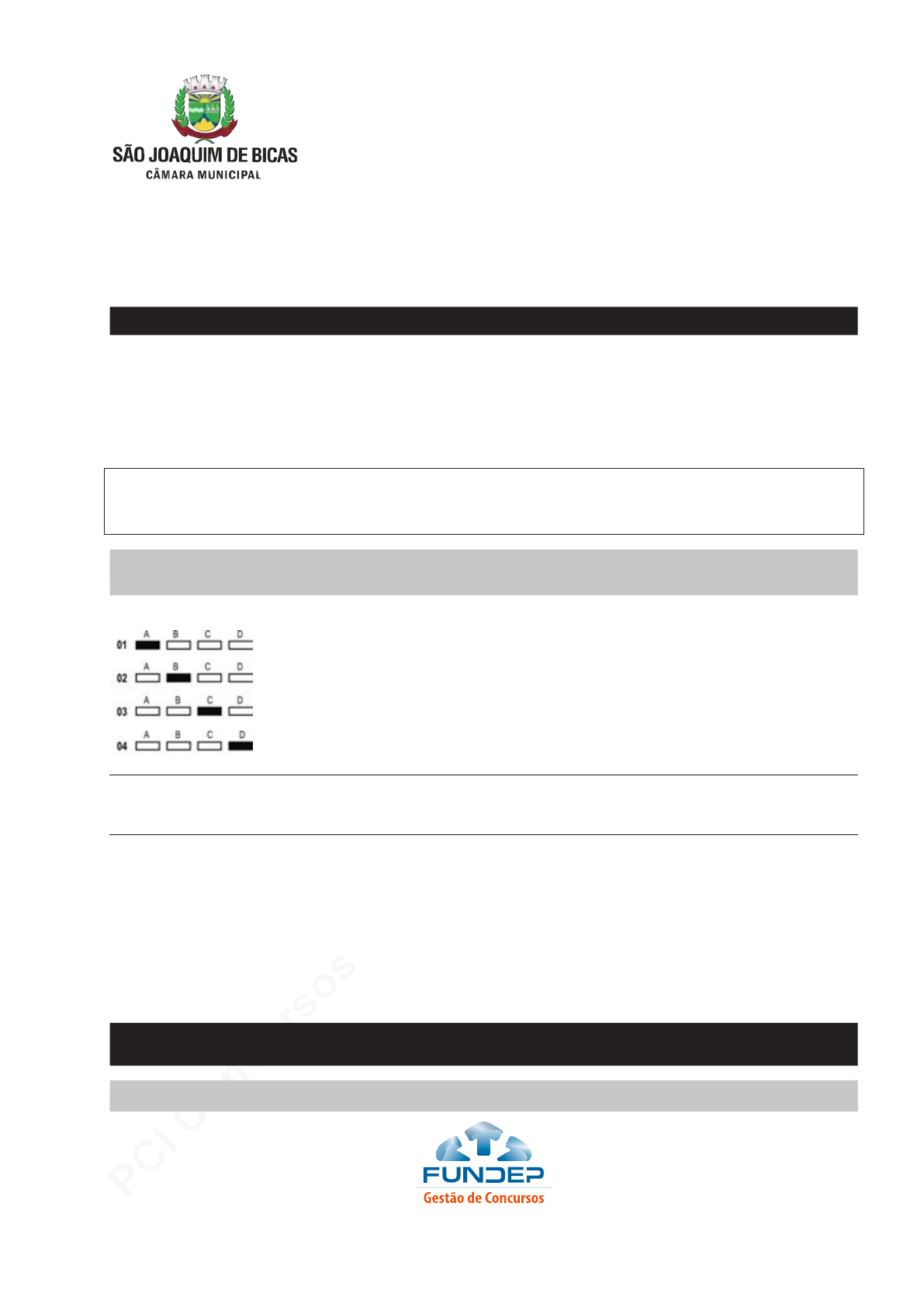 pcimarkpci MDAwMDowMDAwOjAwMDA6MDAwMDowMDAwOmZmZmY6YmFlMjpkMWVl:VGh1LCAyNCBPY3QgMjAxOSAxMToyNDozMSAtMDMwMA== CONCURSO PARA PROVIMENTO DE CARGOS DO QUADRO DE PESSOAL DA CÂMARA MUNICIPAL DE SÃO JOAQUIM DE BICAS Edital nº 01/2016 FUNDAMENTAL INCOMPLETO Códigos: 101 e 102 LEIA COM ATENÇÃO AS SEGUINTES INSTRUÇÕES 1. Este caderno contém as questões da Prova Objetiva. 2. Use o rascunho da Folha de Respostas reproduzido ao final deste caderno APENAS para marcar o Gabarito. 3. Ao receber a Folha de Respostas da Prova Objetiva: • Confira seu nome, número de inscrição e o cargo. • Assine, A TINTA, no espaço próprio indicado. 4. ATENÇÃO: transcreva no espaço apropriado da sua FOLHA DE RESPOSTAS, com sua caligrafia usual, mantendo as letras maiúsculas e minúsculas, desconsiderando aspas e autoria, a seguinte frase: “A esperança é o sonho do homem acordado.” Aristóteles ATENÇÃO: FOLHA DE RESPOSTAS SEM ASSINATURA NÃO TEM VALIDADE. 5. Ao transferir as respostas para a Folha de Respostas: • use apenas caneta esferográfica azul ou preta; • preencha, sem forçar o papel, toda a área reservada à letra correspondente à resposta solicitada em cada questão; • assinale somente uma alternativa em cada questão. Sua resposta NÃO será computada se houver marcação de mais de uma alternativa, questões não assinaladas ou rasuras. NÃO DEIXE NENHUMA QUESTÃO SEM RESPOSTA. A Folha de Respostas não deve ser dobrada, amassada ou rasurada. ATENÇÃO: Período de Sigilo – Não será permitido ao candidato se ausentar em definitivo da sala de provas antes de decorrida 1 (uma) hora do início das provas. Será proibido, durante a realização das provas, fazer uso ou portar, mesmo que desligados, telefone celular, relógios, pagers, beep, agenda eletrônica, calculadora, walkman, notebook, palmtop, gravador, transmissor/ receptor de mensagens de qualquer tipo ou qualquer outro equipamento eletrônico. Os candidatos não poderão utilizar, em hipótese alguma, lápis, lapiseira, corretivos, borracha ou outro material distinto do constante no item 9.3.11. Poderá, ainda, ser eliminado o candidato que tratar com falta de urbanidade os examinadores, auxiliares, aplicadores ou autoridades presentes. Durante o período de realização das provas, não será permitido o uso de óculos escuros, boné, chapéu, gorro, lenço ou similares. O candidato não poderá levar o seu Caderno de Questões da Prova Objetiva. Ao término do prazo estabelecido para a prova, os três últimos candidatos deverão permanecer na sala até que o último candidato termine sua prova, devendo todos assinar a Ata de Sala, atestando a idoneidade da fiscalização das provas, retirando-se da sala de prova de uma só vez. O caderno de questões e o gabarito da Prova Objetiva serão divulgados nos endereços eletrônicos <www.gestaodeconcursos.com.br> e <www.camarasaojoaquimdebicas.mg.gov.br> no dia 5 de julho de 2016. DURAÇÃO MÁXIMA DA PROVA: 4 (QUATRO) HORAS www.pciconcursos.com.br pcimarkpci MDAwMDowMDAwOjAwMDA6MDAwMDowMDAwOmZmZmY6YmFlMjpkMWVl:VGh1LCAyNCBPY3QgMjAxOSAxMToyNDozMSAtMDMwMA== ATENÇÃO Sr.(a) Candidato(a), Antes de começar a fazer a prova, confira se este caderno contém, ao todo, 30 (trinta) questões de múltipla escolha, cada uma constituída de 4 (quatro) alternativas de respostas, assim distribuídas: 10 (dez) questões de Língua Portuguesa, 10 (dez) questões de Matemática e 10 (dez) questões de Conhecimentos Gerais / Atualidades, todas perfeitamente legíveis. Havendo algum problema, informe imediatamente ao aplicador de provas para que ele tome as providências necessárias. Caso não observe essa recomendação, não lhe caberá qualquer reclamação ou recursos posteriores. www.pciconcursos.com.br pcimarkpci MDAwMDowMDAwOjAwMDA6MDAwMDowMDAwOmZmZmY6YmFlMjpkMWVl:VGh1LCAyNCBPY3QgMjAxOSAxMToyNDozMSAtMDMwMA== 3 LÍNGUA PORTUGUESA INSTRUÇÃO: Leia o texto a seguir para responder às questões 1 e 2. Disponível em: <http://migre.me/ty3Wl>. Acesso em: 18 abr. 2016. QUESTÃO 1 A partir da análise desse texto, é correto afirmar: A) À noite, a moça ainda tinha muito dinheiro. B) A moça não tinha dinheiro suficiente para pagar suas contas. C) À tarde, a moça ficou alegre por gastar seu dinheiro pagando as contas. D) A moça ficou triste por ter sobrado pouco dinheiro. QUESTÃO 2 Analise as afirmativas a seguir e assinale com V as verdadeiras e com F as falsas. ( ) A nota de dinheiro com asas, no segundo quadrinho, significa que ele está “indo embora”, que será gasto. ( ) O bolo de dinheiro e os cifrões grandes, no primeiro quadrinho, significam muito dinheiro. ( ) A moedinha e o cifrão pequeno, no terceiro quadrinho, significam pouco dinheiro. Assinale a sequência CORRETA. A) V V F B) V V V C) V F V D) F V V INSTRUÇÃO: Leia o texto a seguir para responder às questões de 3 a 10. Cochilar melhora a produtividade econômica? Sempre bate aquela preguicinha ao voltar para o trabalho após o almoço. A ciência explica: estudos mostram que a nossa energia começa a diminuir por volta de sete horas depois de termos acordado, momento do dia que coincide justamente com a volta do almoço. Aqui no Brasil costumamos tomar um cafezinho e dar continuidade às tarefas do dia. Já a Espanha lida com isso de forma diferente. O país é conhecido justamente por suas sestas, período de três horas de duração que engloba o almoço e o descanso dos trabalhadores. Isso significa que, enquanto em outros países os trabalhadores têm expedientes que vão das 9h às 18h, os espanhois entram no trabalho às 9h e saem por volta das 20h. A eficácia desse esquema tem sido colocada em cheque há um tempo. Estudos mostram que os alemães, por exemplo, trabalham menos, porém são mais produtivos que os espanhois. Por conta disso, o chefe do governo da Espanha, Mariano Rajoy, quer acabar com a tão querida sesta. Há muito o que ser considerado no que diz respeito a essa decisão. Um estudo