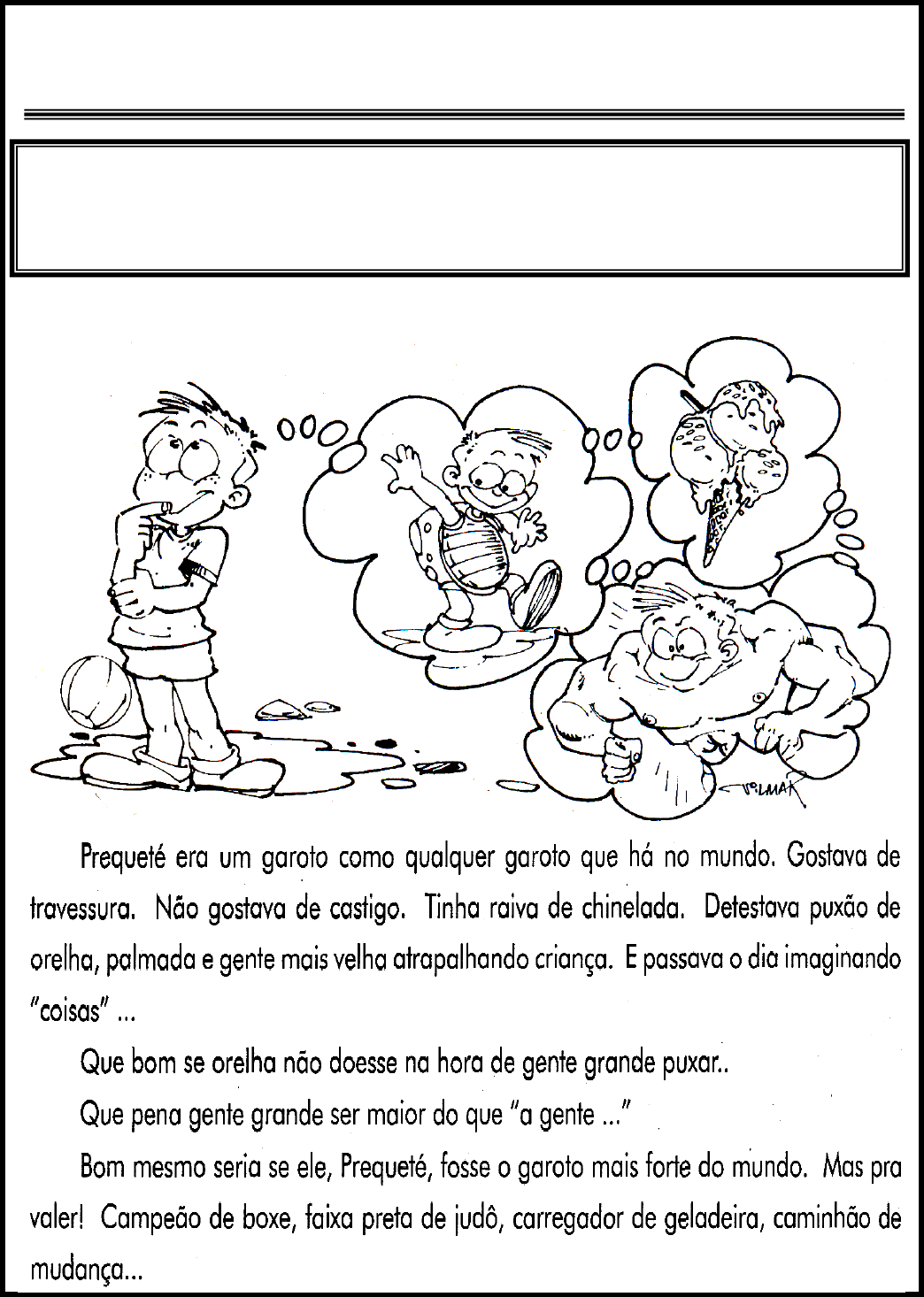 Escola Municipal Monteiro Lobato 2º Ciclo Intermediário - Português Leia o texto e conheça o Prequeté. � � “ A imaginação tem o poder de transformar todos os nossos desejos em realidade. E era isso que Prequeté fazia. Passava o dia imaginando coisas...” � � Escola Municipal Monteiro Lobato 2º Ciclo Intermediário - Português 1) De onde essa história foi tirada? Quem a escreveu? 2) Qual é o objetivo principal do autor no texto? 3) Escreva um título para a história. Justifique. 4) Quais as principais características de Prequeté? 5) O autor afirma: “Prequeté é um garoto como qualquer garoto que há no mundo.” Você concorda com essa afirmativa? Por quê? 6) Por que Prequeté queria ser o garoto mais forte do mundo? 7) Por que Prequeté levava desvantagem na hora das brigas? Quais eram as conseqüências, para ele, dessas brigas? 8) O que você considera “coisas boas da vida”? 9) Muitas coisas incomodavam Prequeté; uma delas era apanhar. E você? Quais são as coisas que mais o incomodam?